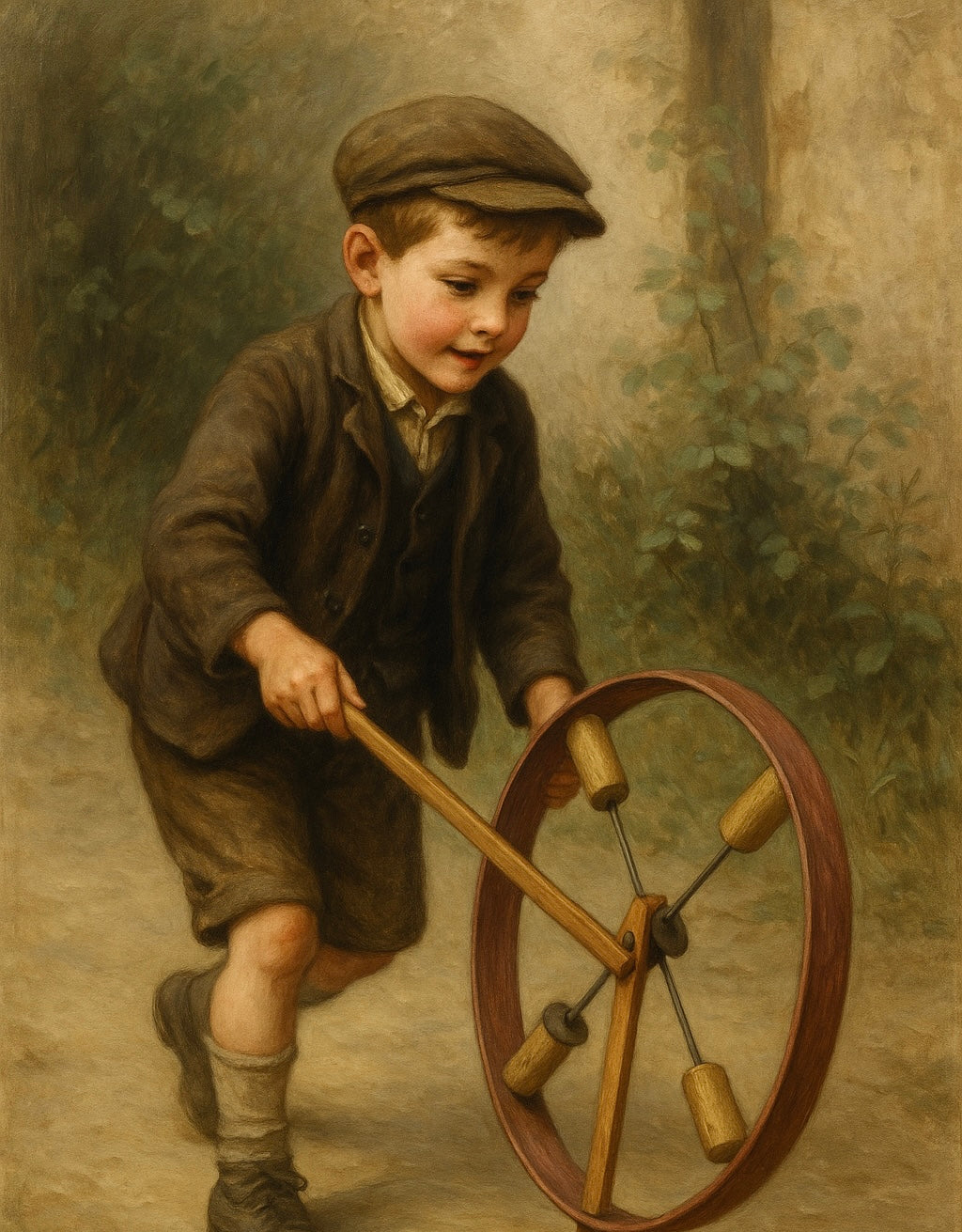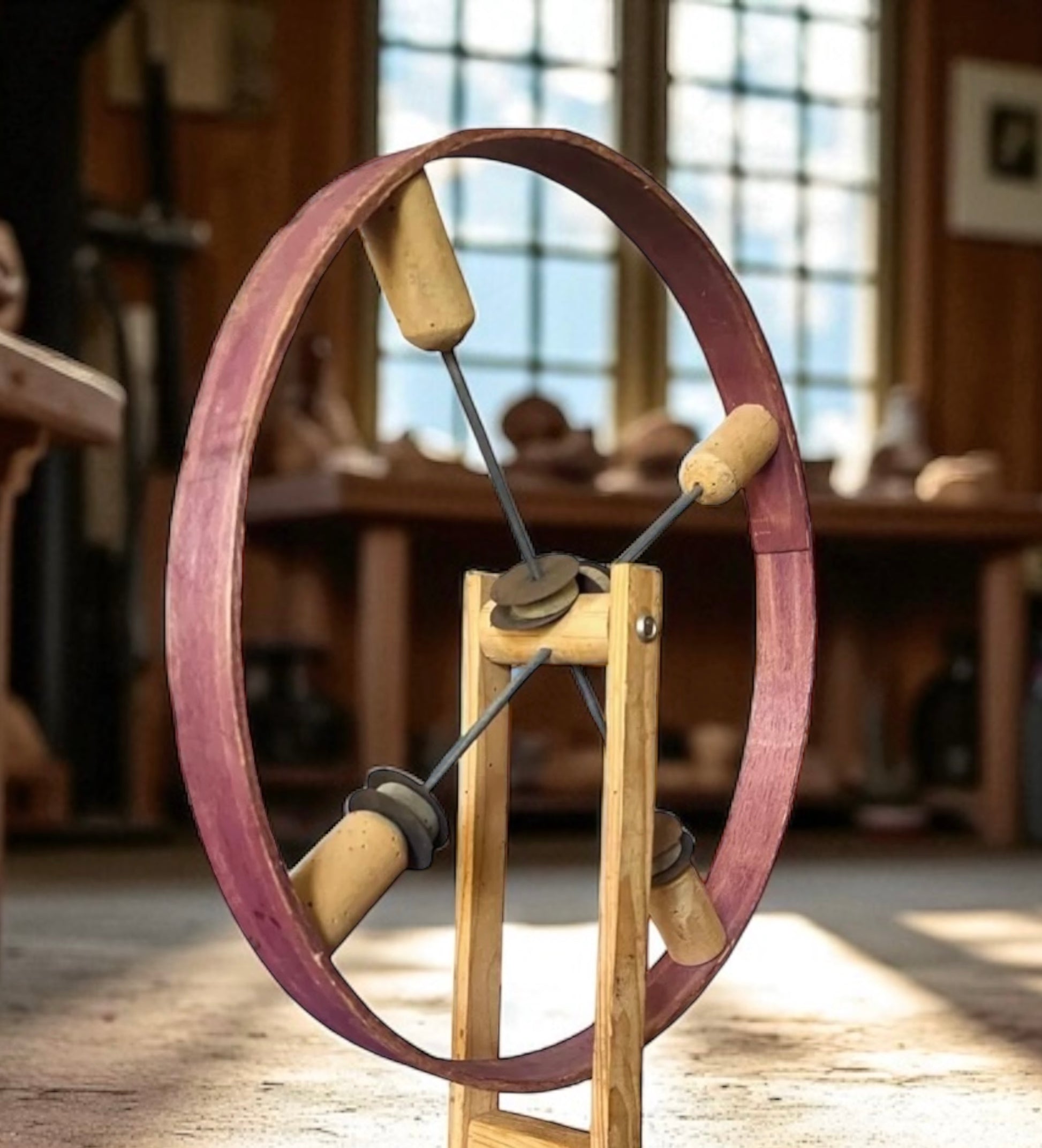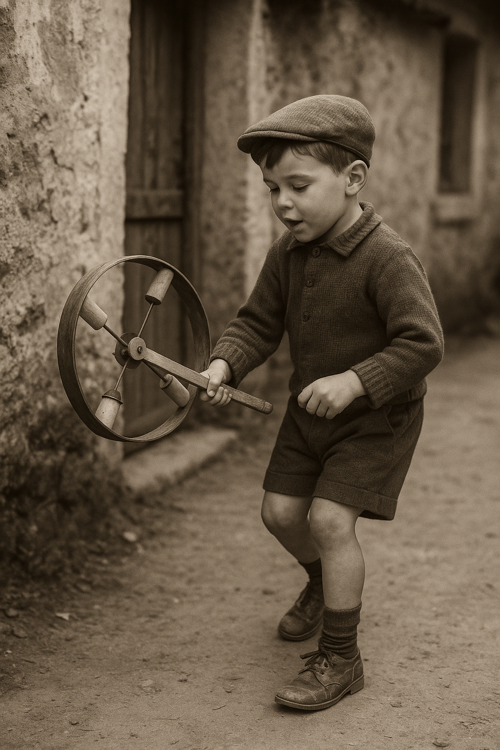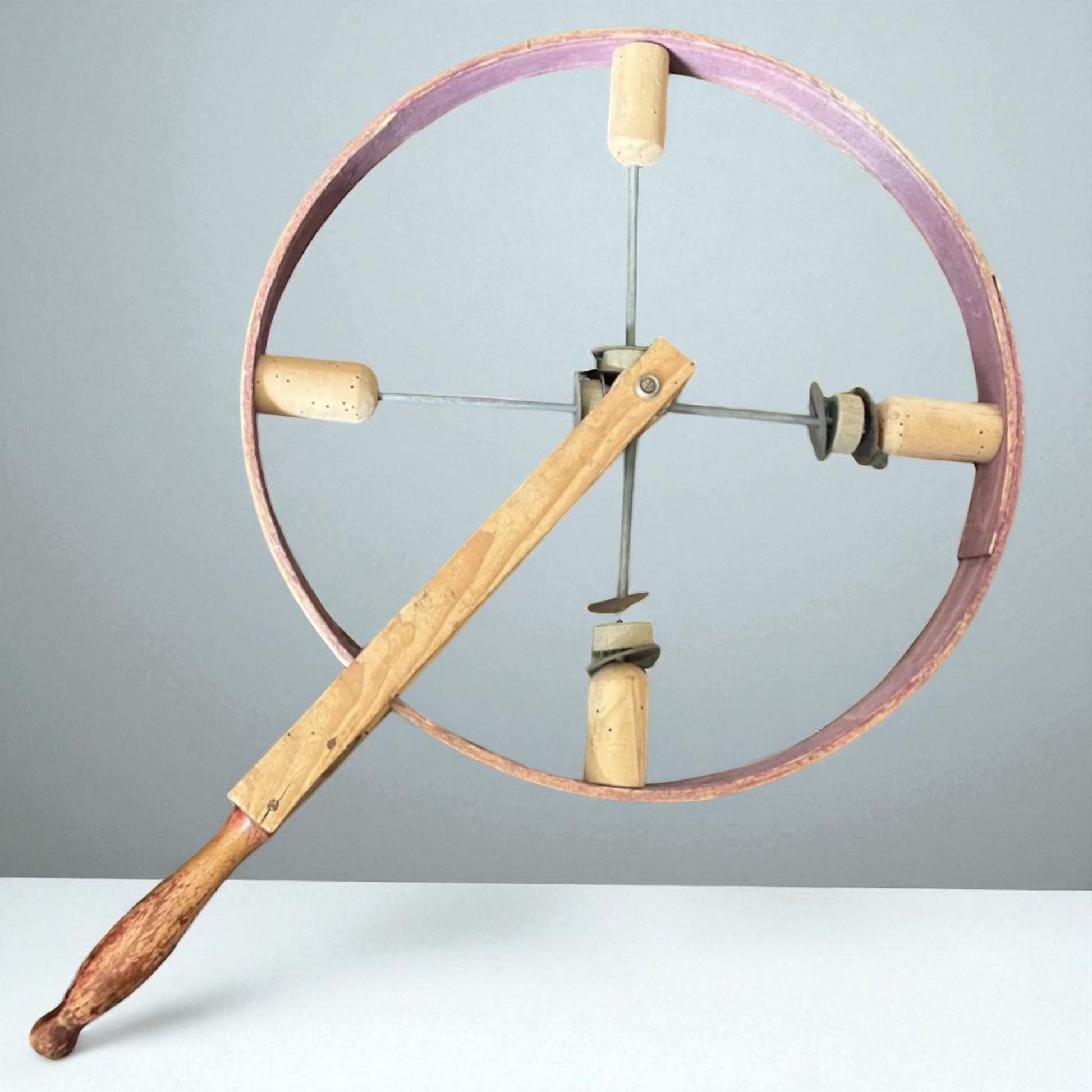 Un tempo bastava una ruota per far sorridere un bambino. Non servivano videogiochi, schermi, batterie. Solo un gesto del polso, una corsa, e il tintinnio del legno e del ferro cominciava la sua danza. Questo affascinante gioco d’infanzia di origine francese, risalente alla prima metà del Novecento, è un raro esempio di ruota sonora a percussione manuale, costruita in legno e metallo. Ruotando il manico, il movimento centrifugo attiva i quattro battenti interni che colpiscono l’anello, generando un suono ritmico e gioioso, accompagnato da piccoli dischi metallici che vibrano come sonagli. Si tratta di un gioco tanto semplice quanto geniale: uno strumento di meraviglia che stimolava la coordinazione, il ritmo e l’immaginazione, usato dai bambini nei cortili e nelle strade polverose di campagna, quando la fantasia era il motore di ogni avventura. Perfetto come oggetto da collezione, elemento decorativo o simbolo d’infanzia perduta, capace di evocare il rumore felice dei pomeriggi senza tempo. 🎁 Una piccola memoria che vibra ancora.