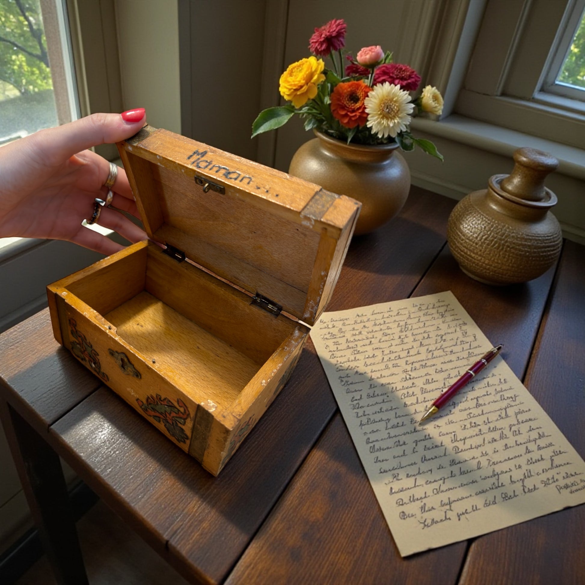 Questa piccola scatola in legno sembra aver attraversato due vite. La prima, silenziosa, nel 1900: un oggetto semplice, funzionale, forse destinato a contenere lettere, fili, piccoli segreti quotidiani. La seconda, più tenera: qualcuno, nel 1920 o 1930, ha sentito il bisogno di renderla unica. Le decorazioni sono incise a pirografo e poi colorate a mano (la pigmentazione testimonia gli anni), con un gesto lento, non professionale ma affettuoso. I motivi floreali non cercano simmetria: cercano presenza. E poi quella parola, scritta sul fronte del coperchio: “Maman…”