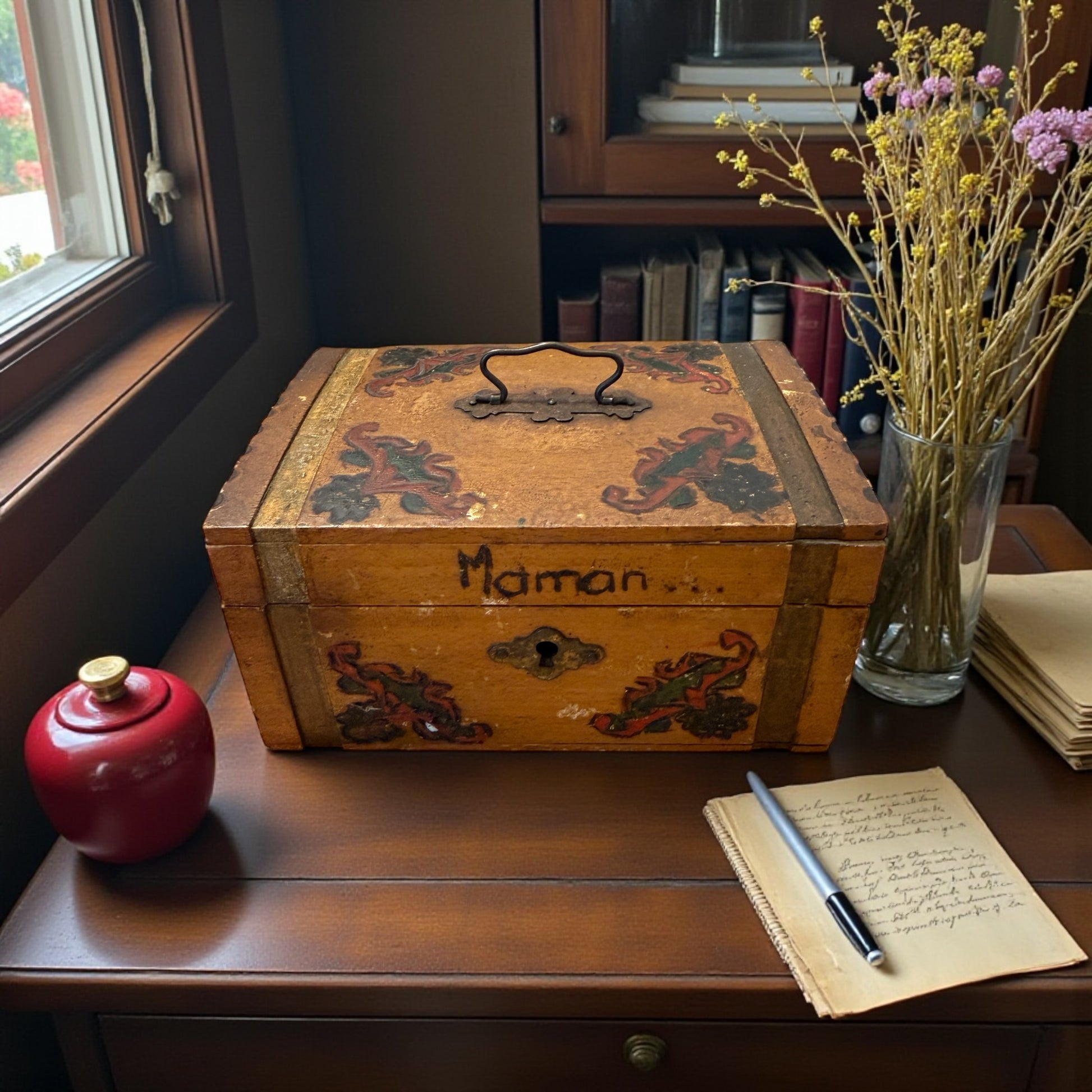 Antica scatola cofanetto francese, decorato negli anni ‘30 ca, scritta “Maman”