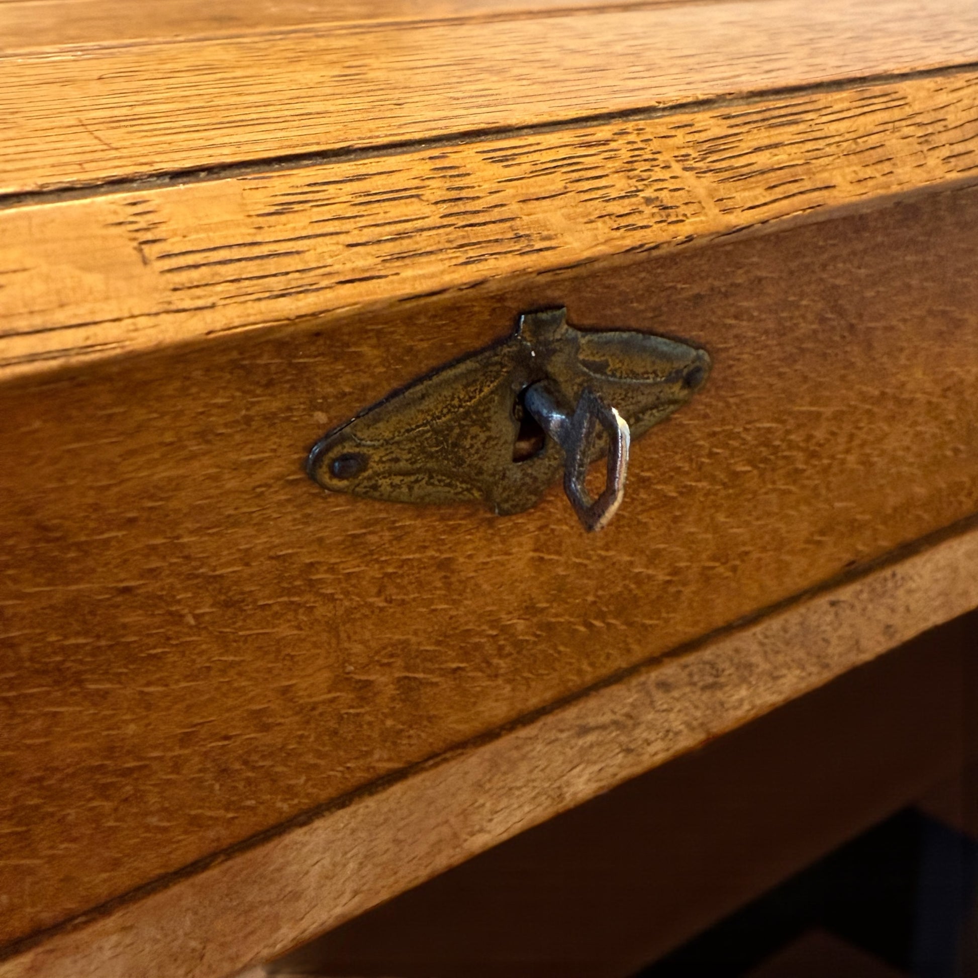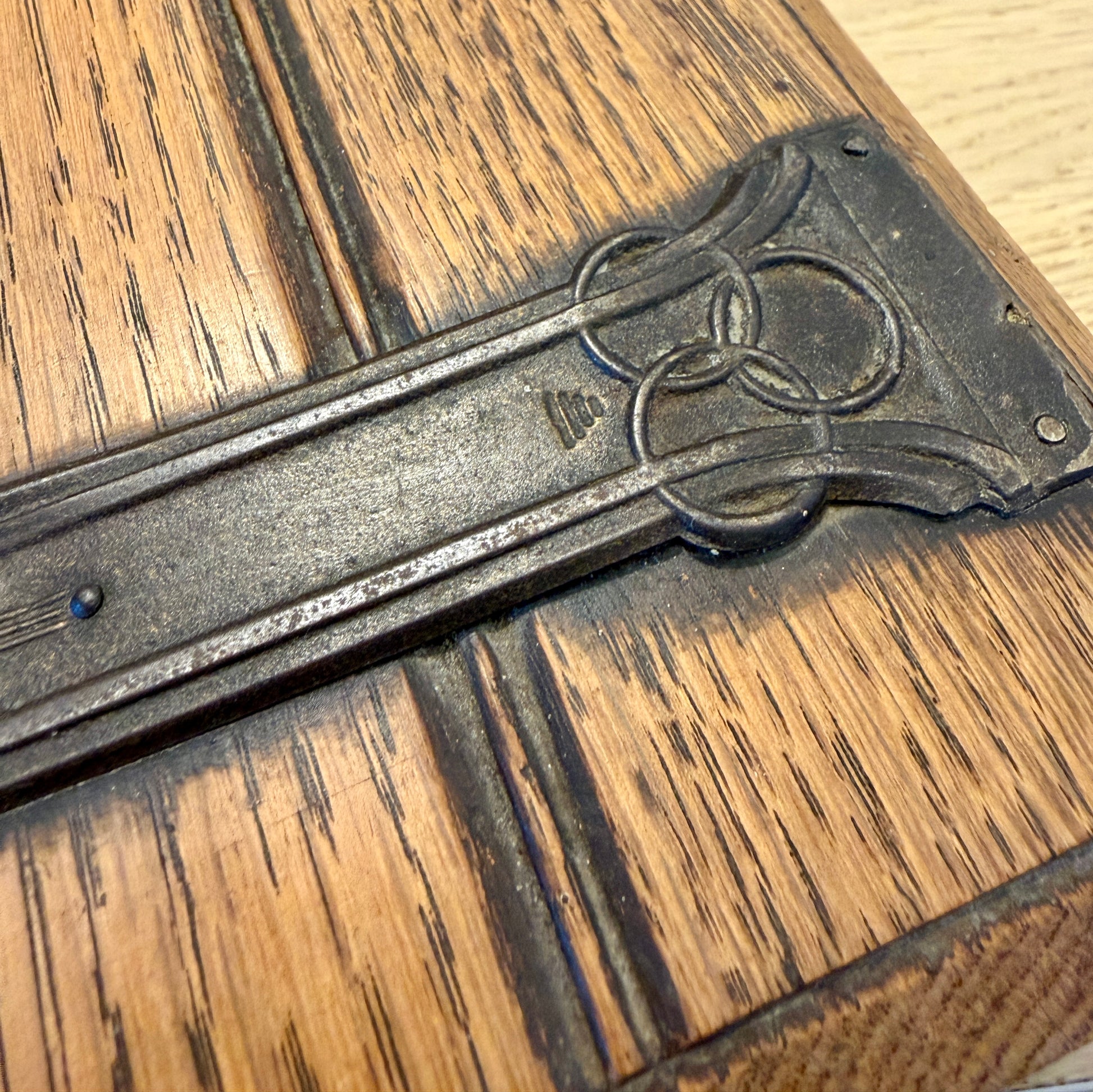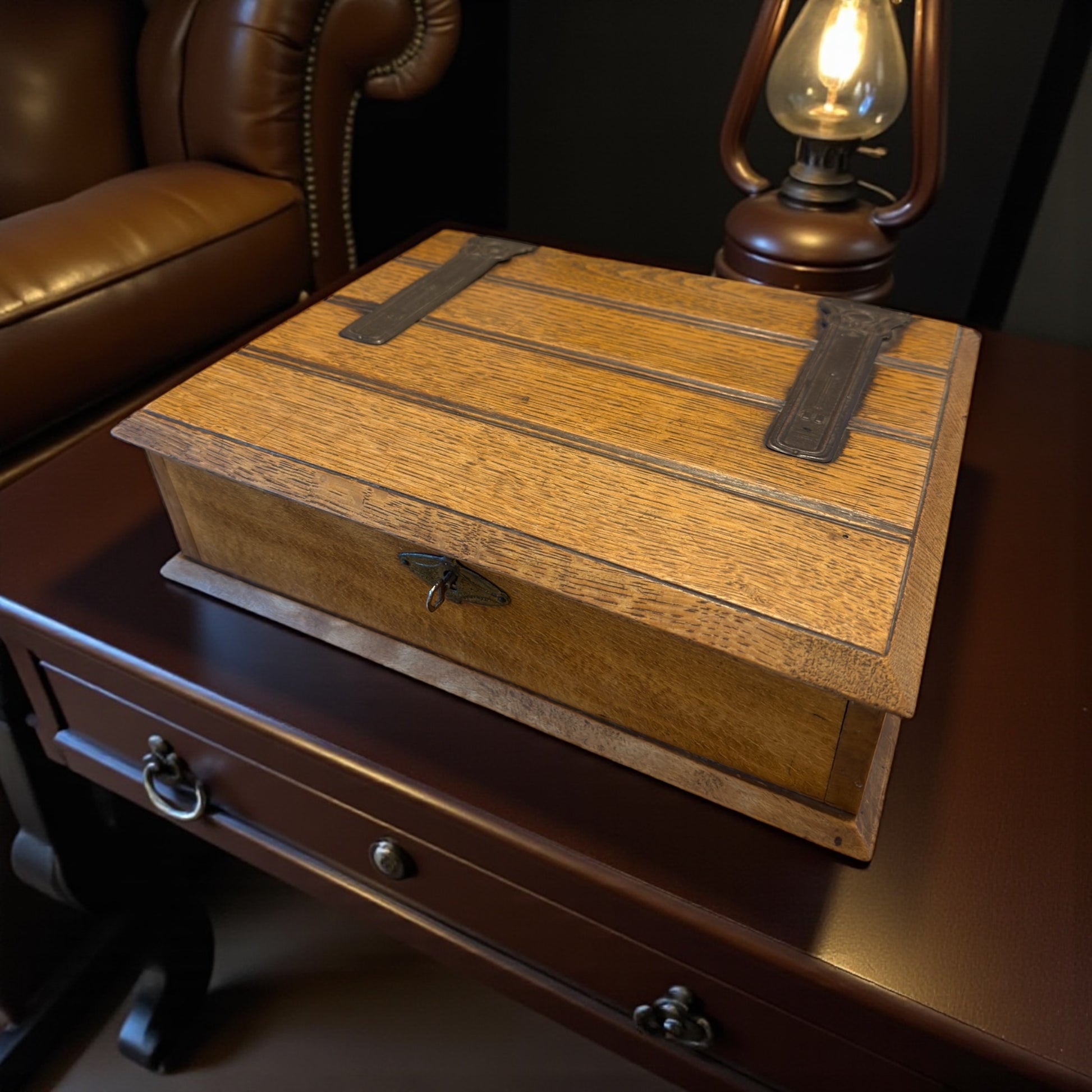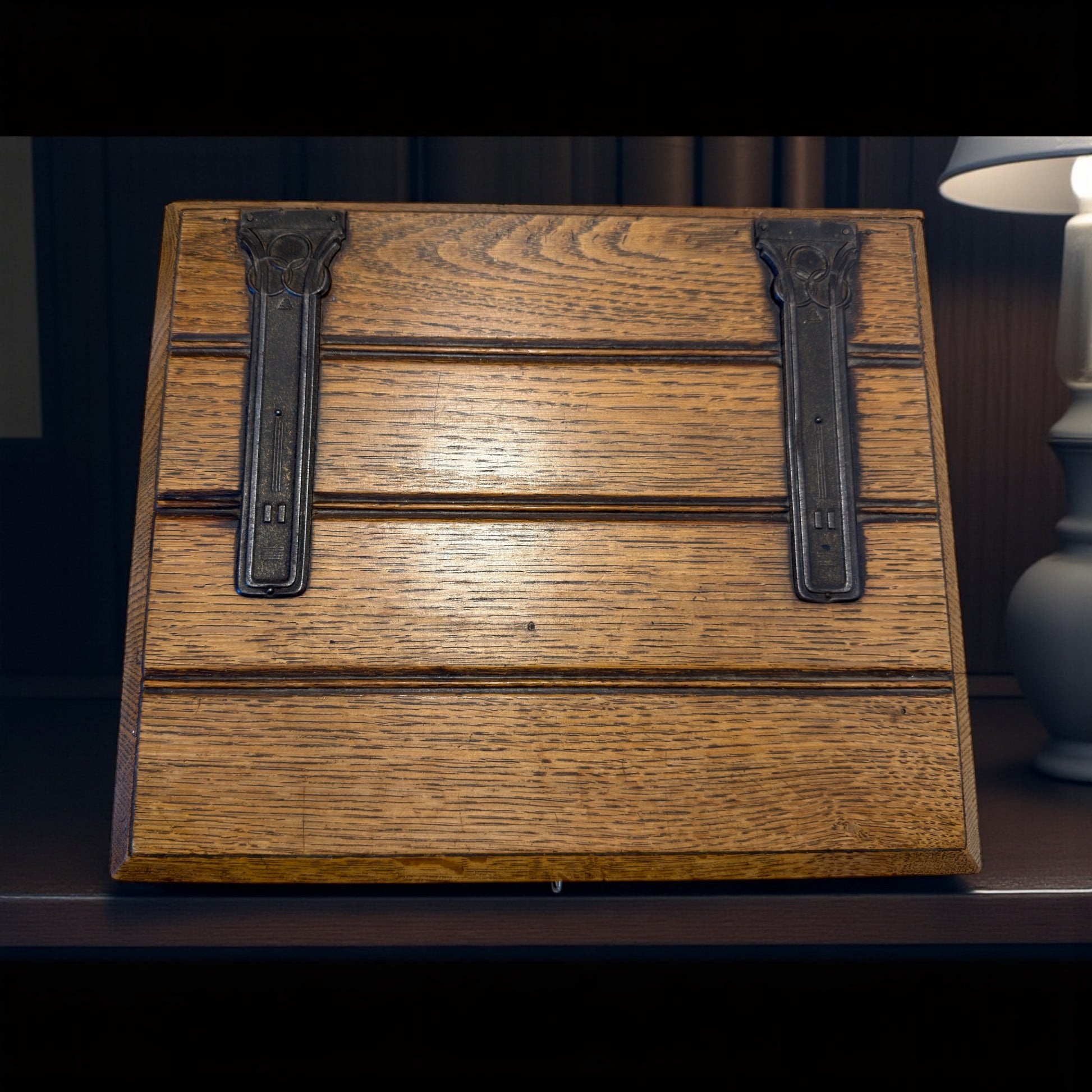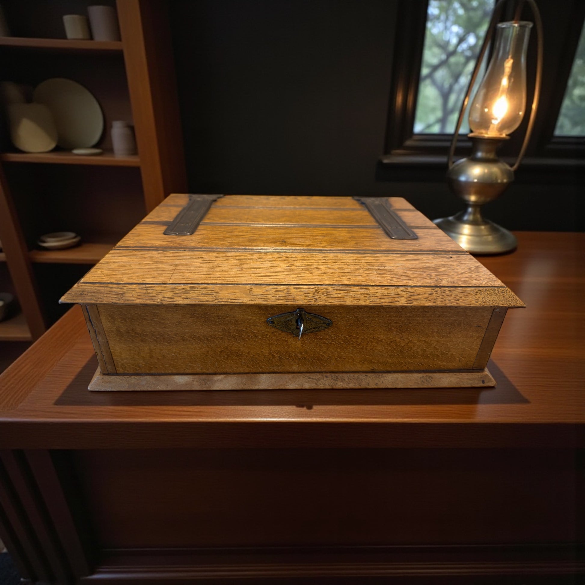 Ci sono oggetti che sembrano racchiudere il silenzio concentrato di un gesto antico — come quello di chi, chino su un piano di legno caldo, riempiva pagine di inchiostro e pensieri. Questa scatola da scrittura belga degli anni Venti-Trenta appartiene a quella categoria di oggetti nati per servire e poi rimasti, col tempo, a custodire memoria. Realizzata probabilmente in rovere, con una struttura leggermente inclinata — più alta sul davanti e più bassa sul retro — per offrire una superficie ergonomica di scrittura, segue il principio funzionale dei writing slopes ottocenteschi, evoluti nel periodo tra le due guerre. La pendenza agevolava il gesto dello scrivere a penna, mantenendo il polso rilassato e impedendo alle gocce d’inchiostro di accumularsi sul foglio.Il coperchio è scandito da listelli orizzontali e impreziosito da due splendide cerniere in ferro battuto di gusto Arts & Crafts, che nel Belgio di quegli anni si fondeva con il rigore geometrico della Secessione Viennese. I fregi mostrano un motivo ad intreccio di cerchi concentrici che richiama il simbolismo celtico e la ricerca di armonia tra funzione e bellezza propria del movimento Liberty nordico. All’interno, un doppio scomparto: quello anteriore per i pennini (ce ne sono ancora 3!) e gli strumenti da scrittura, e uno più ampio, ribaltabile, destinato a custodire lettere e piccoli segreti. La chiave originale, perfettamente funzionante, aggiunge una nota poetica: aprire e chiudere questo piccolo scrigno diventa un gesto rituale. Un pezzo sobrio e carico di fascino, perfetto per chi ama la scrittura, la materia viva del legno e la bellezza dell’artigianato europeo del primo Novecento. Dimensioni: cm 24,5 × 28,5 – altezza frontale 8,5 cm, posteriore 6 cm.