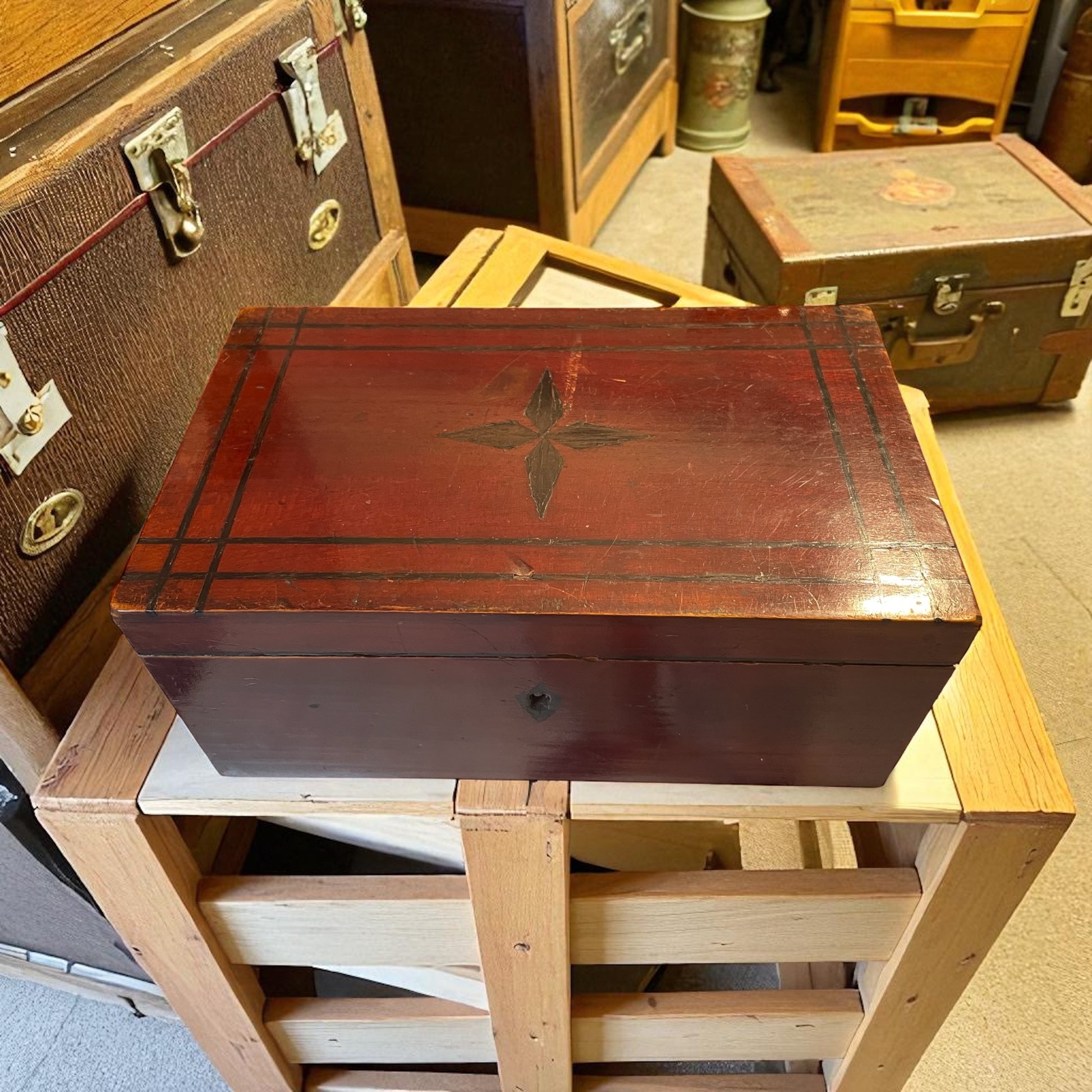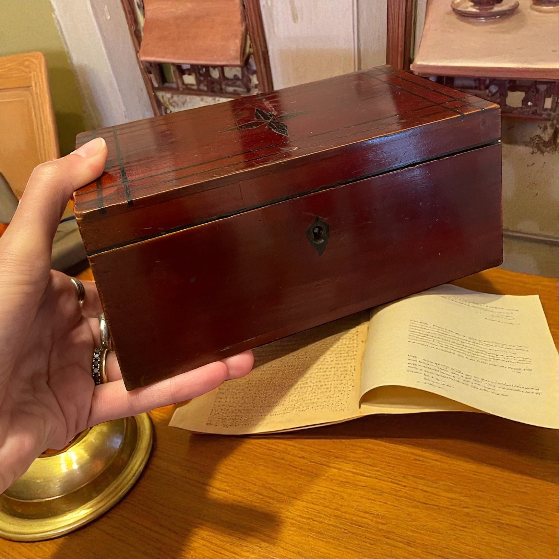 Una semplice scatola in legno, direte. Ma chi la prende in mano scopre presto che custodisce un segreto. Sotto il divisorio, celato da un ingegnoso meccanismo a molla, si nasconde un doppio fondo perfettamente funzionante: un rifugio segreto per gioielli, lettere o piccoli tesori da proteggere da occhi indiscreti. Realizzata tra la fine dell’Ottocento e i primi del Novecento, la scatola porta con sé i segni autentici del tempo: qualche graffio, piccole mancanze nella lucidatura originale, l’assenza della chiave della serratura frontale. Difetti che non tolgono fascino, anzi lo accrescono, perché raccontano di vite passate e di mani che l’hanno aperta con emozione e cautela. Oggi, come allora, il suo valore non sta nel legno e nelle finiture, ma nel gesto segreto che rivela il doppio fondo. Una piccola meraviglia d’ingegno, capace di riportarci al tempo in cui il custodire era un’arte e il mistero un lusso. Naturalmente, a chi l’acquista verranno fornite le istruzioni su come aprire il doppio fondo.