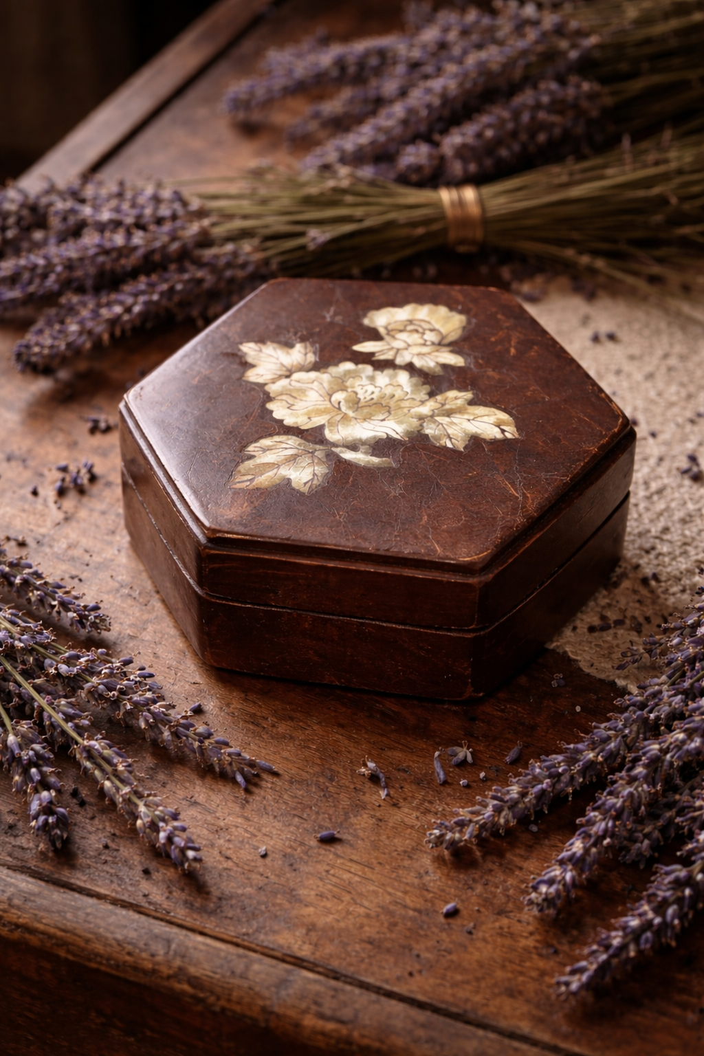 C’era un momento preciso in cui questa scatolina veniva aperta. Non di fretta. Non davanti a qualcuno. Quando la stanza era già silenziosa e la giornata stava scivolando via. La mano si posava sul coperchio, seguiva con il polpastrello il disegno in madreperla — un gesto quasi distratto, ripetuto mille volte — e poi l’apertura lenta, come se dentro non ci fossero solo gioielli, ma abitudini. L’interno rosso accoglieva anelli tolti a fine giornata, piccoli orecchini appoggiati senza ordine, forse una catenina sottile. Oggetti scelti al mattino e restituiti la sera, uno alla volta. Questa scatolina non custodiva ricchezza: custodiva continuità. L’intarsio floreale in madreperla non è decorazione ostentata. È una bellezza privata, fatta per essere vista da vicino, alla luce giusta, da chi sa già cosa cerca. La madreperla, con il suo riflesso irregolare, cambia a ogni inclinazione: come se l’oggetto stesso non volesse mai mostrarsi uguale. È una scatolina che ha vissuto su una toeletta, non in una vetrina. Che conosce il peso delle mani, il rumore lieve della chiusura, il tempo che passa senza clamore. Forse è proprio qui il suo valore più vero: non nel conservare ciò che è prezioso, ma nel rendere prezioso il gesto di riporlo.