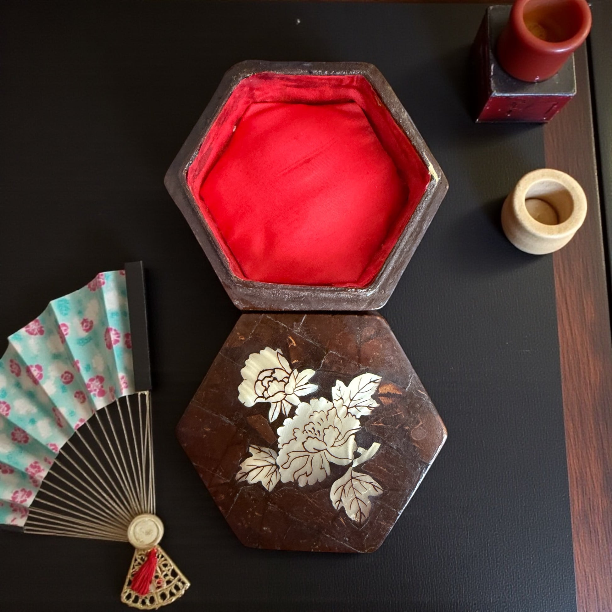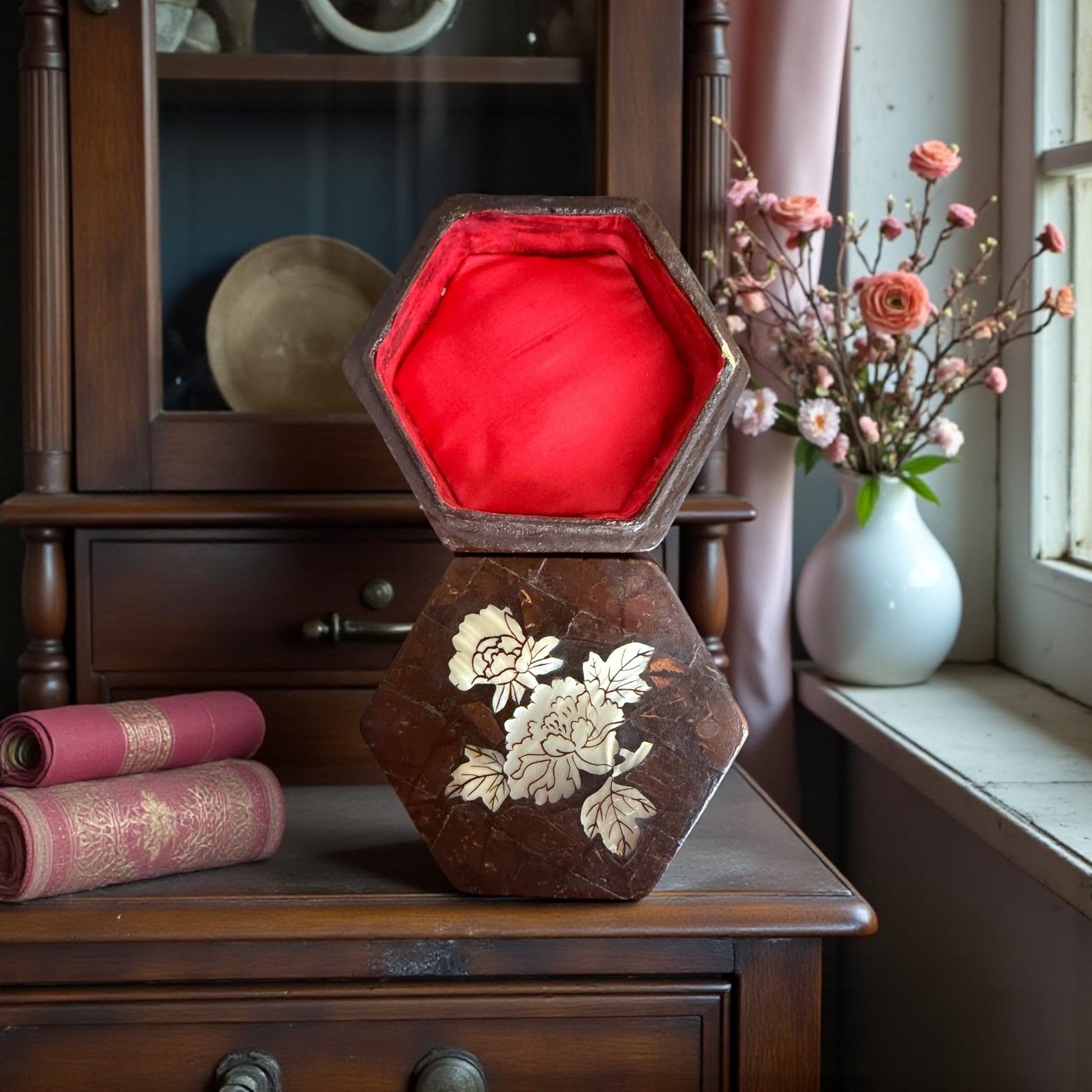 Antica scatoletta portagioie ottagonale con seta rossa ed intarsio madreperla
