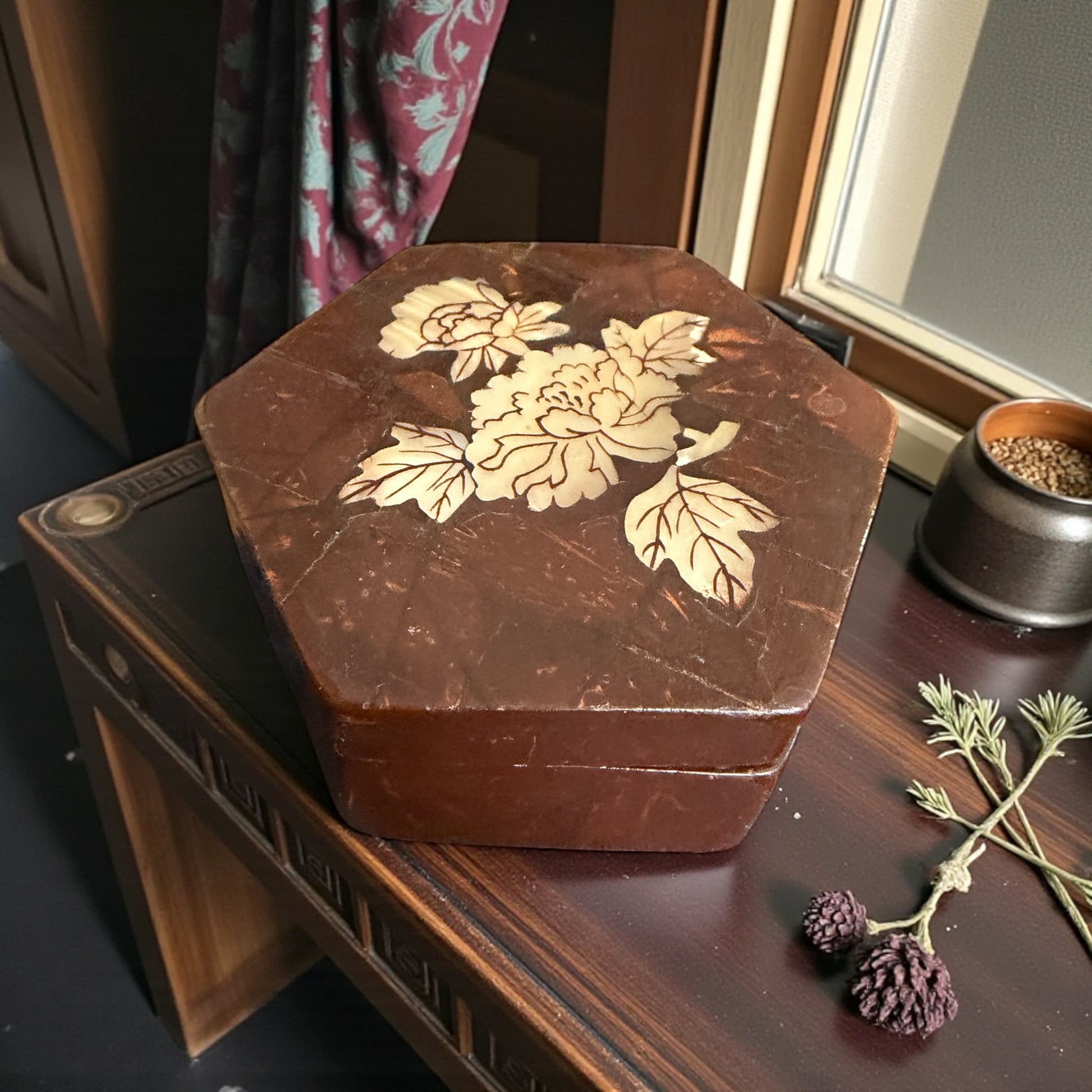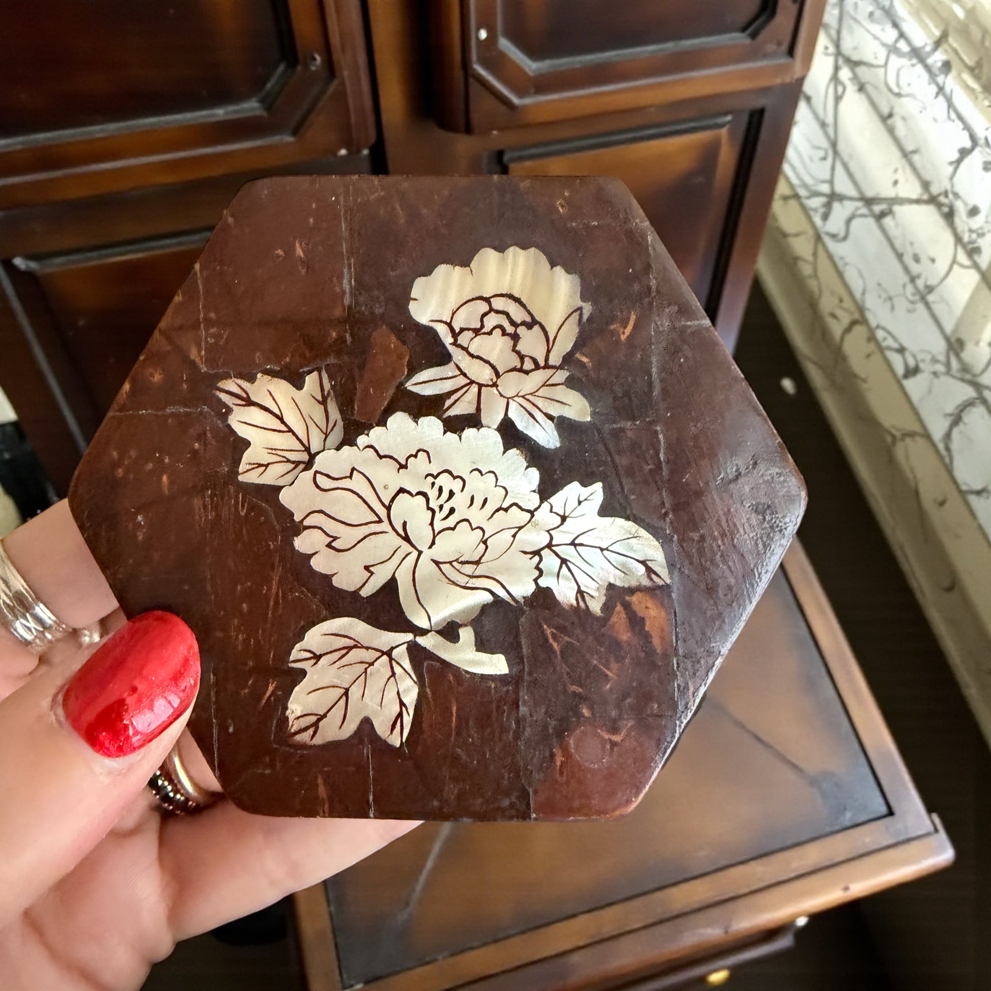 Porta-gioielli. Epoca: fine XIX – inizi XX secolo. Materiali: legno, madreperla, seta. Decorazione: intarsio floreale in madreperla. Forma: ottagonale. Stato di conservazione: buono, con normale patina del tempo. Utilizzo: gioielli, piccoli oggetti da toeletta