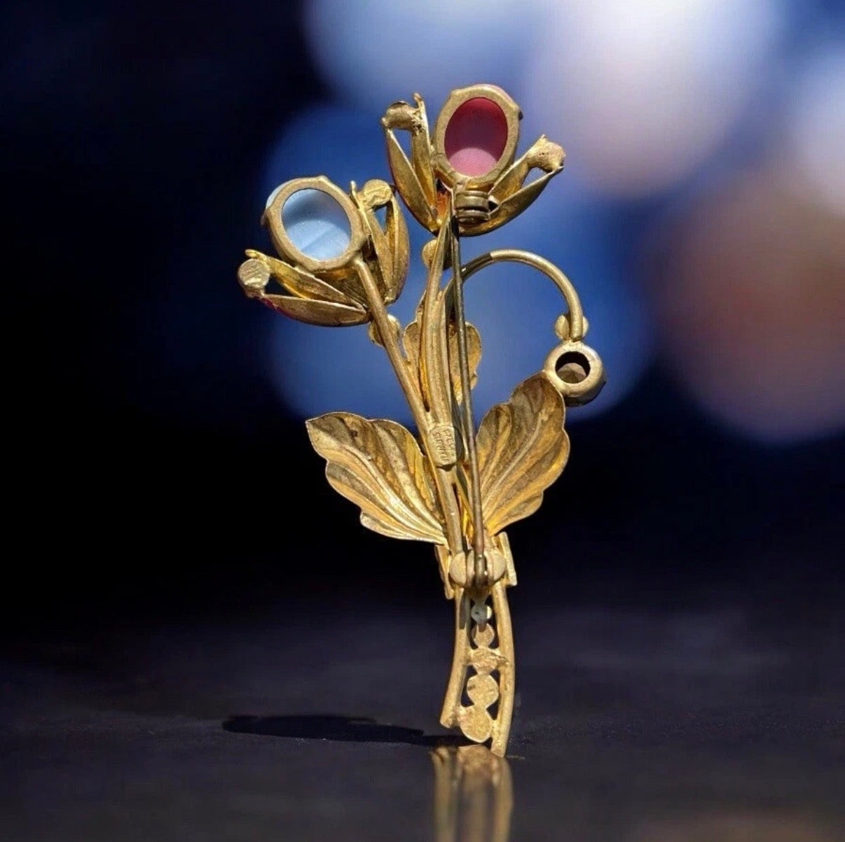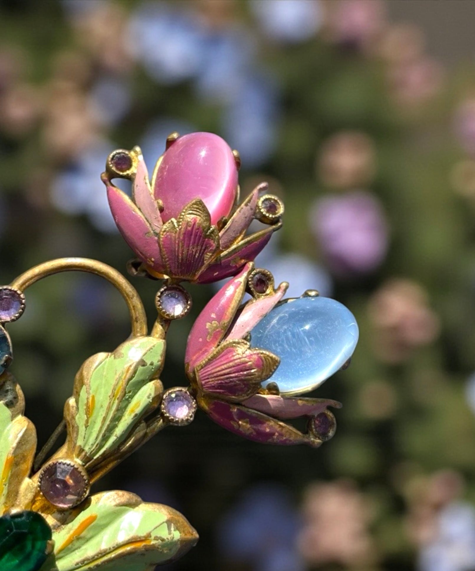 C’era un tempo in cui la luce veniva catturata, incastonata e trasformata in poesia. Non era oro, non erano diamanti, ma vetro lavorato con sapienza antica, nato tra le mani pazienti degli artigiani di Jablonec nad Nisou, nel cuore della Cecoslovacchia. Qui, tra il rumore dei forni e il tintinnio di minuscole pinze, nacque questa spilla: due fiori in fiore, raccolti in una danza cromatica di rosa e azzurro lattiginoso, foglie smaltate a mano, gemme incastonate come rugiada su un ramo. Correva la fine degli anni ’30, e la guerra non aveva ancora oscurato del tutto i sogni. Le botteghe boeme, famose in tutta Europa fin dal XIX secolo per l’eccellenza nella produzione di vetro artistico, realizzavano pezzi di bigiotteria che oggi chiamiamo “poveri” ma che, allora, erano preziosi. Questa spilla – alta, scenografica, teatrale – era forse destinata a una giovane donna di città, pronta a uscire per una serata al cinema, o a una madre che la conservava con cura in un piccolo astuccio di velluto, come unico lusso concesso. Il metallo dorato è segnato dal tempo, lo smalto mostra piccole crepe come pelle vissuta, ma è proprio lì che si nasconde la bellezza più autentica: nei suoi segni. Portare oggi questo fiore sul cuore è come affacciarsi su un’altra epoca.