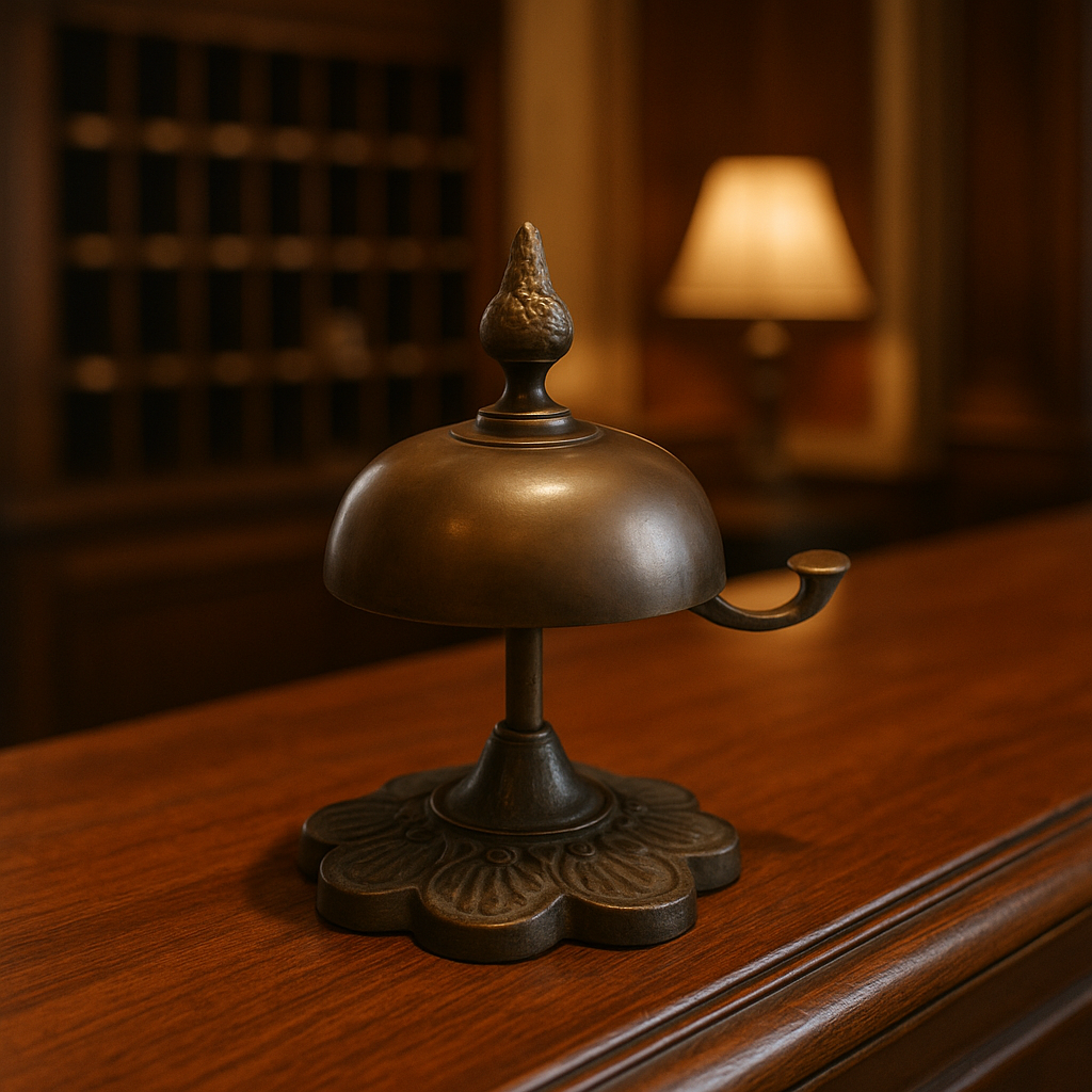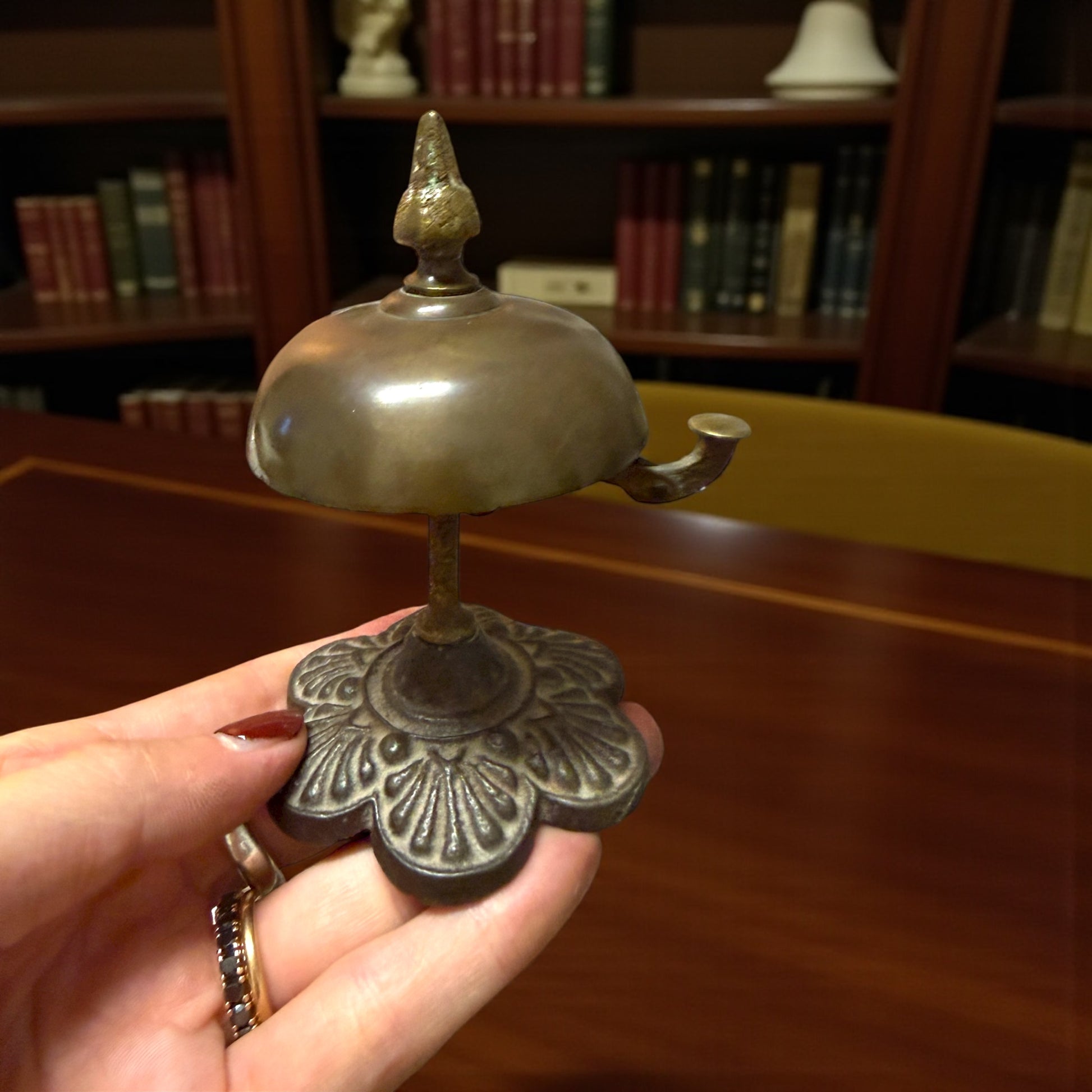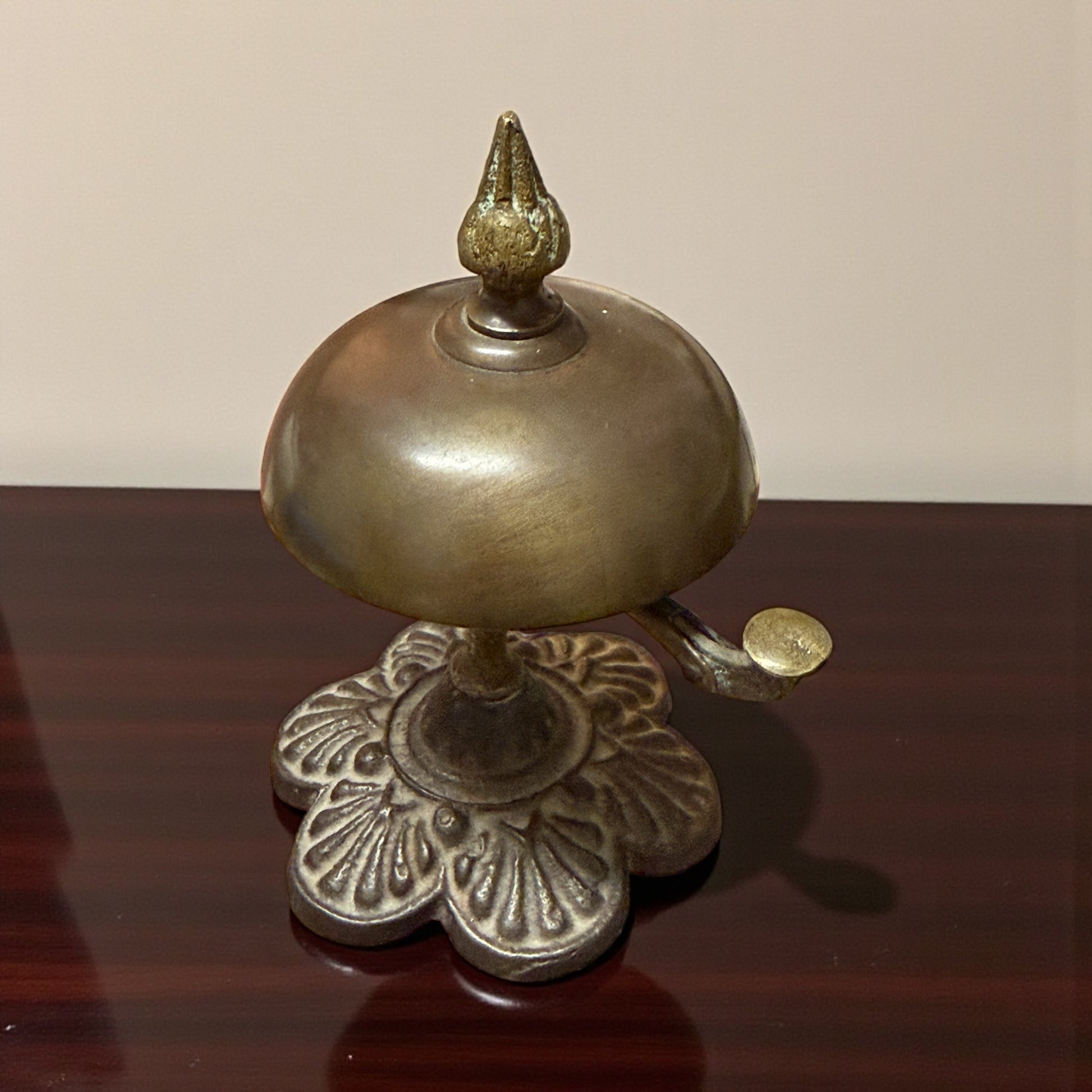 C’è un suono che appartiene al passato, sottile e gentile come un richiamo di altri tempi. Bastava un piccolo gesto, la pressione di una leva, e la campana rispondeva con la sua voce chiara: un “din” discreto che annunciava presenze, attese, arrivi. Questo campanello da banco, alto appena 11 cm, conserva intatto quel fascino d’altri tempi. Realizzato in ottone e ghisa fusa, rivela nelle linee floreali della base e nel pomello cesellato l’eleganza semplice delle reception d’inizio Novecento. Il meccanismo a molla funziona: non si colpisce dall’alto, ma si fa scattare lateralmente, come un piccolo segreto meccanico. Il fermo sottostante è stato sostituito, intervento che non altera l’estetica né l’autenticità visiva del pezzo. Un oggetto che suona ancora, e che sa evocare un tempo in cui anche un suono poteva essere un gesto di cortesia.