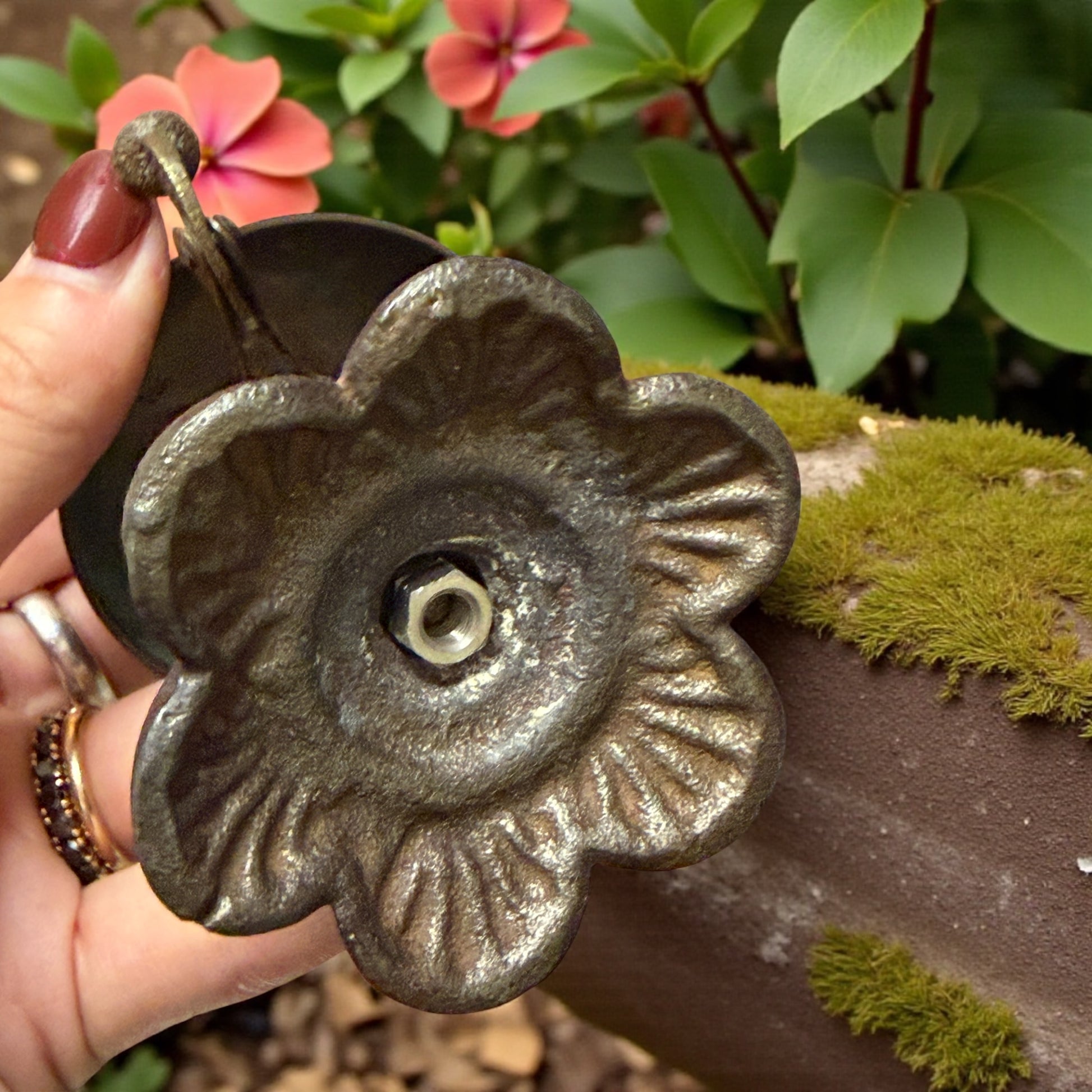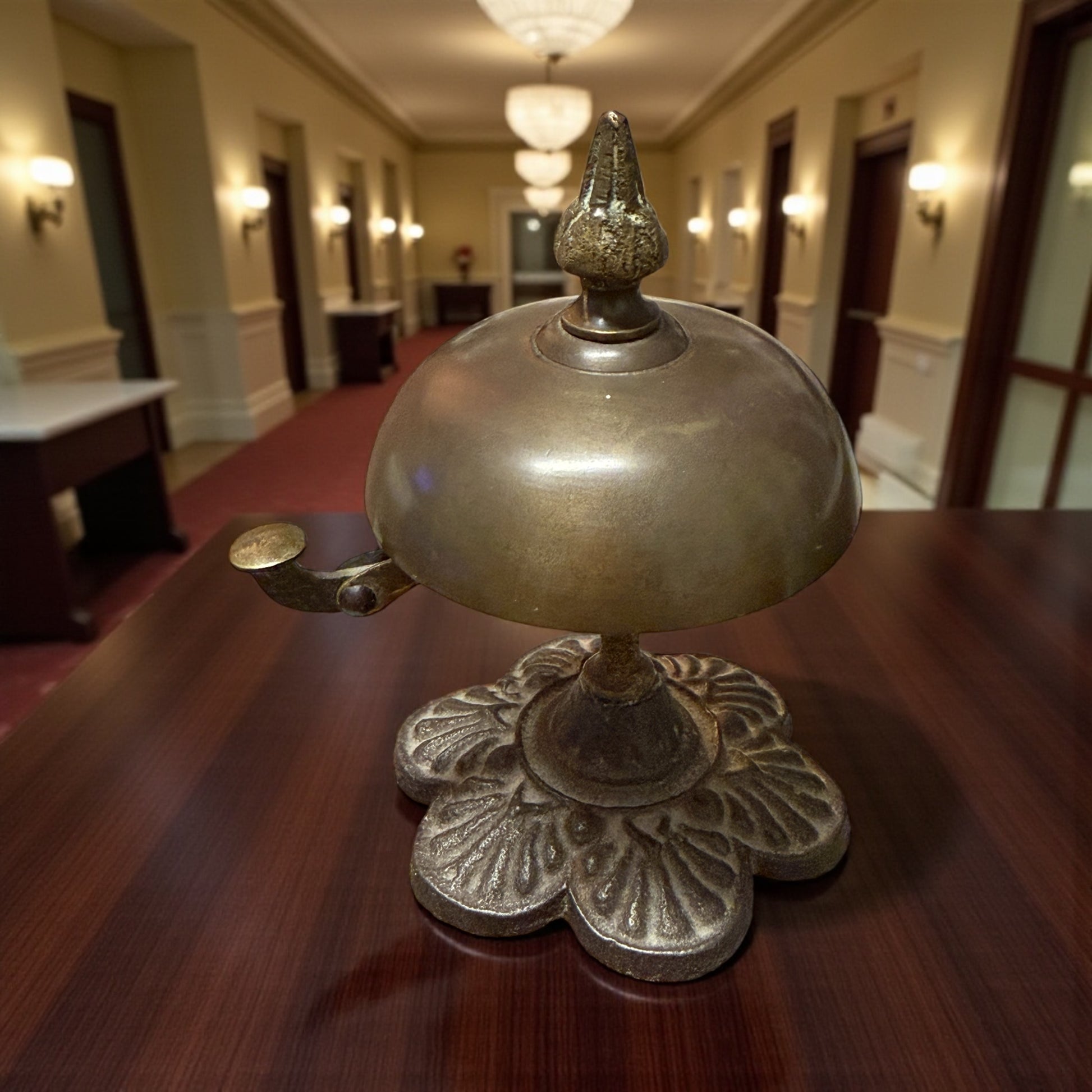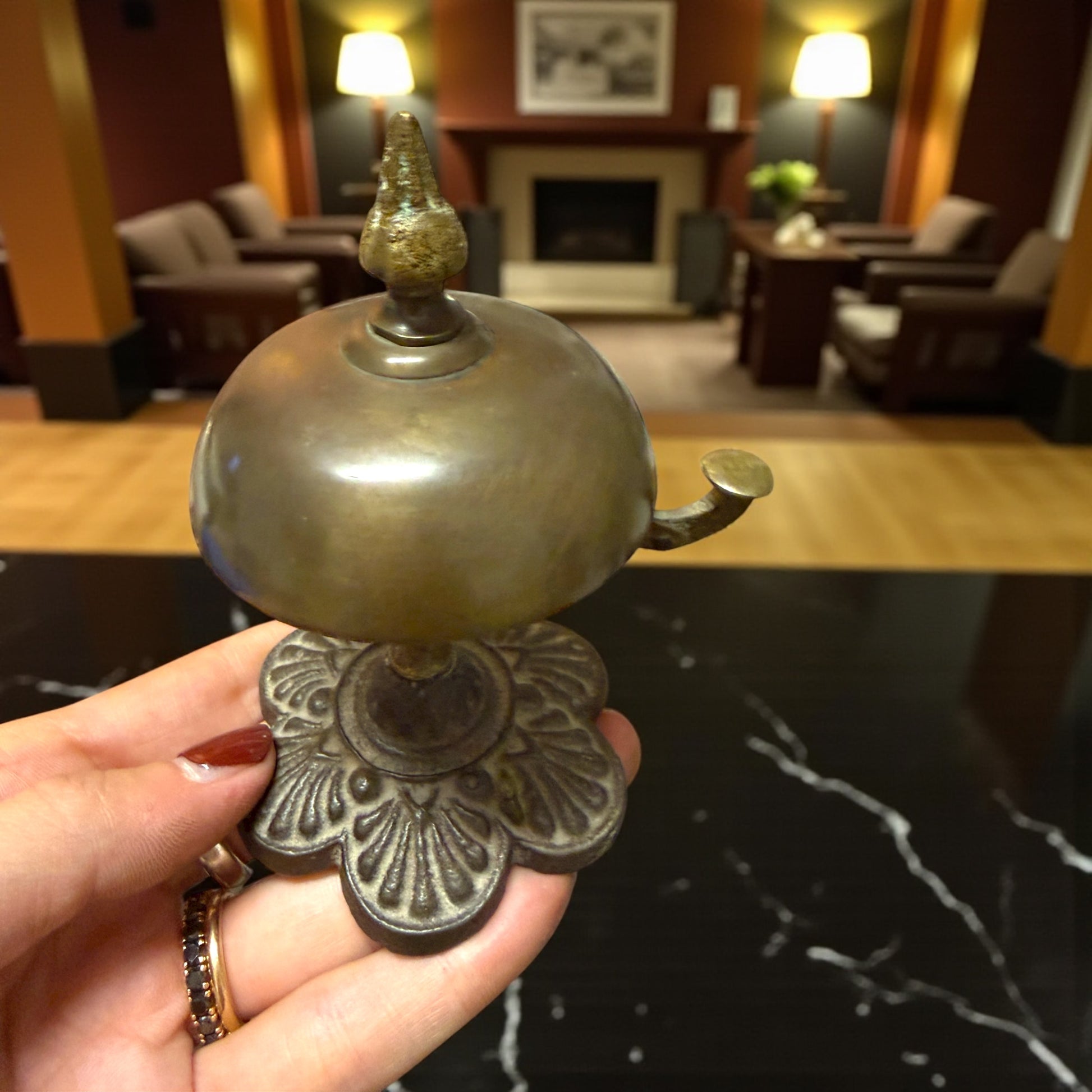 C’è un suono che appartiene al passato, sottile e gentile come un richiamo di altri tempi. Bastava un piccolo gesto, la pressione di una leva, e la campana rispondeva con la sua voce chiara: un “din” discreto che annunciava presenze, attese, arrivi. Questo campanello da banco, alto appena 11 cm, conserva intatto quel fascino d’altri tempi. Realizzato in ottone e ghisa fusa, rivela nelle linee floreali della base e nel pomello cesellato l’eleganza semplice delle reception d’inizio Novecento. Il meccanismo a molla funziona: non si colpisce dall’alto, ma si fa scattare lateralmente, come un piccolo segreto meccanico. Il fermo sottostante è stato sostituito, intervento che non altera l’estetica né l’autenticità visiva del pezzo. Un oggetto che suona ancora, e che sa evocare un tempo in cui anche un suono poteva essere un gesto di cortesia.