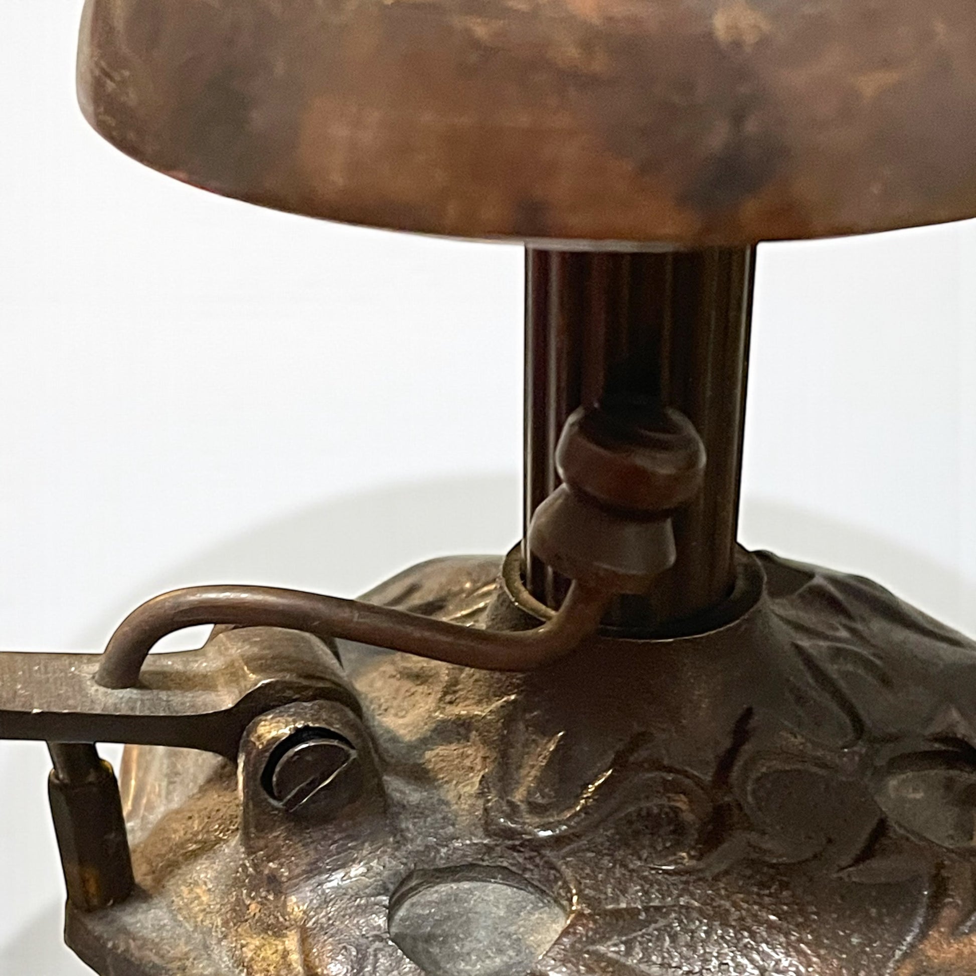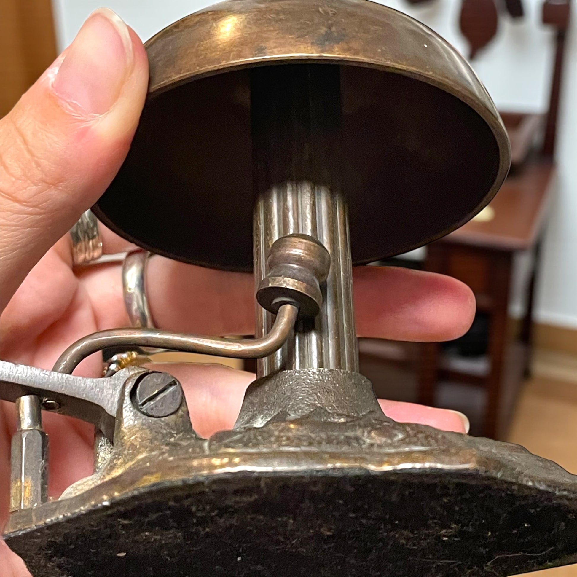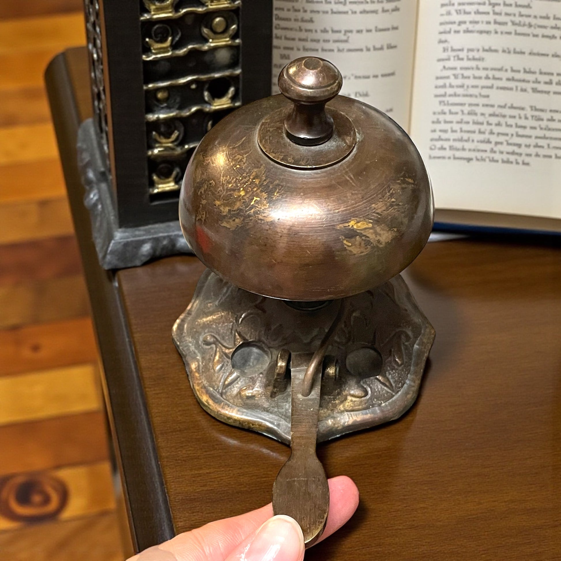 Campanello da banco a leva laterale (reception). Stile/Epoca: Liberty / Art Nouveau, ca. 1900–1915. Materiali: Bronzo/ottone fuso; leve e biella in ferro/acciaio; fondo in feltro blu. Funzionamento: Perfetto; suono pieno e brillante. Provenienza narrativa: Hotel tedesco (Mitteleuropa). Condizioni: Ottime condizioni d’uso; patina originale conservata; nessun intervento invasivo consigliato.