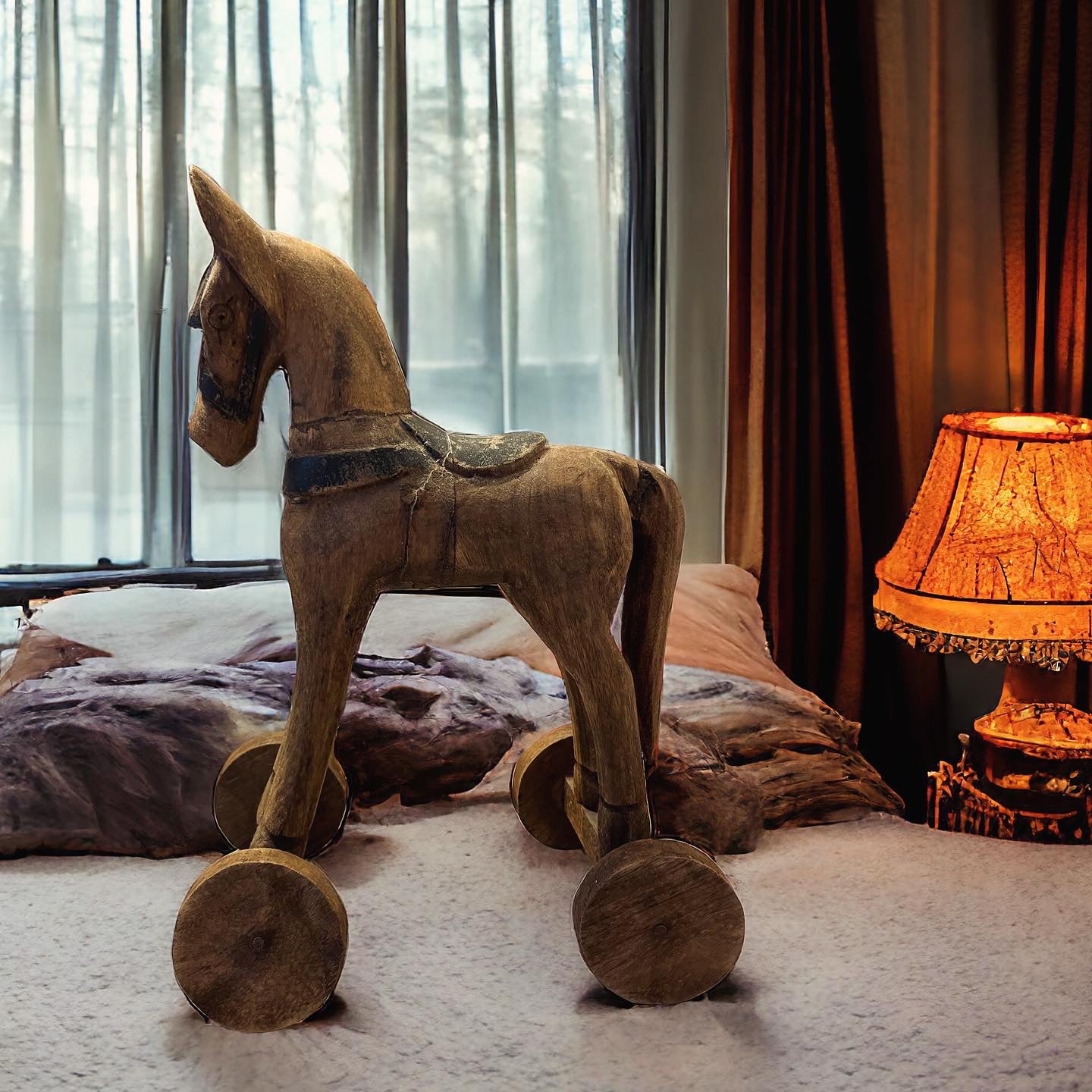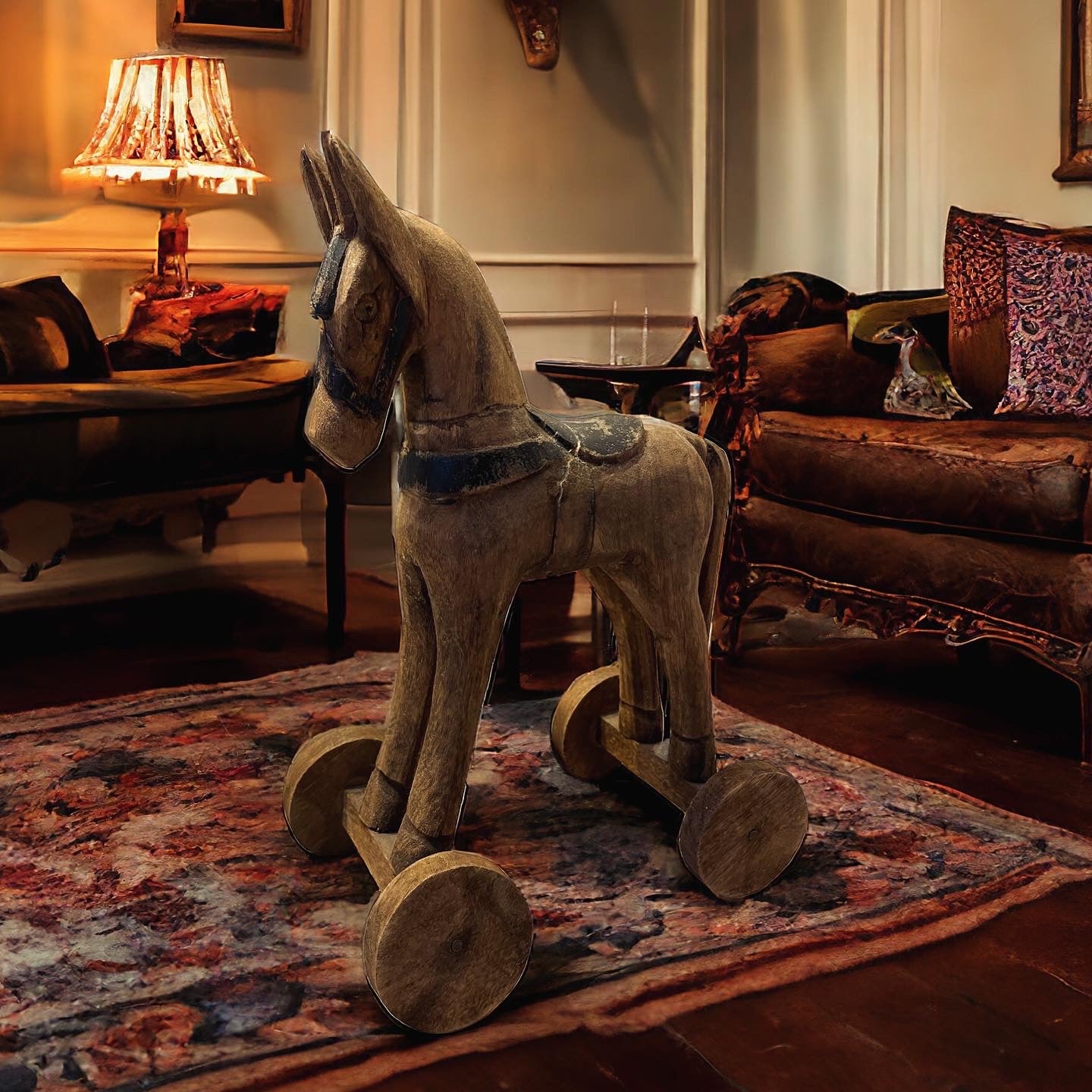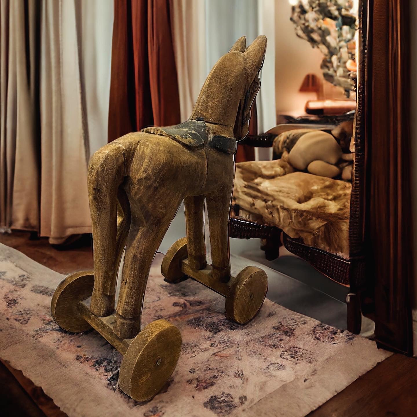 Antico cavallo in legno a rotelle