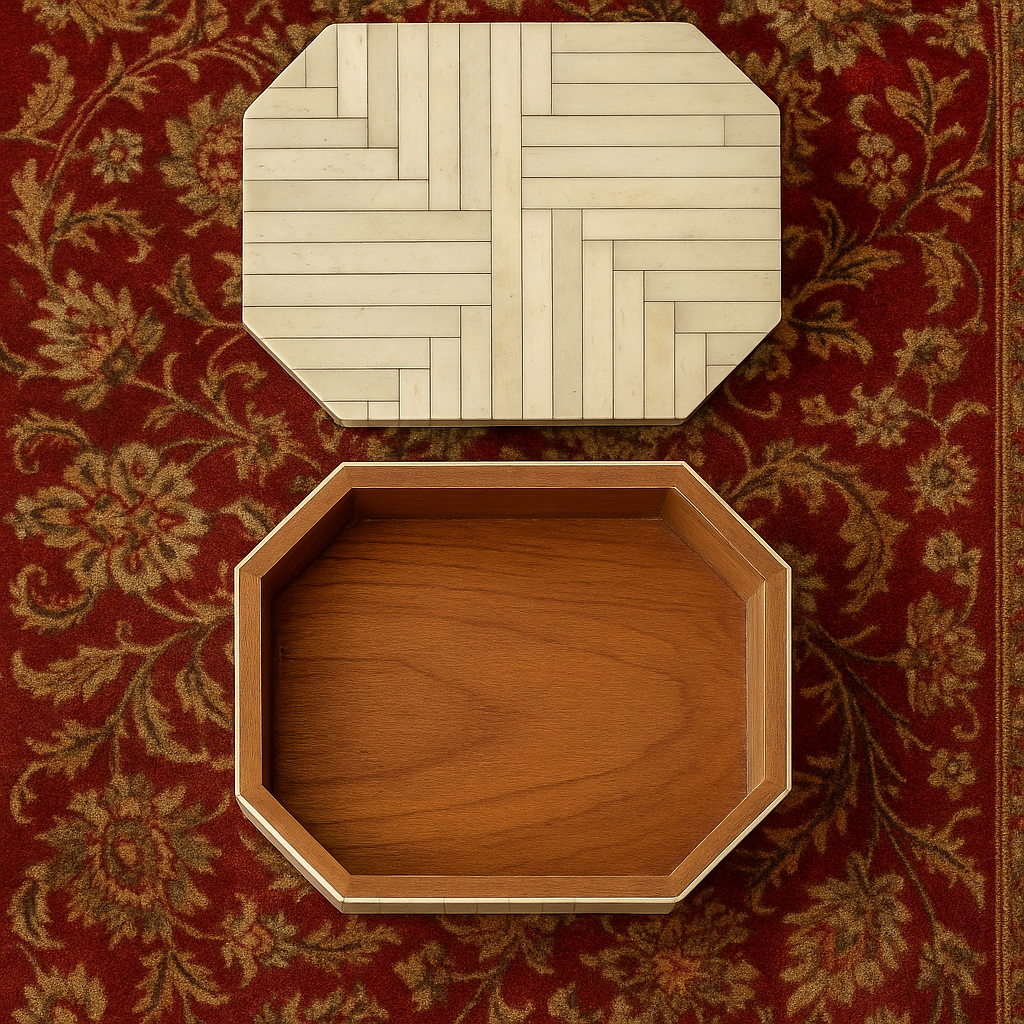 Non serviva a custodire gioielli, ma parole. Piccola, ottagonale, intarsiata con sottili tessere d’osso naturale: questa scatola racchiudeva cartes de visite, lettere piegate, fotografie. Ogni suo lato è una geometria perfetta, un equilibrio tra luce e ombra, come se la materia avesse imparato a respirare piano. Era una scatola da scrittoio, compagna silenziosa di chi ancora credeva nel gesto di lasciare un nome, una traccia, un pensiero da ricordare. Il coperchio, non incernierato, si solleva, si posa, e nel farlo invita a rallentare - a riappropriarsi del tempo e delle cose belle. Dentro, il legno levigato conserva il profumo della carta. Fuori, l’intarsio in osso riflette la luce come pelle d’alabastro. Oggi può accogliere i tuoi biglietti segreti, le tue lettere d’amore, i ricordi, un fiore lasciato seccare… ciò che vuoi proteggere dagli occhi indiscreti del mondo.