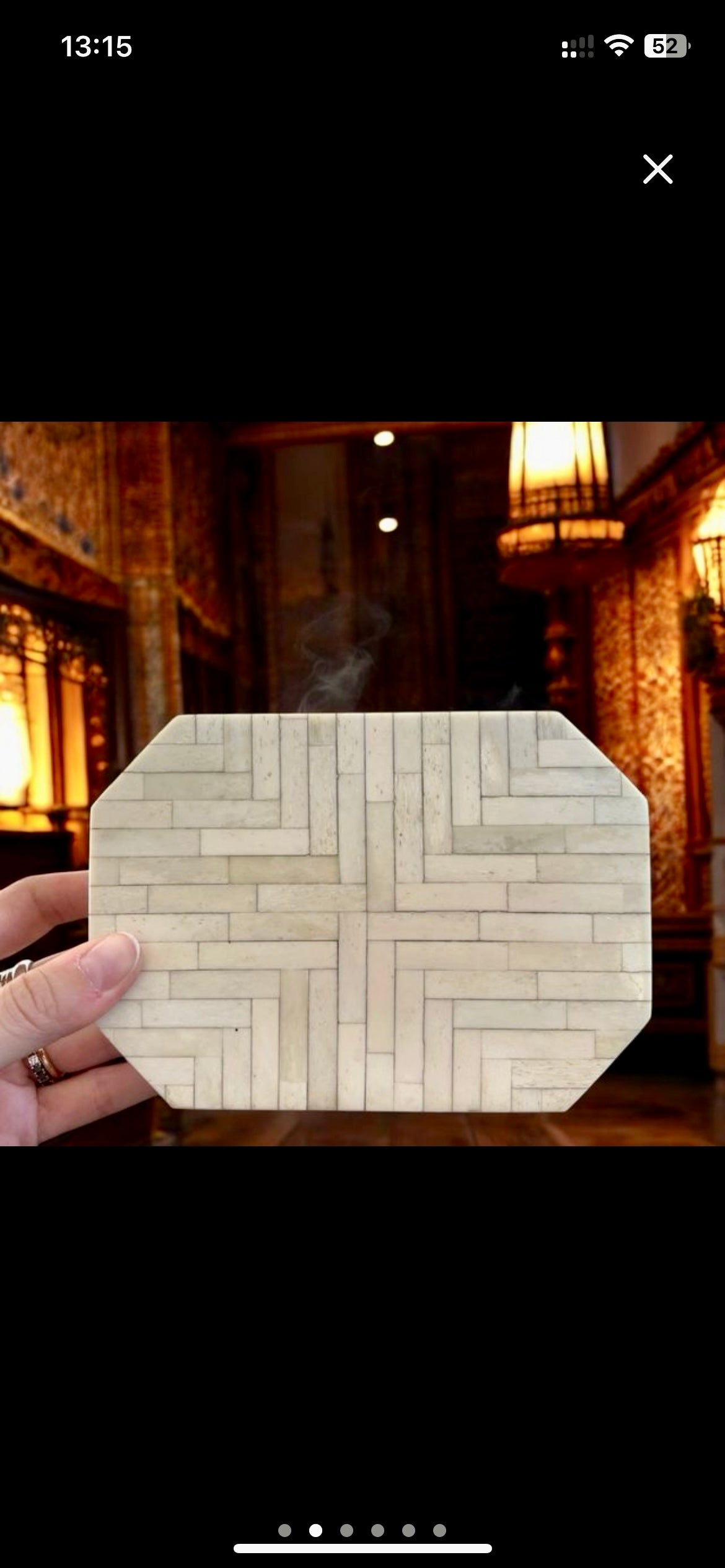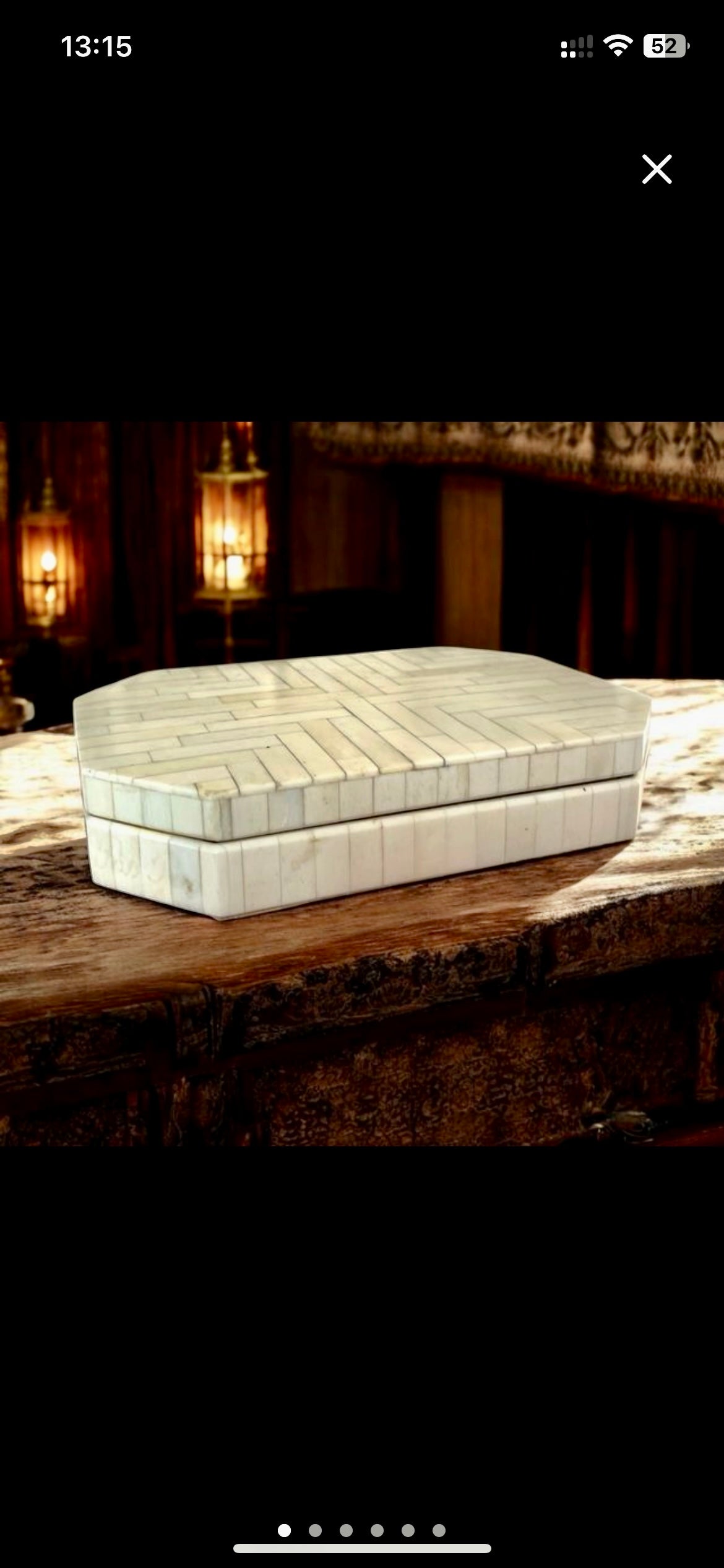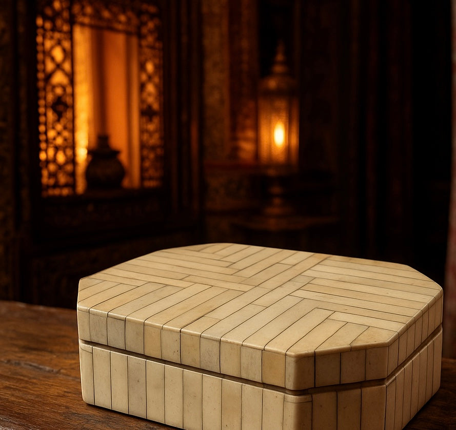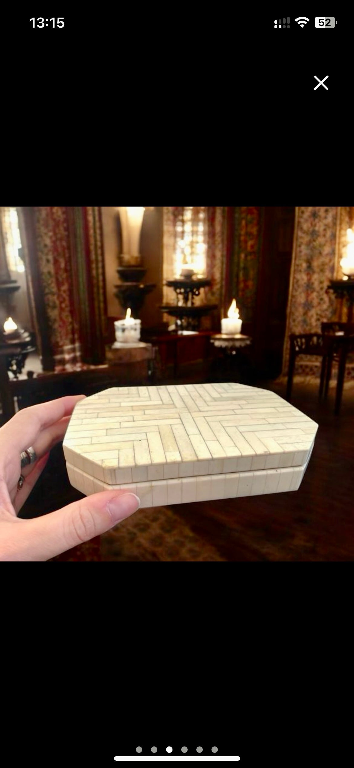 Scatola porta carte da visita / scrittoio. Epoca: Prima metà del XX secolo (ca. 1930). Provenienza: India o area medio-orientale. Materiale: Osso naturale intarsiato su legno. Forma: Ottagonale, con coperchio appoggiato (non incernierato). Condizione: Ottima, con lieve patina del tempo. Dimensioni: 16 × 11 cm.