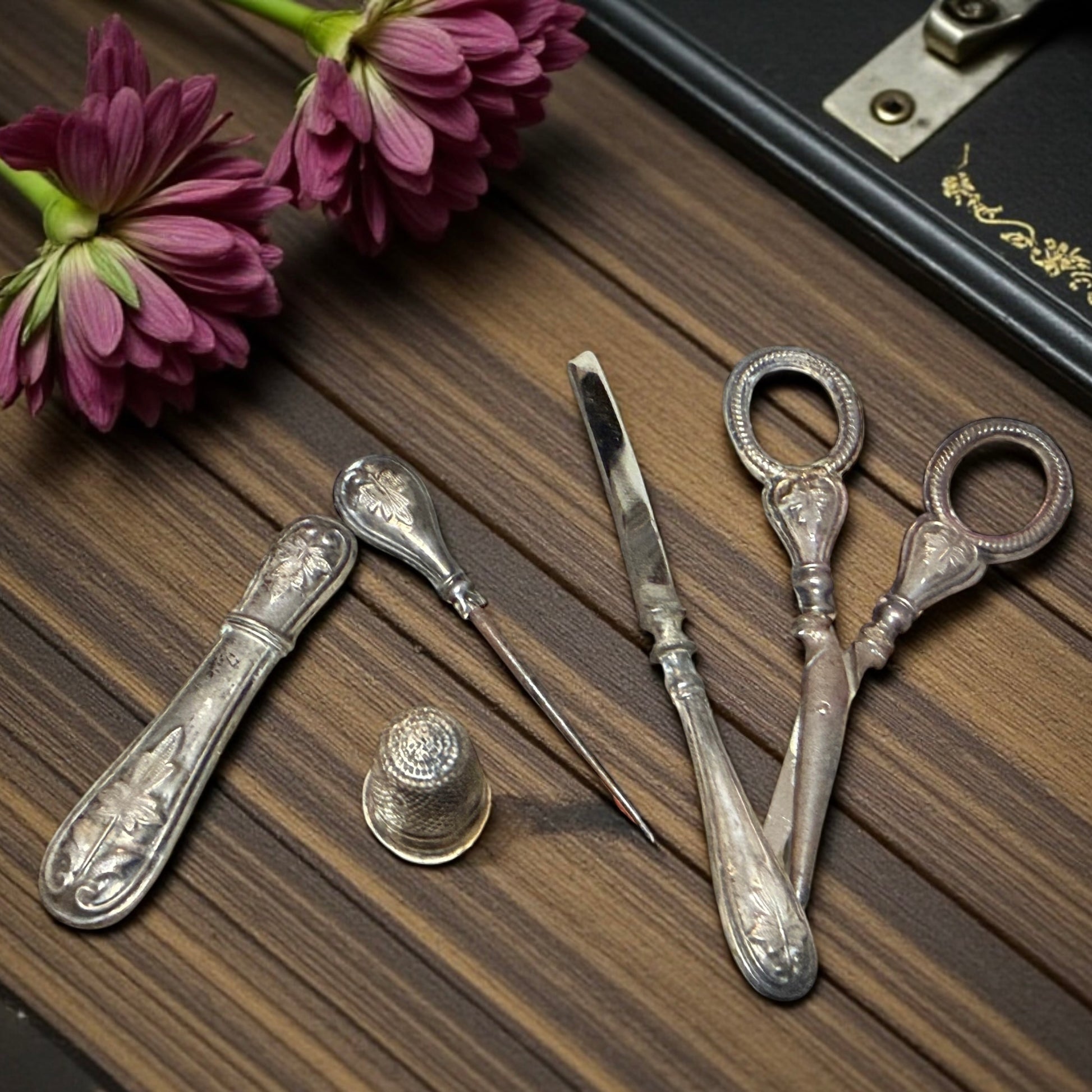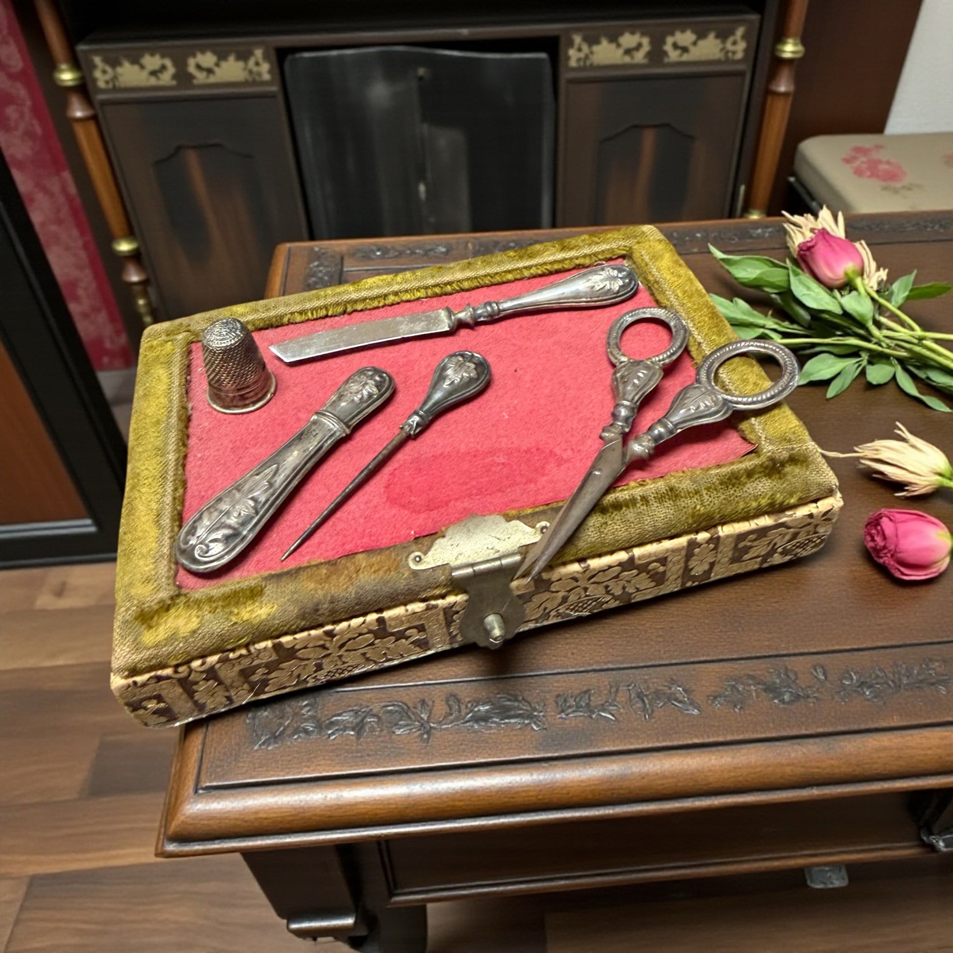 Set da cucito / nécessaire. Epoca: fine XIX – inizi XX secolo (ca. 1890–1915). Provenienza: italiana. Materiali: lamina d’argento applicata + ferro. Componenti:. ditale (bordo non perfettamente tondo), porta aghi apribile, punteruolo, forbici, coltellino a lama. Scatola: originale coeva, rivestita, interno in velluto e seta.