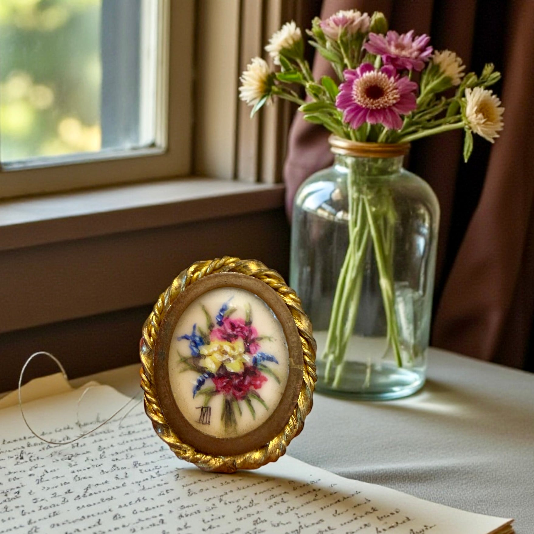 Un piccolo gesto di colore, fermato nel tempo. Questa spilla racchiude un bouquet dipinto a mano, delicato e vibrante, come se fosse stato colto in un giardino silenzioso e affidato alla memoria. Ogni fiore è costruito con pennellate leggere, sovrapposte, vive: non c’è nulla di meccanico, nulla di ripetibile. La firma in basso racconta una presenza discreta, una mano che ha lasciato traccia senza voler primeggiare. La cornice dorata, con il suo motivo a cordoncino, protegge l’immagine come una piccola cornice domestica, di quelle che si tenevano sul comò o appuntate al vestito buono. È un oggetto intimo, pensato per stare vicino al corpo, per accompagnare un abito con grazia silenziosa. E oggi, come allora, conserva la stessa gentilezza.