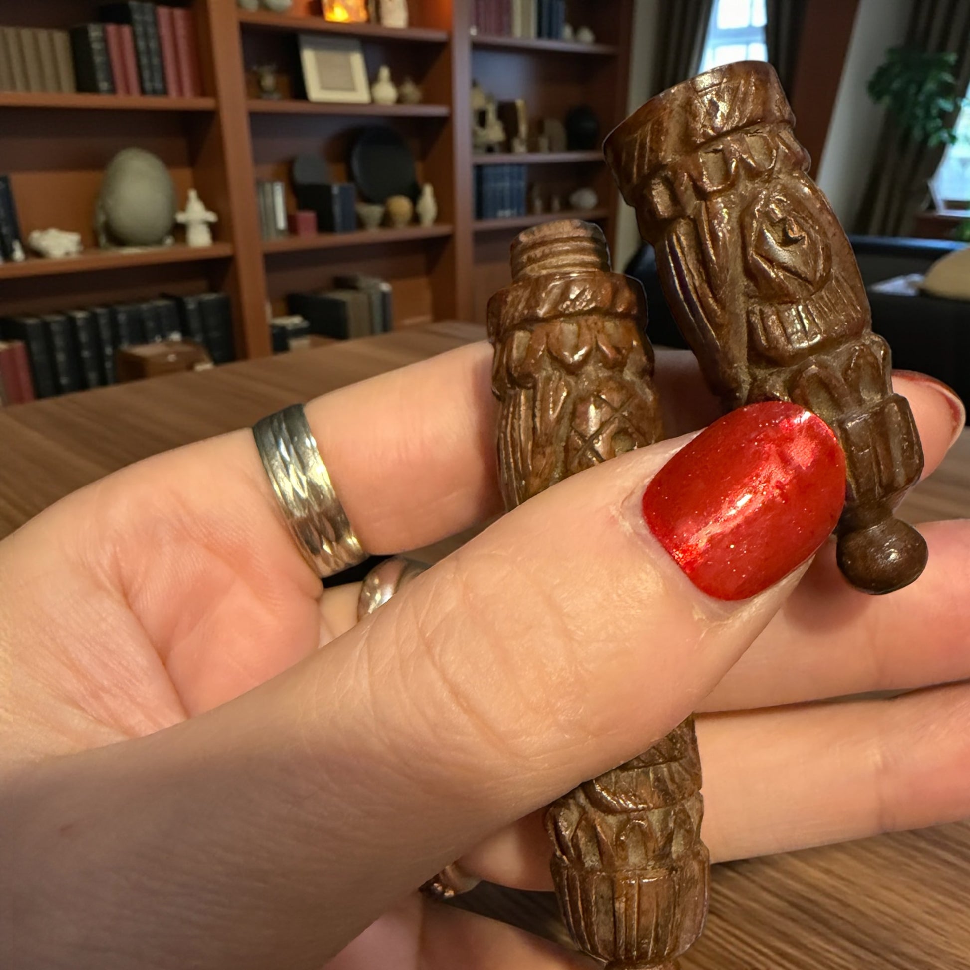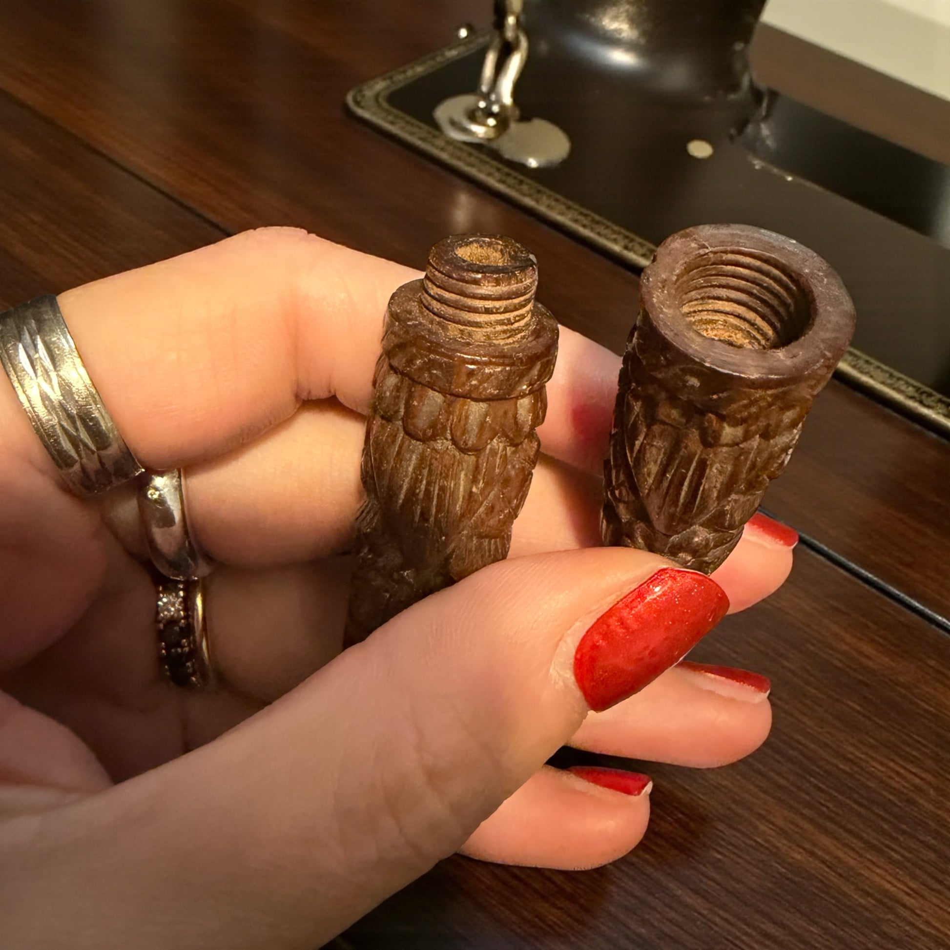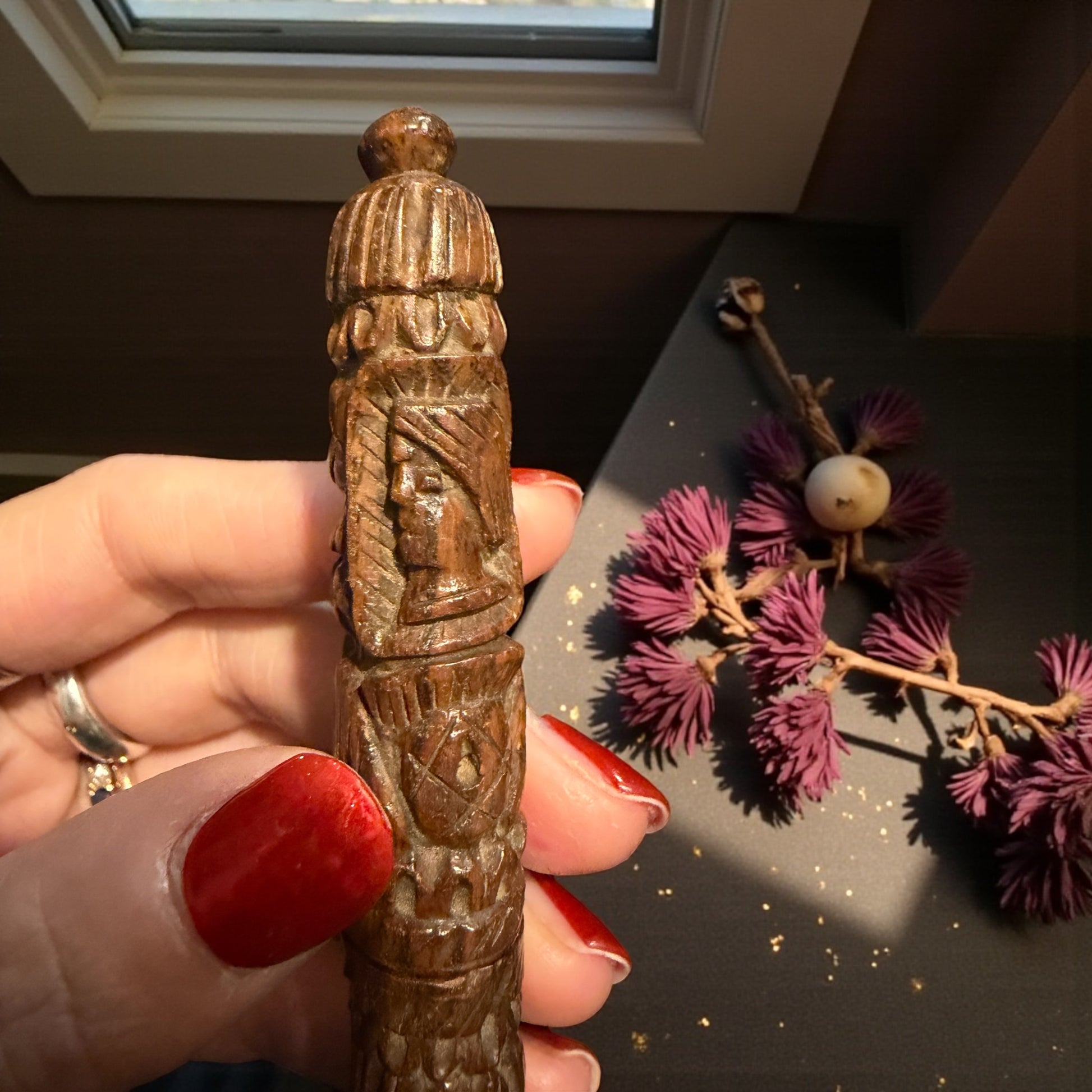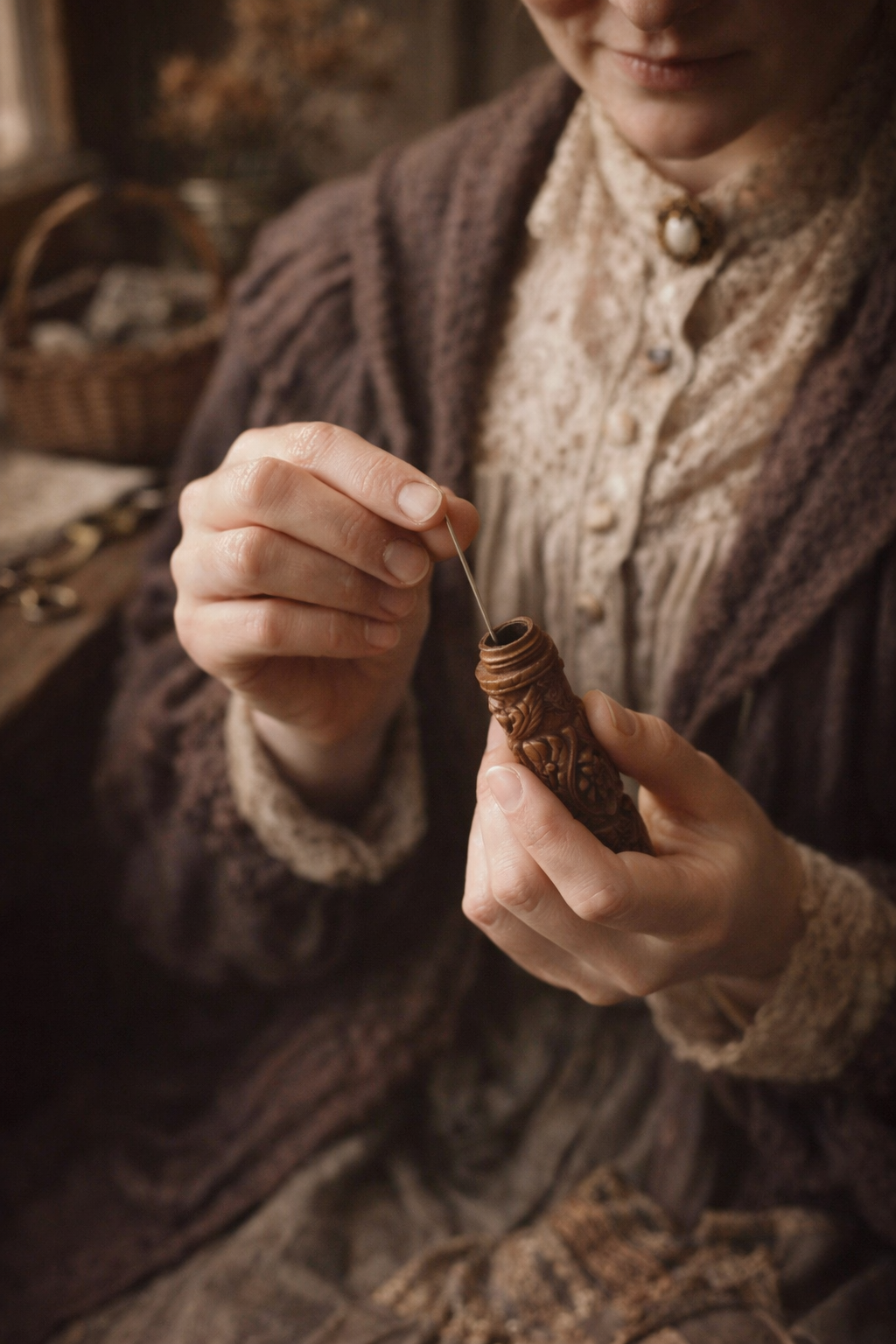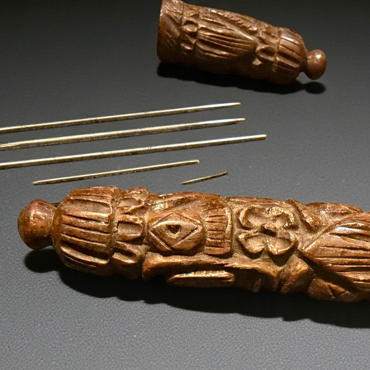 Ci sono oggetti che non si limitano a custodire qualcosa: custodiscono qualcuno. Questo piccolo cilindro in legno intagliato sembra, a prima vista, solo un raffinato contenitore. Ma basta seguirne le linee con lo sguardo — o con le dita — per accorgersi che, tra i motivi geometrici e floreali, emerge il profilo discreto di una donna, quasi velata, come se osservasse da dentro il tempo. È un oggetto che parla di mani pazienti, di gesti ripetuti, di silenzi abitati. Si svita con naturalezza, rivelando un interno pensato per accogliere piccoli strumenti: è un porta aghi, o needle case. Gli aghi trovati all’interno non sono coevi, ma raccontano bene la sua vocazione originaria: accompagnare il lavoro quotidiano, senza rumore. Tenendolo in mano si ha la sensazione che non fosse fatto per essere lasciato in un cassetto, ma per stare vicino, quasi addosso. Come un segreto condiviso solo con chi sa guardare. E tu, che cosa immagini sia stato custodito qui dentro, prima di arrivare a te?