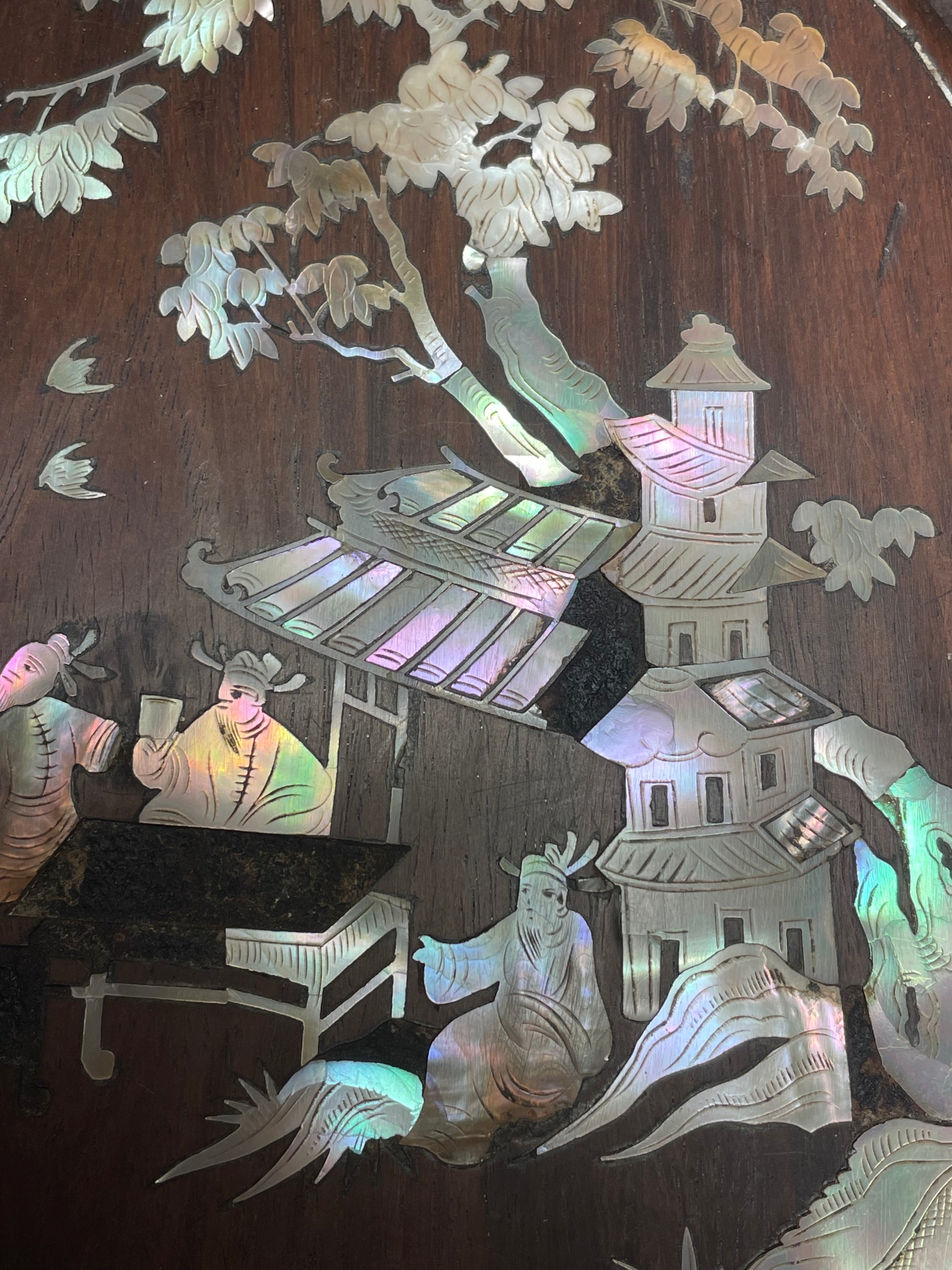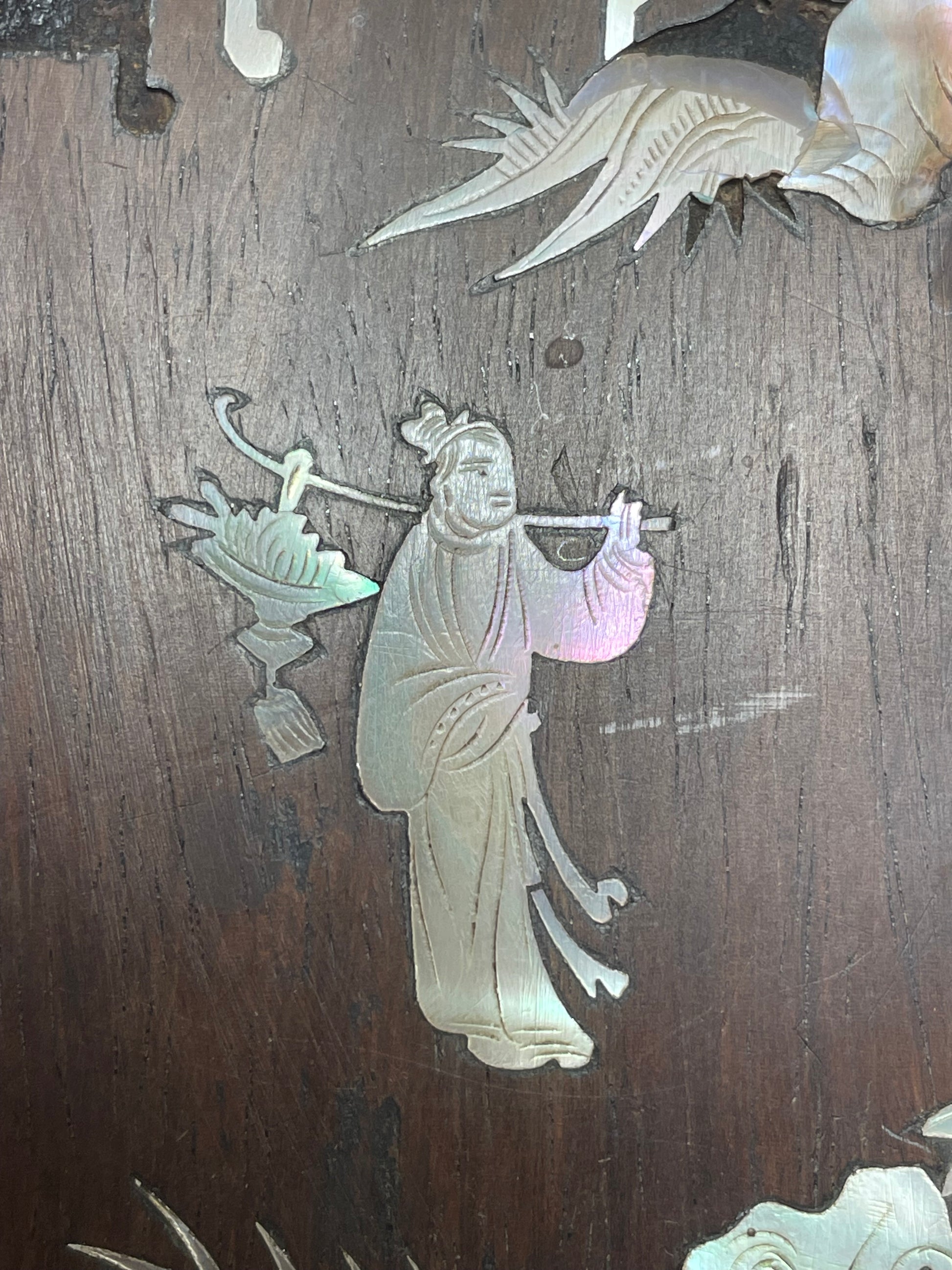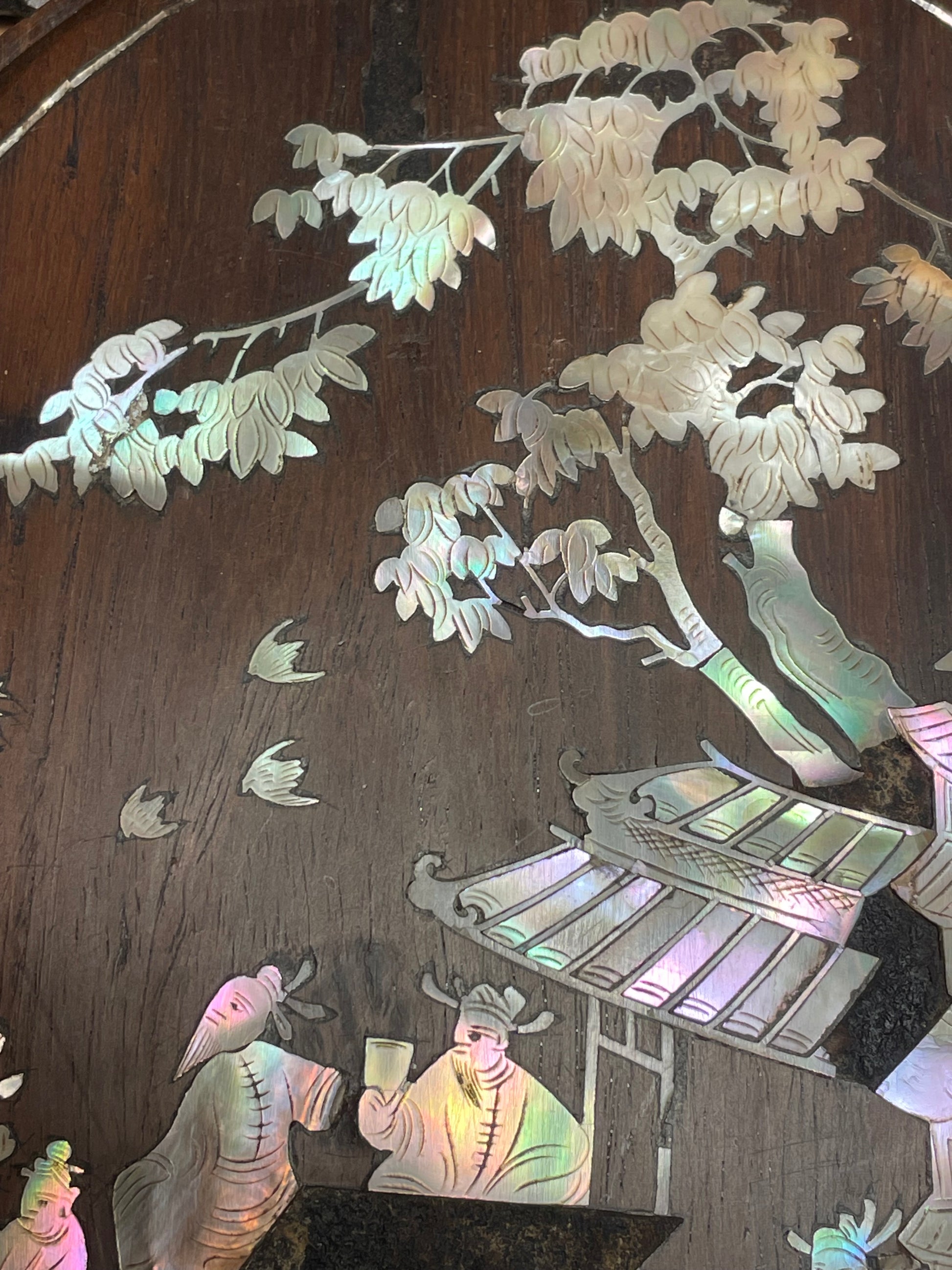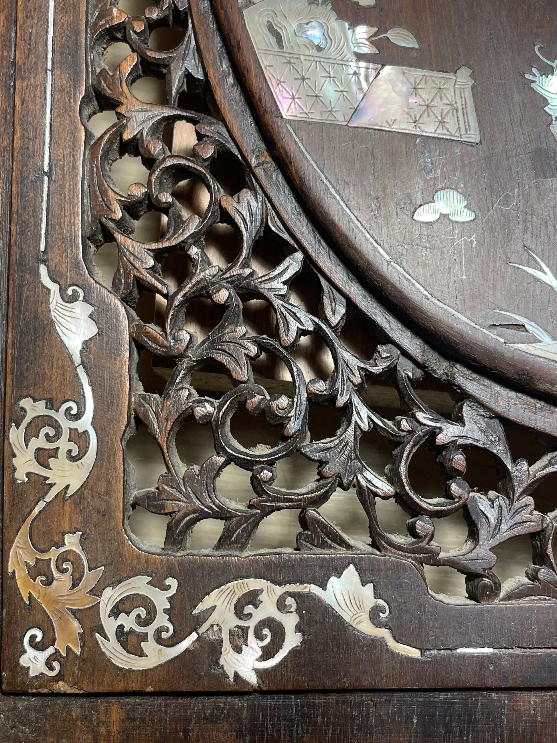 Area: Cina meridionale (prob. Guangdong). Epoca: Fine XIX secolo – primi decenni del XX (ca. 1880–1930). Intarsio in madreperla inciso a mano. Legno duro scuro (probabile palissandro/huanghuali comune). Dimensioni: 34,5 × 26,5 cm. Condizione: Buona; presenti mancanze nella madreperla, leggere fessurazioni nel legno e segni del tempo coerenti con l’epoca.