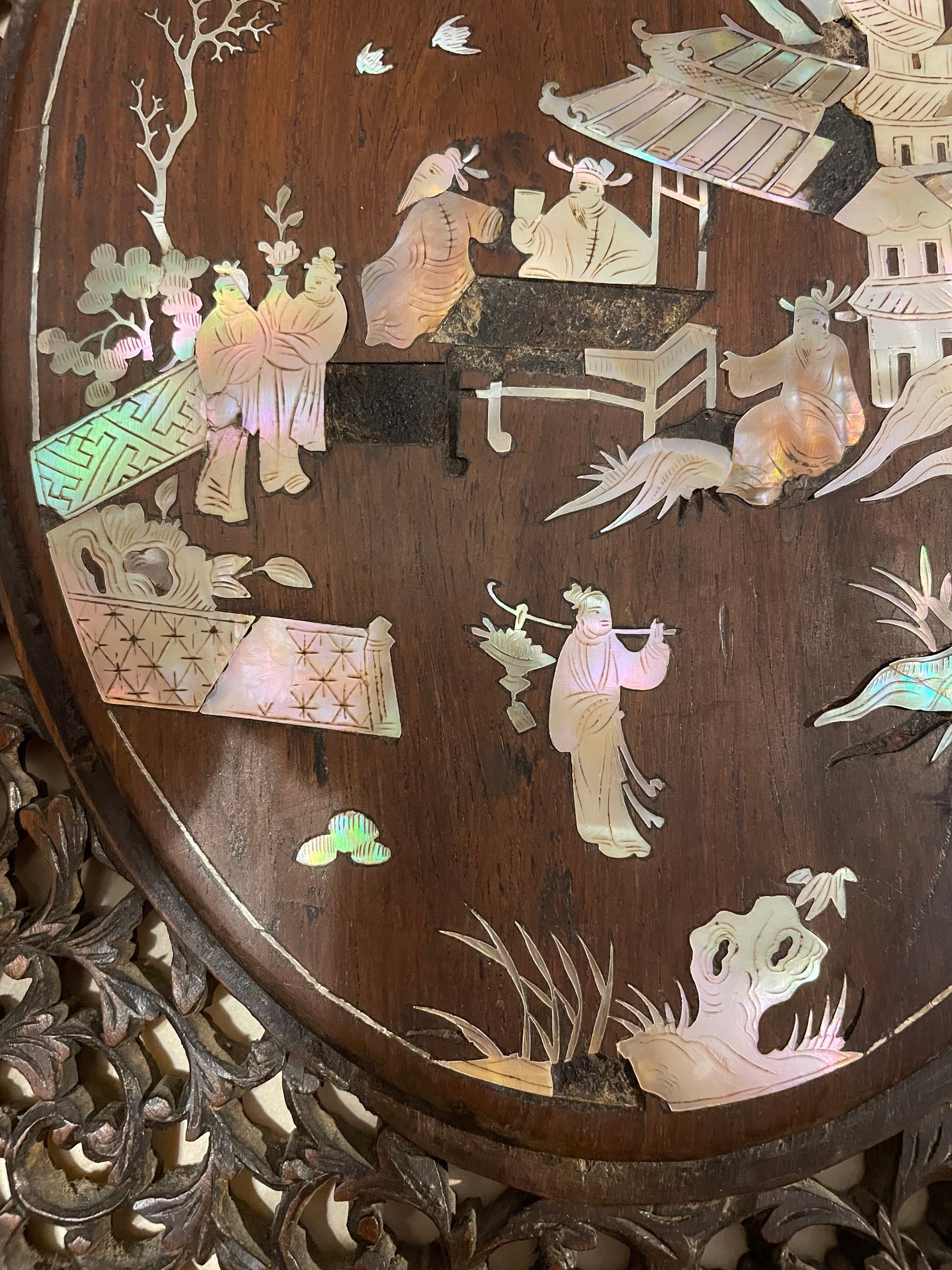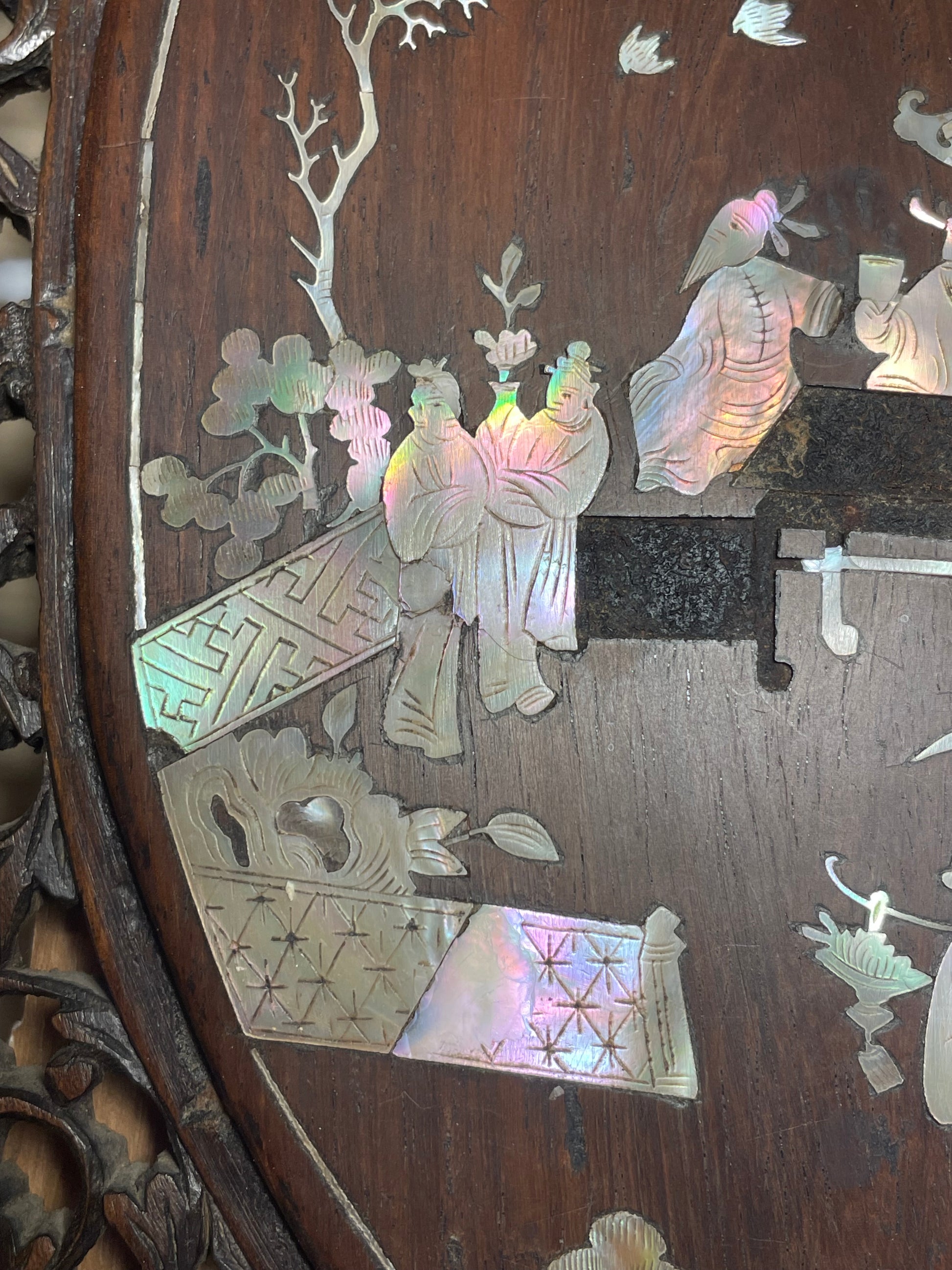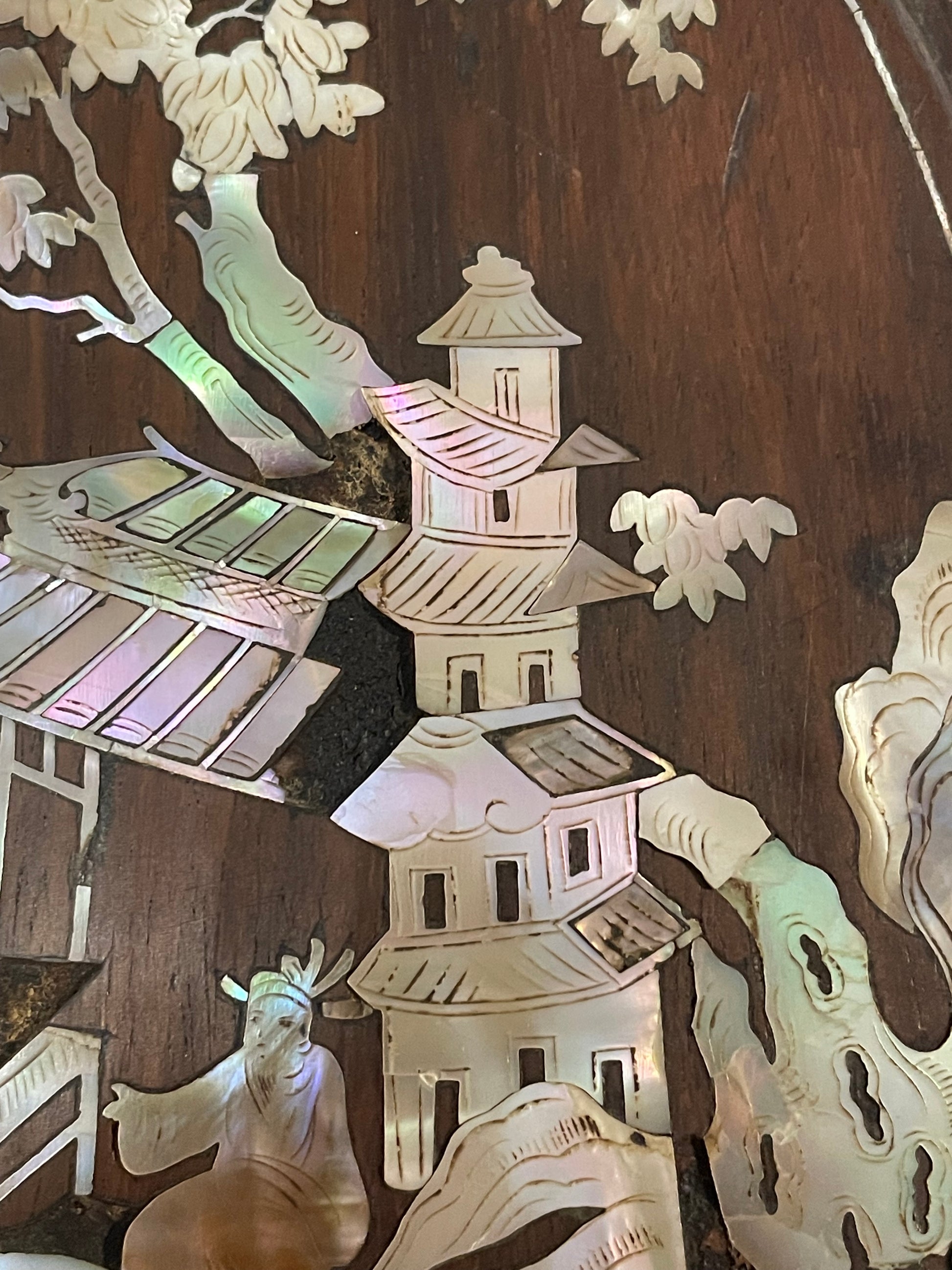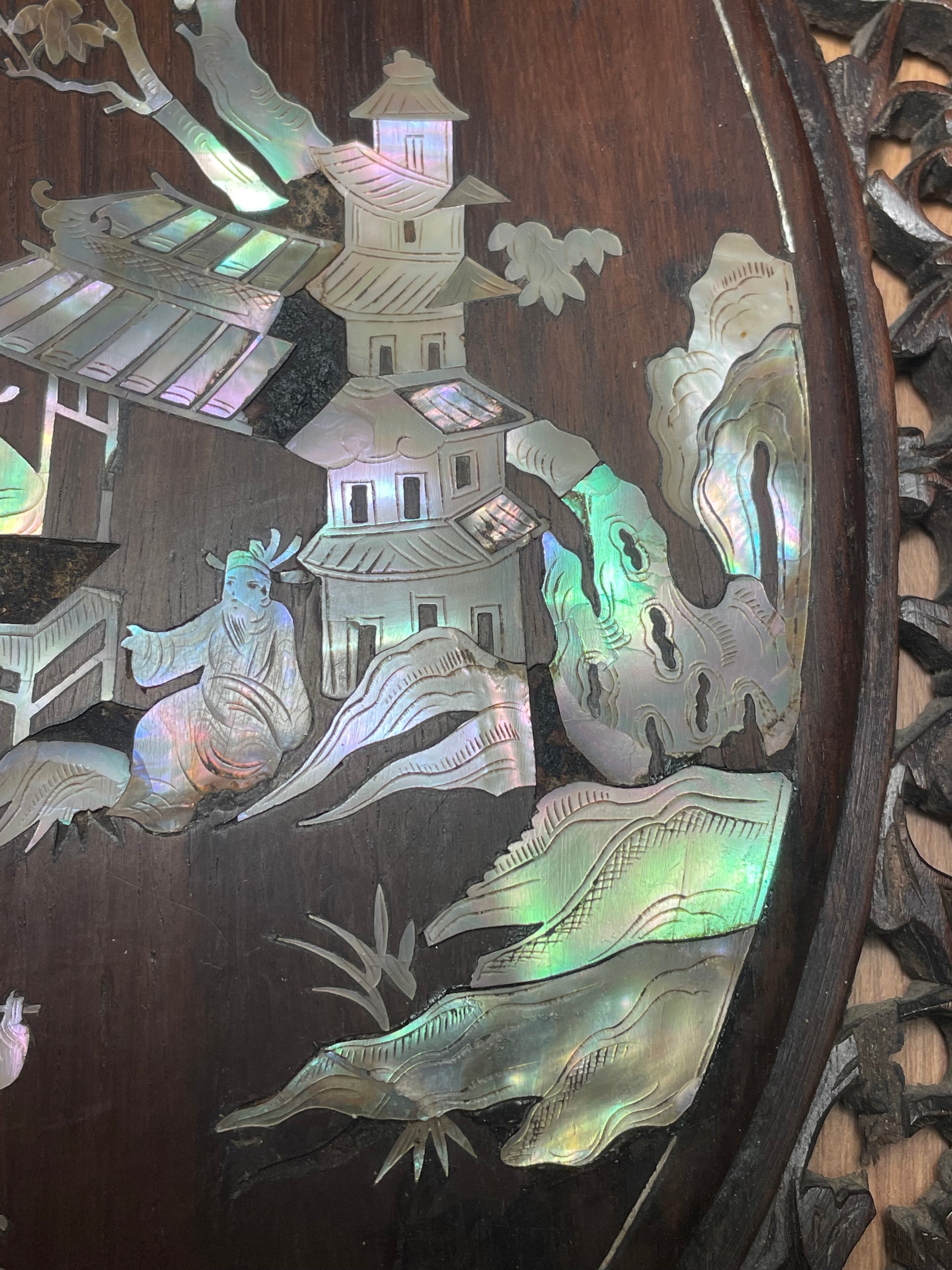 Area: Cina meridionale (prob. Guangdong). Epoca: Fine XIX secolo – primi decenni del XX (ca. 1880–1930). Intarsio in madreperla inciso a mano. Legno duro scuro (probabile palissandro/huanghuali comune). Dimensioni: 34,5 × 26,5 cm. Condizione: Buona; presenti mancanze nella madreperla, leggere fessurazioni nel legno e segni del tempo coerenti con l’epoca.