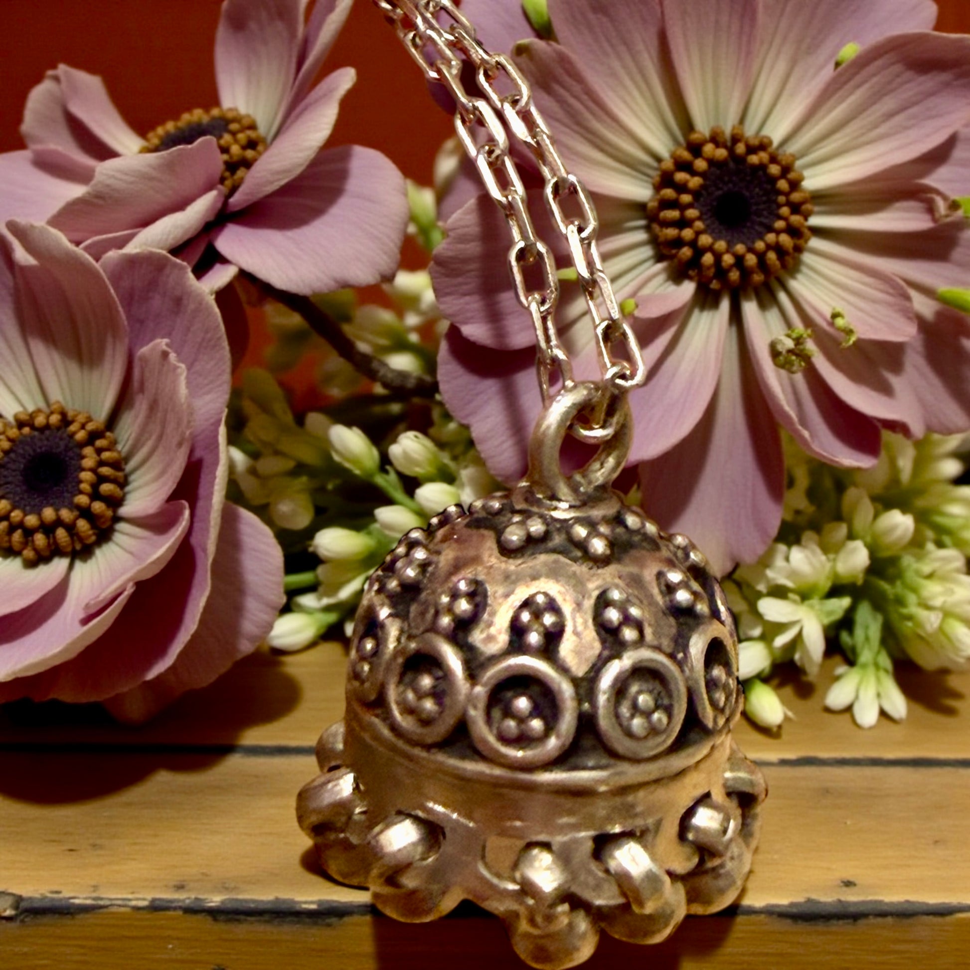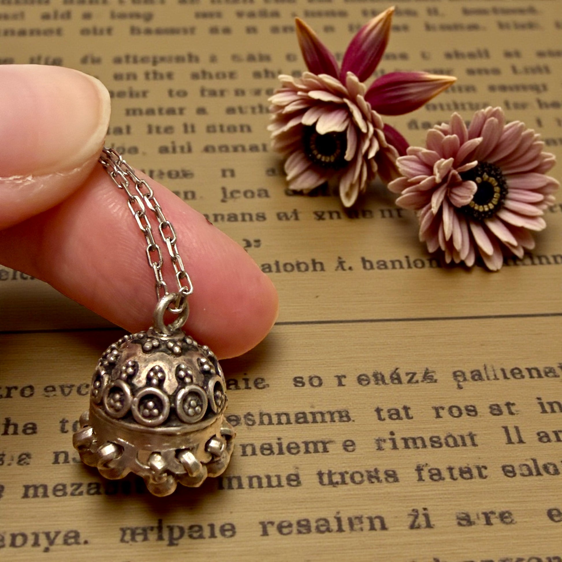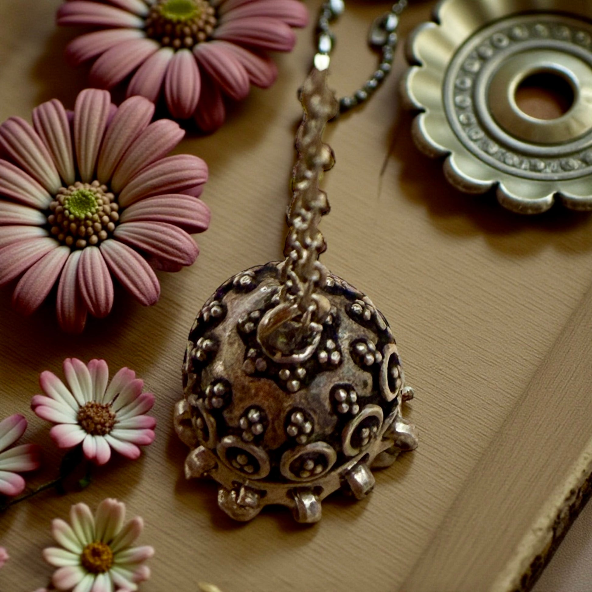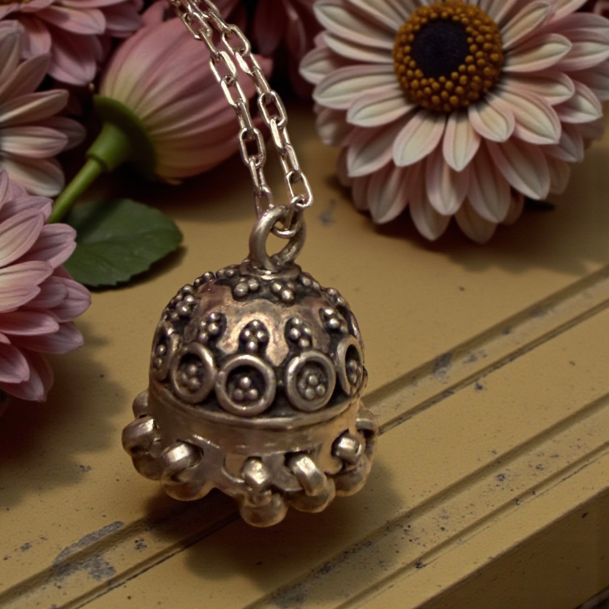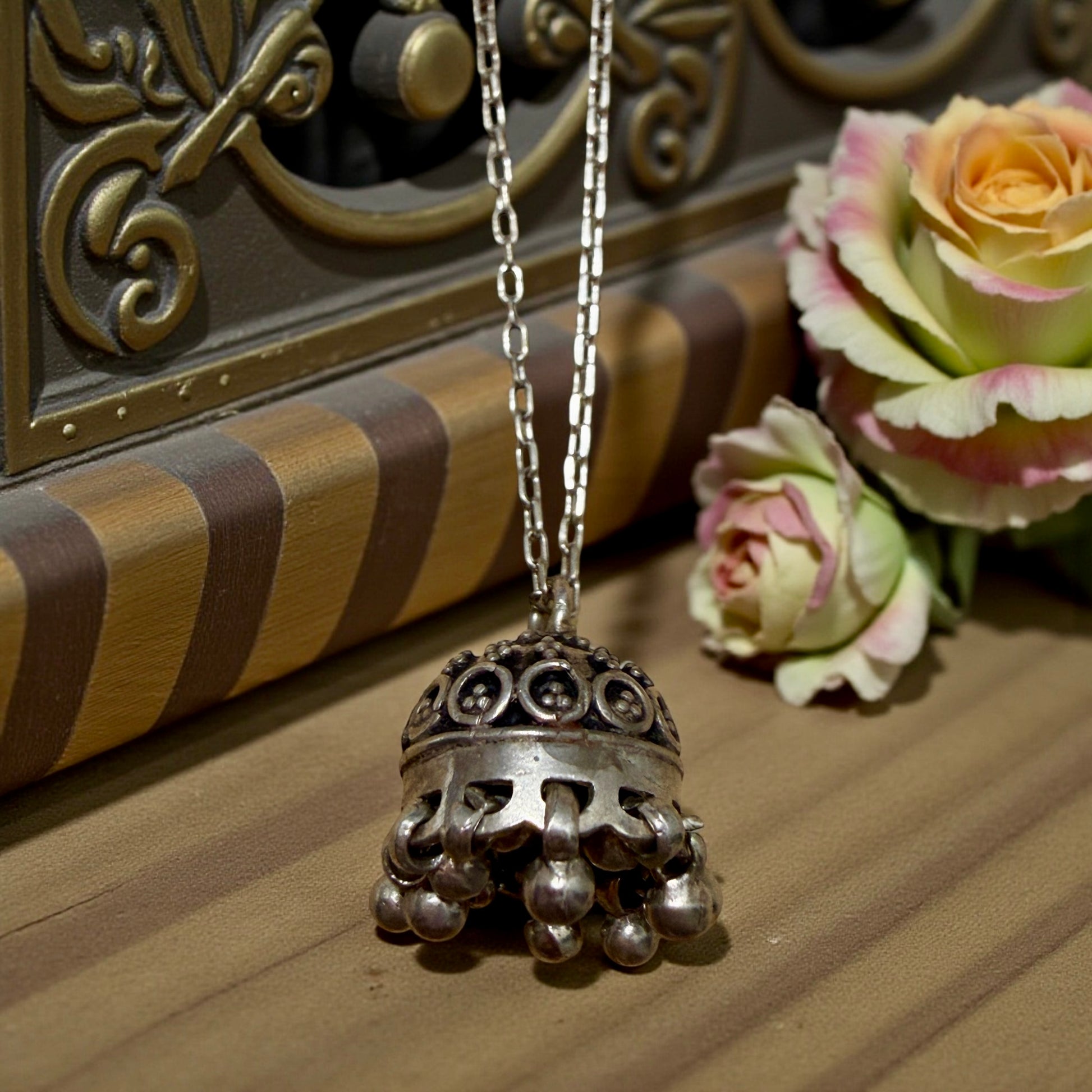 Il chiama angeli non contiene nulla e non si apre: la sua forza è tutta nel movimento e nel suono, discreto ma costante, come una presenza che veglia. La struttura a cupola, la decorazione a motivi circolari e la corona di piccoli pendagli sferici mobili raccontano una gioielleria popolare artigianale, fatta per essere indossata ogni giorno, vicino al cuore, nei momenti più delicati della vita. La catenella è moderna, in argento 925 di produzione italiana: non è coeva al pendente, ma è stata scelta per valorizzarlo con rispetto, senza alterarne l’identità, permettendogli di continuare a raccontare la propria storia. Oggi questo oggetto desidera regalare il suo suono lieve, che parla di protezione, di cura e di un tempo in cui anche l’invisibile aveva un posto nella vita quotidiana.