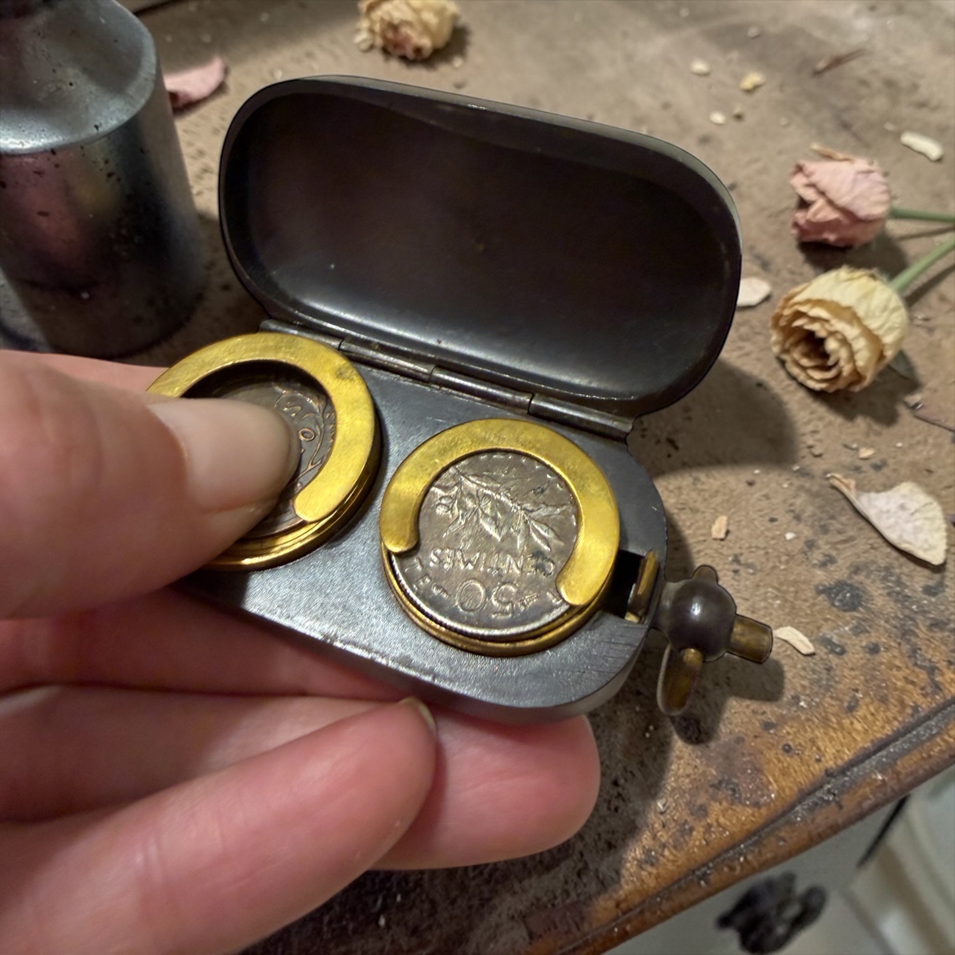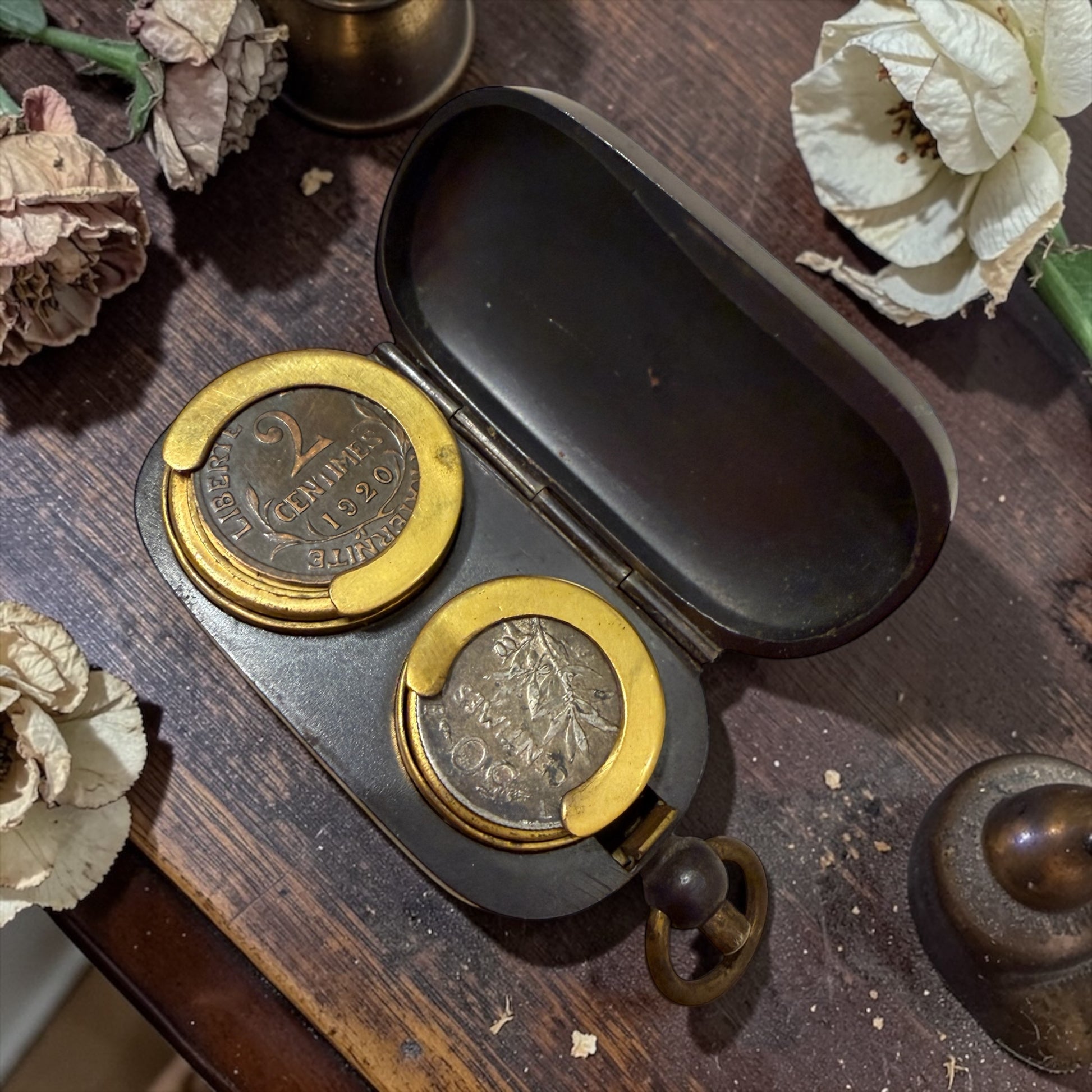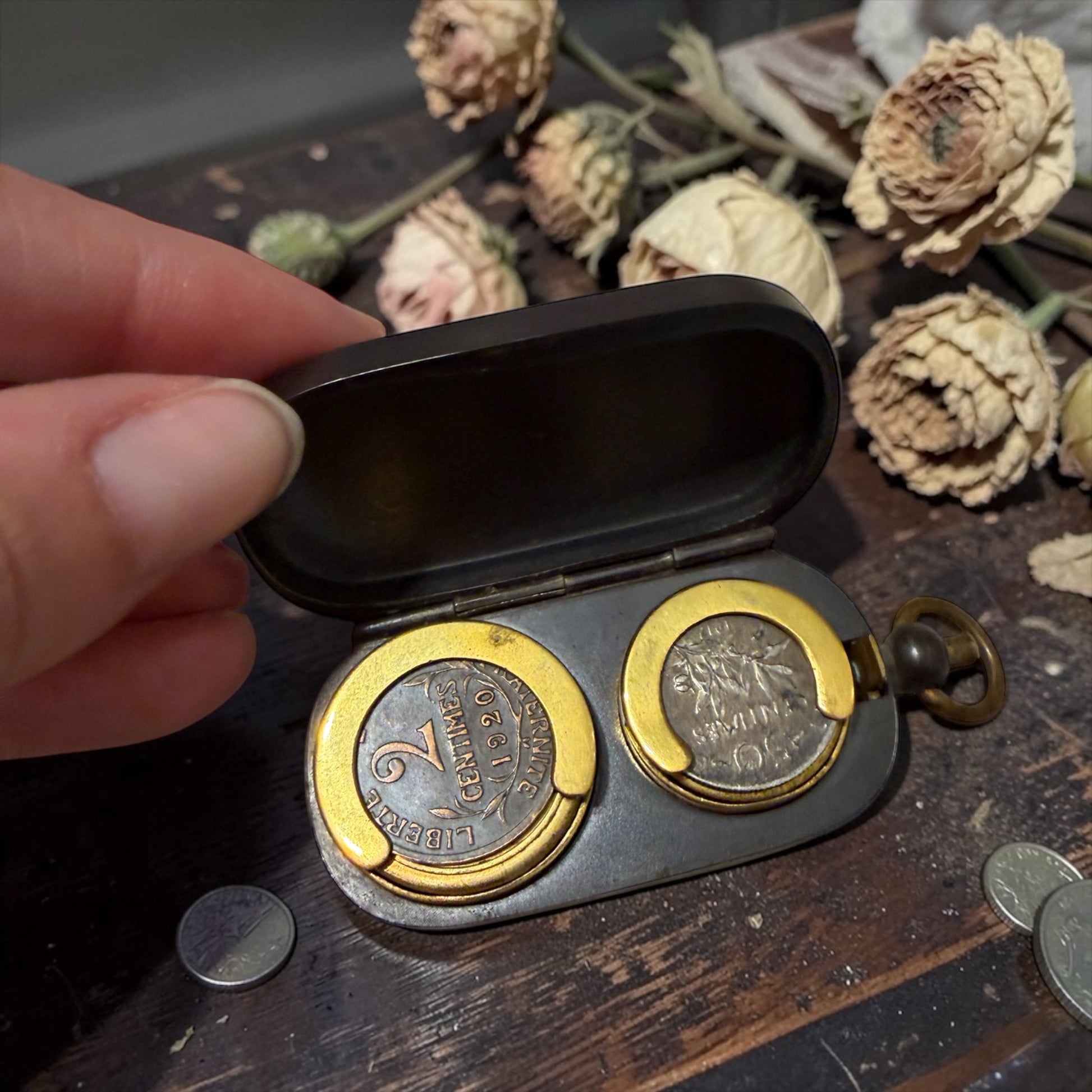All’interno sono presenti monete francesi degli anni ’20, perfettamente coerenti con l’epoca e con la provenienza dell’oggetto, che aiutano a capire come veniva utilizzato.
