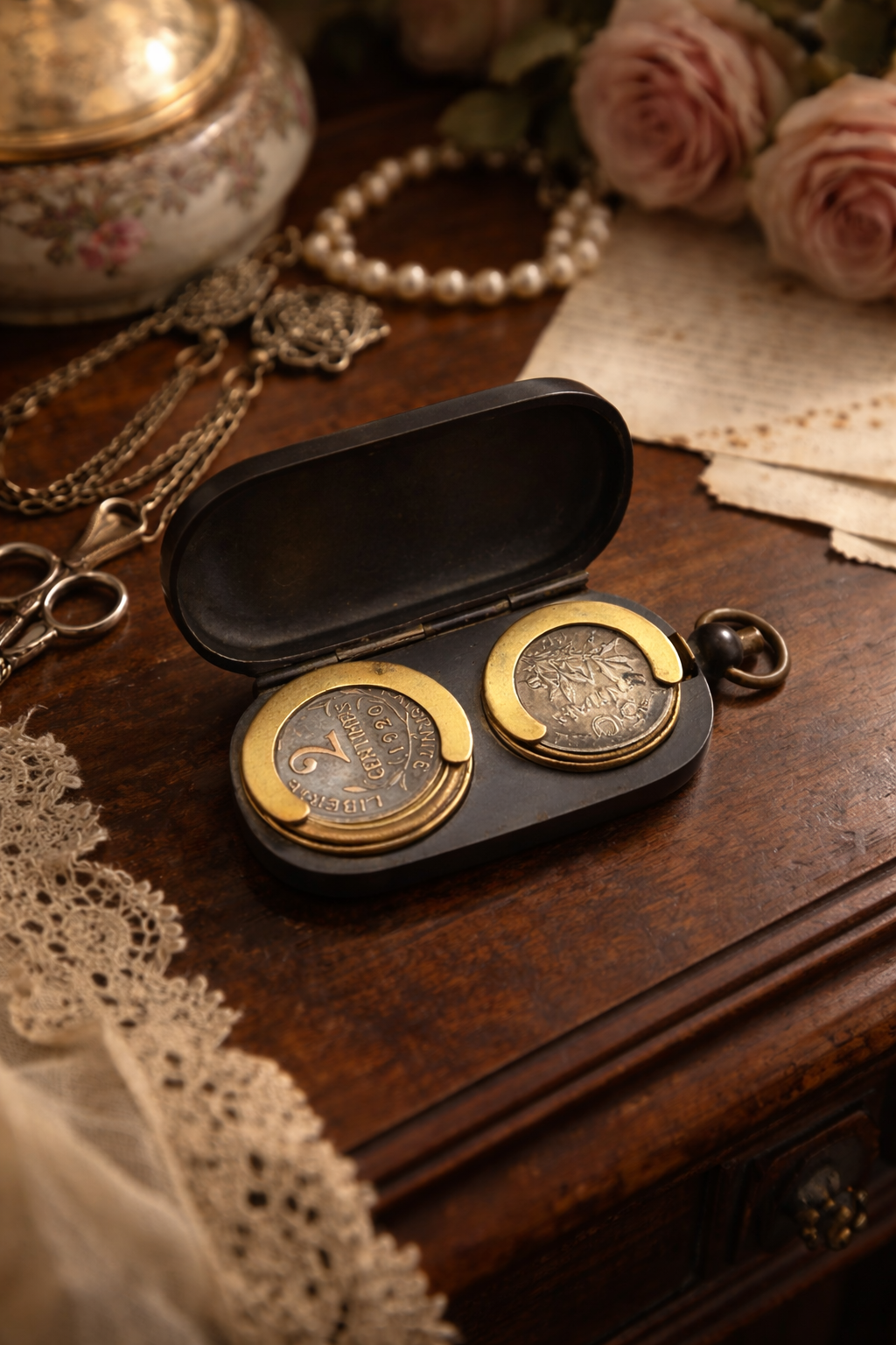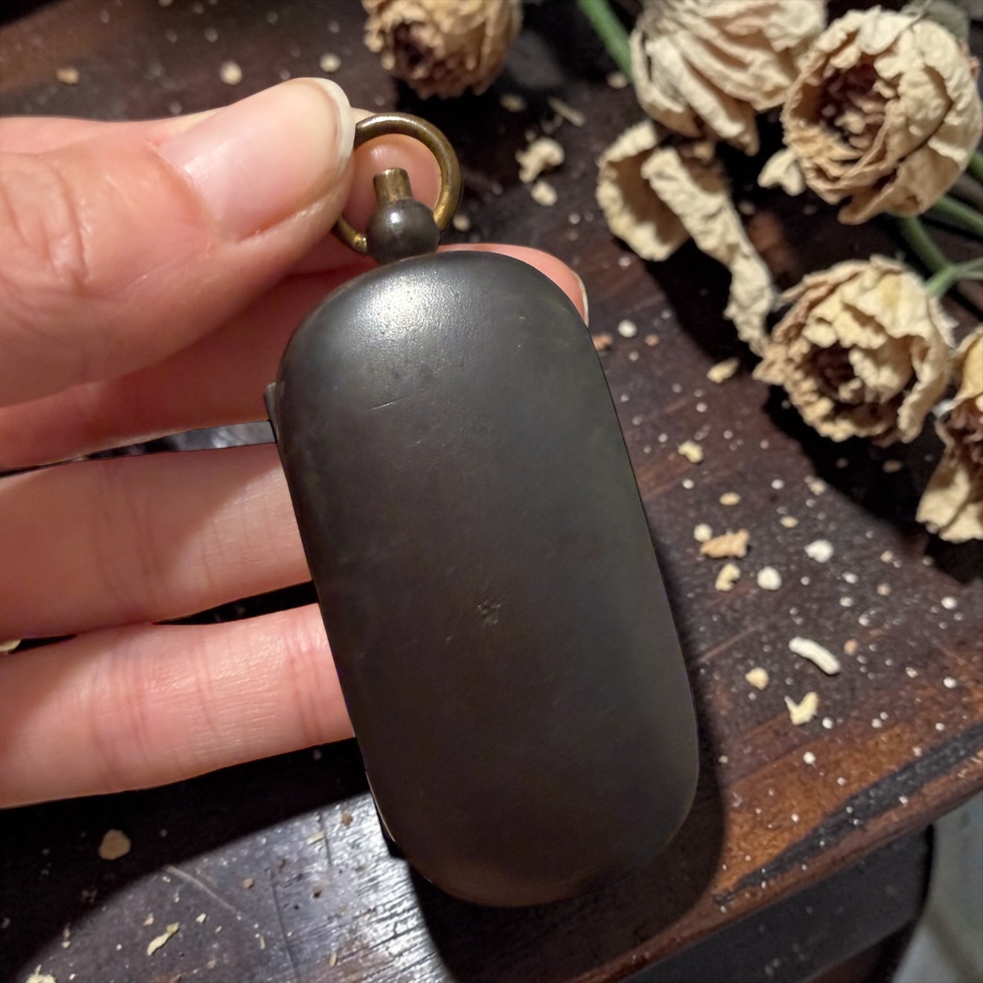 La finitura non è ossidazione, ma brunitura voluta, scelta proprio per rendere l’oggetto discreto, elegante quando chiuso. Ed è proprio questo il suo fascino. Chi lo indossava poteva portarlo appeso alla cintura, alla catena, oppure al collo come piccolo pendente. Da fuori regala una forma semplice, essenziale. Solo aprendolo si rivelava il meccanismo nascosto.