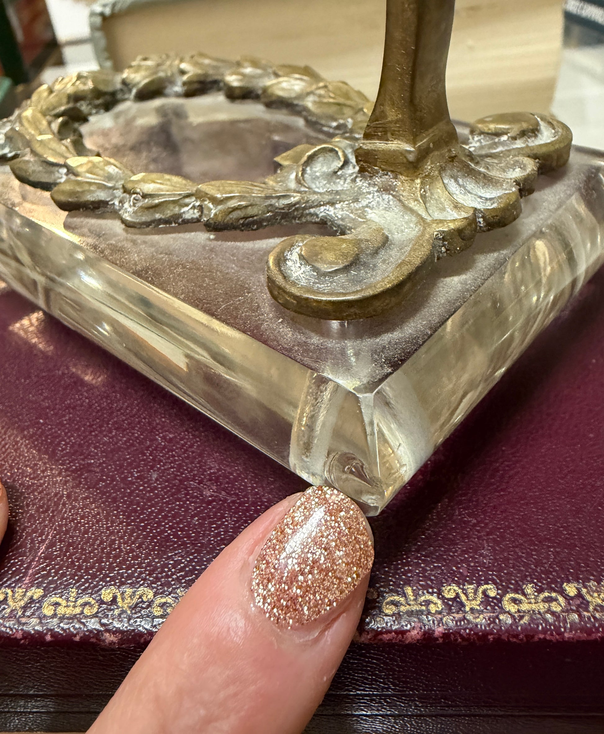La base in vetro massiccio, molato sui bordi, cattura la luce e la trattiene. Non è un vetro leggero: è pieno, compatto, stabile. Sopra, una ghirlanda di foglie in rilievo — fusione decorativa dal sapore liberty — incornicia il centro come un piccolo alloro silenzioso. C’è una piccola scheggiatura ad un angolo posteriore (foto dedicata) che non impatta.