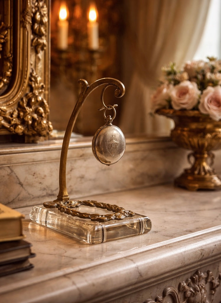 La struttura si solleva con una curva morbida, quasi botanica, e termina in un ricciolo che accoglie l’orologio. È un gesto elegante, naturale, senza rigidità. L’elemento non negoziabile qui è la combinazione vetro pieno + struttura decorativa vegetale.