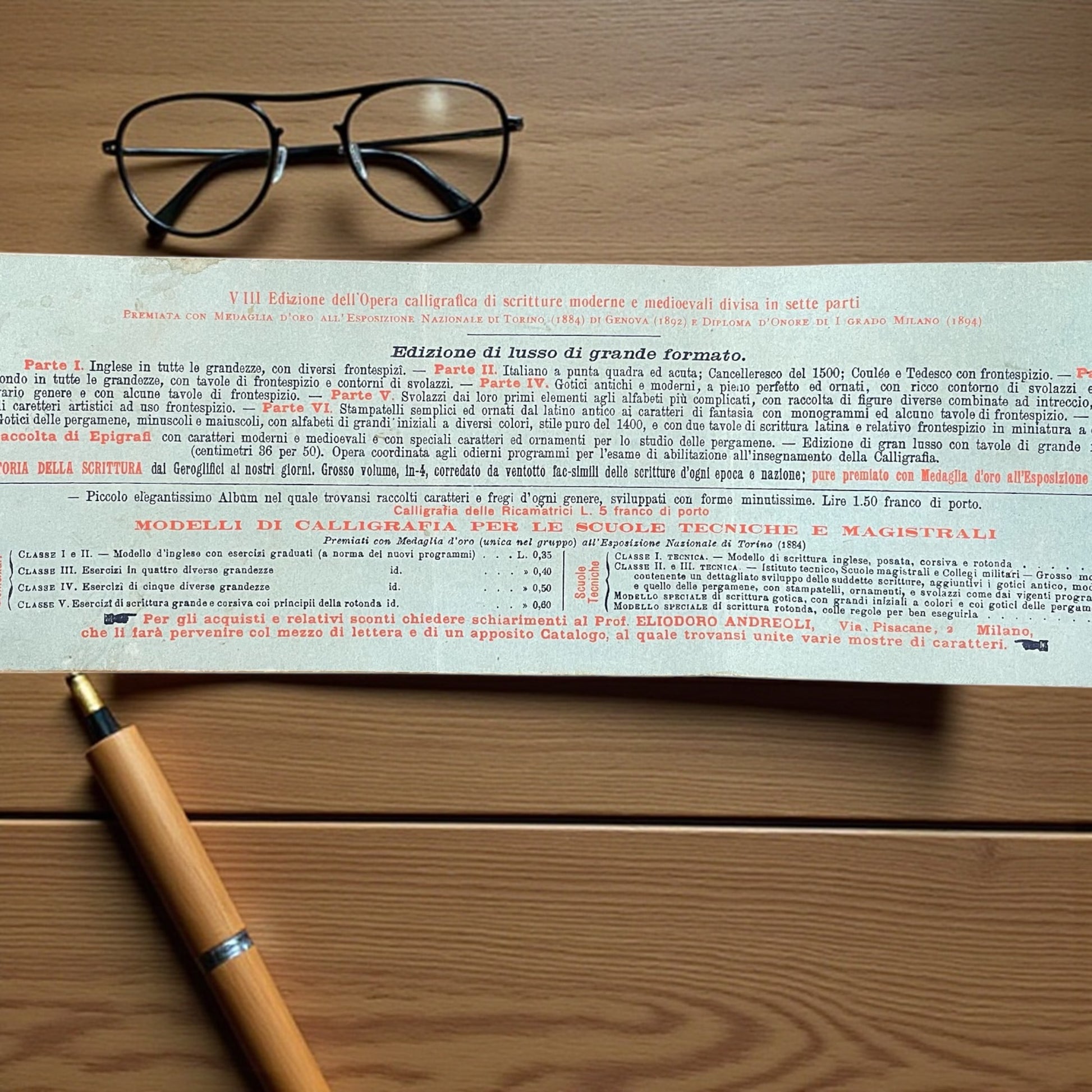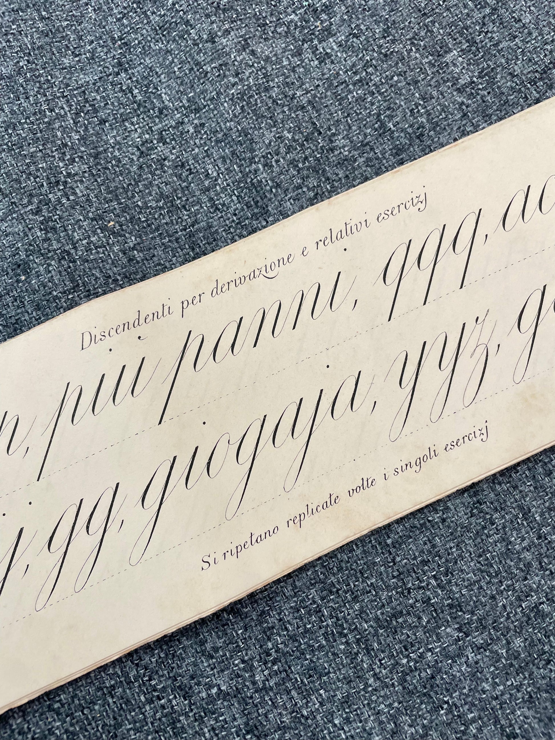 C’è grande fascino discreto in questo antico quaderno di calligrafia: pagine lunghe e strette, pensate per accompagnare il gesto della mano, per educare non solo alla scrittura ma alla grazia. Questo Modello di Calligrafia del Prof. Eliodoro Andreoli, edito da Paravia tra la fine dell’Ottocento e i primi del Novecento, conserva intatto il respiro lento di un’epoca in cui la bellezza della parola scritta era considerata parte dell’anima. Le lettere eleganti, tracciate con precisione quasi musicale, seguono linee sottili e curve armoniose: l’alfabeto diventa danza, la mano obbedisce al ritmo della mente. Ogni esercizio invita alla disciplina e alla pazienza — virtù che oggi sembrano perdute — mentre la copertina, stampata in rosso e blu su carta celeste, testimonia l’estetica raffinata della tipografia scolastica di fine secolo. Nato per le Scuole Tecniche e Magistrali, questo fascicolo venne adottato in oltre duecento istituti italiani, segno della straordinaria influenza didattica di Andreoli, premiato con medaglie d’oro alle esposizioni di Torino 1884, Genova 1892 e Milano 1894. Tra le sue pagine, ancora oggi, sembra di sentire il fruscio delle penne d’oca, il profumo dell’inchiostro, la concentrazione silenziosa degli allievi chini sui banchi di legno lucidato. Un frammento di scuola e di vita, sopravvissuto al tempo, che restituisce l’emozione di un passato in cui scrivere era un atto d’arte e di devozione.