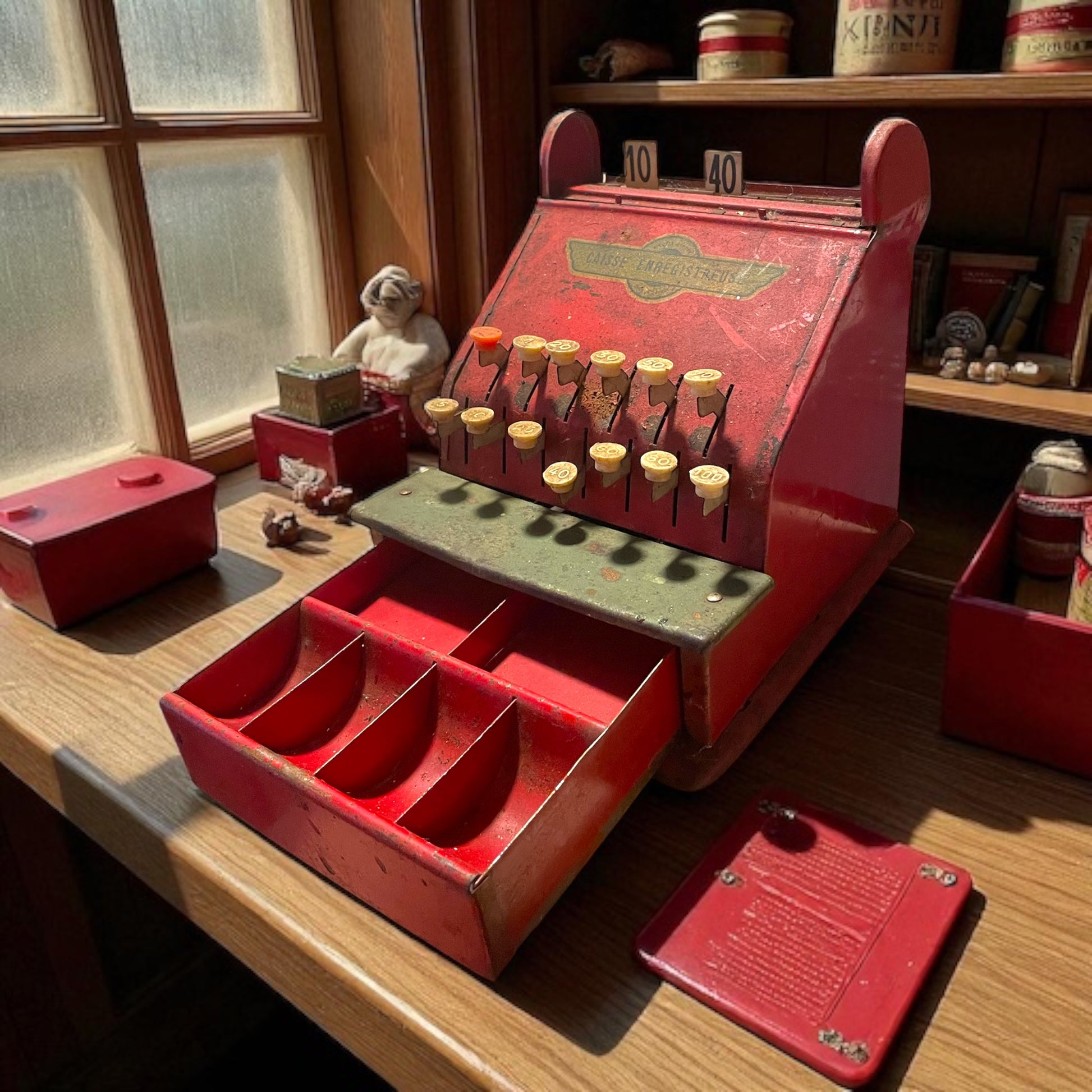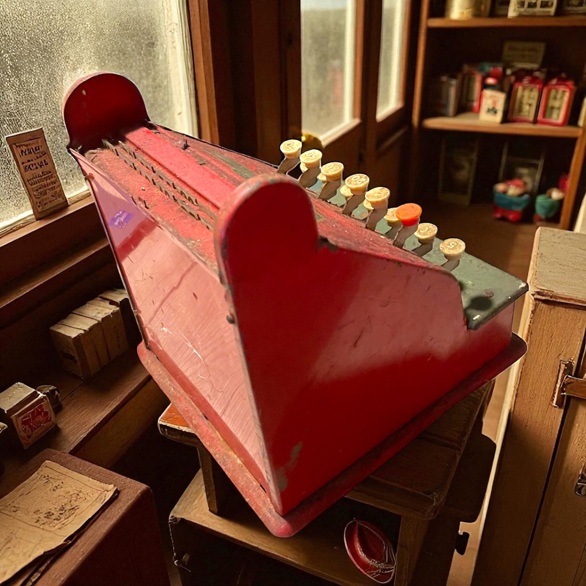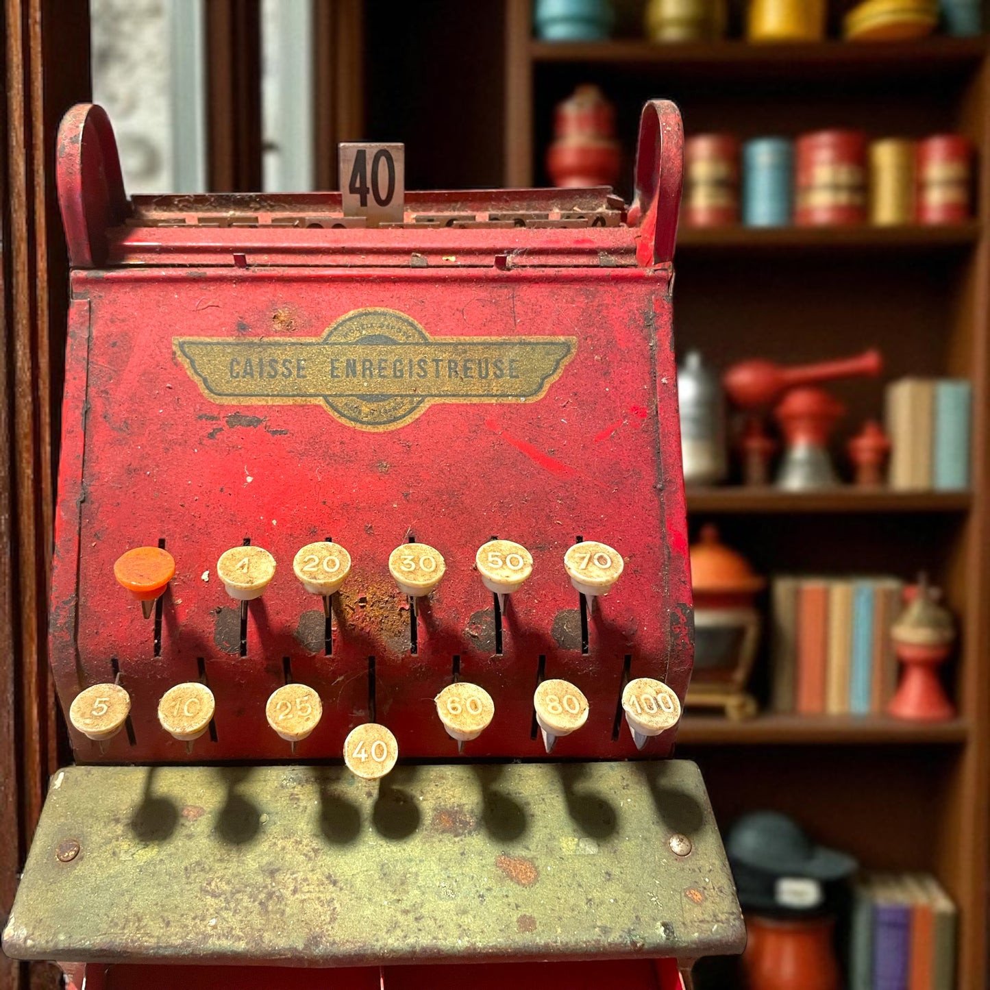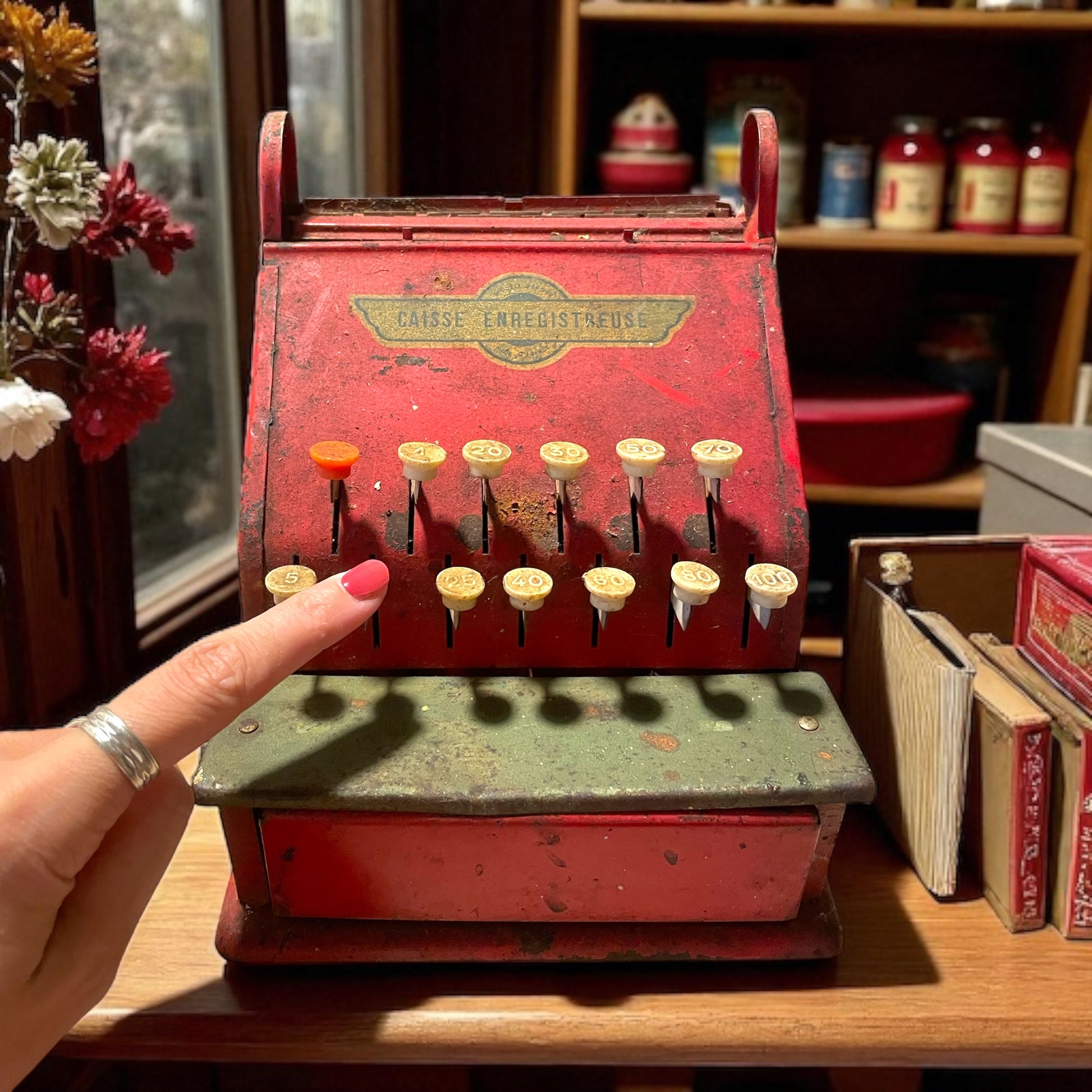Un tuffo nel negozio dei sogni! Ve lo ricordate il tempo in cui i registratori di cassa non erano schermi digitali, ma piccole macchine dal cuore meccanico? Questo esemplare in ferro rosso, con i suoi tasti consumati e il cassetto che si apre con un tenero drin, sembra raccontare pomeriggi d’infanzia passati a giocare al negozio, vendendo caramelle immaginarie e sogni veri. Ogni tasto che premi fa salire una bandierina numerata, come una piccola magia che riporta indietro nel tempo. Oggi può essere un pezzo da collezione, un oggetto d’arredo dal sapore vintage o un dono capace di far sorridere chi crede che i ricordi abbiano un suono… come me! Ogni volta, per chiudere il cassetto, spingi giù la bandierina in metallo e chiudilo. Poi ricomincia da capo a vendere tutto ciò che immagini…. Se lo immagini, puoi!! ❤️
