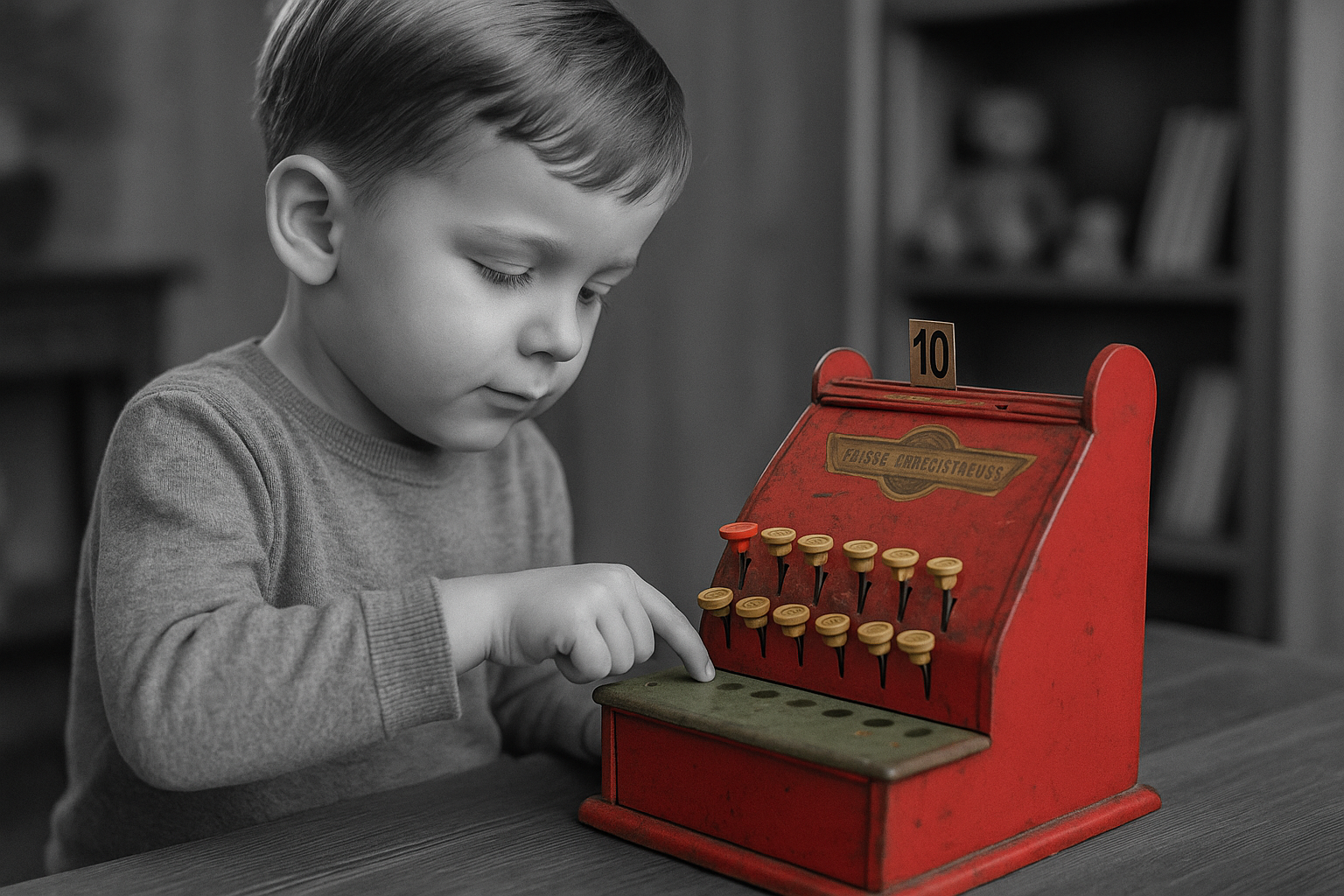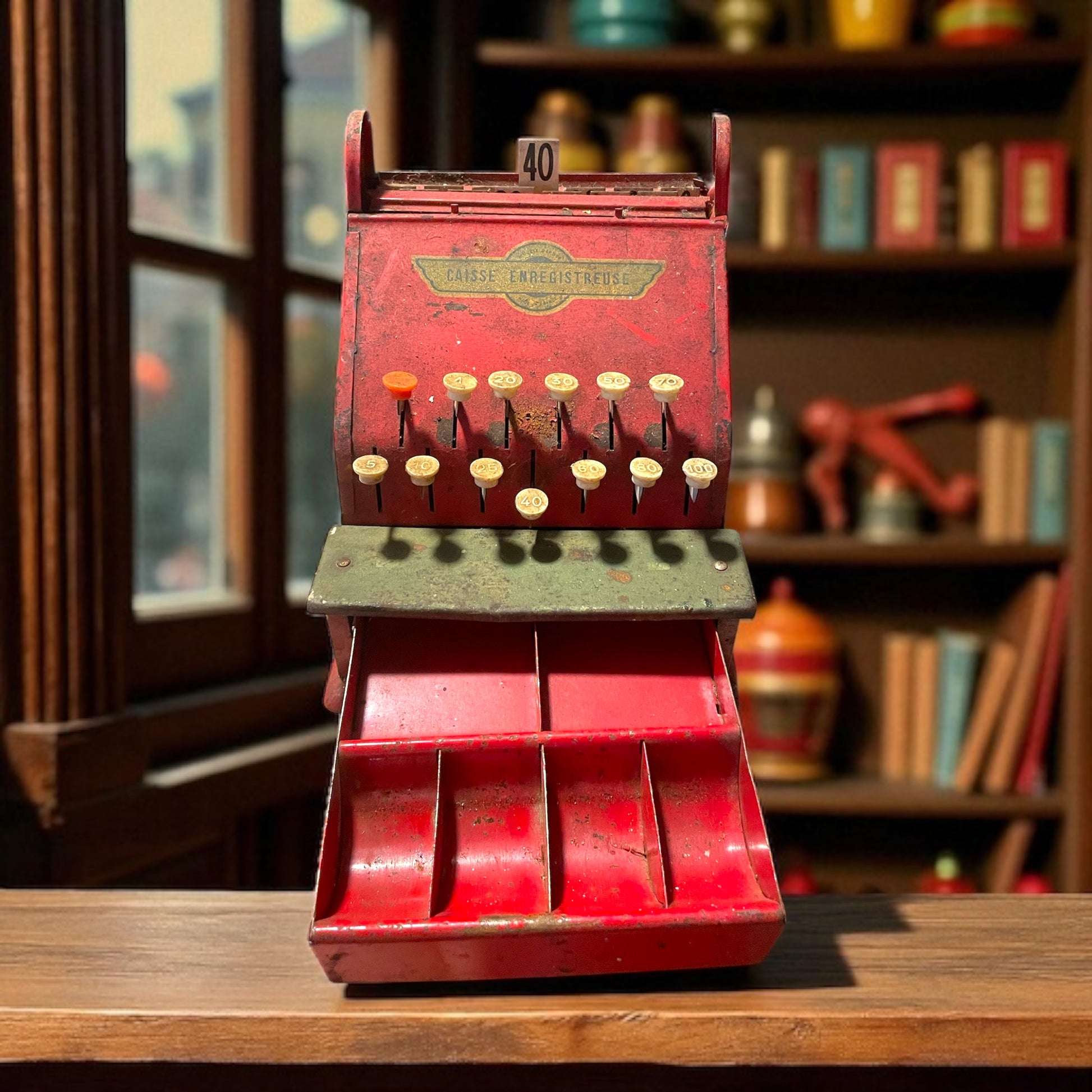 Antico registratore di cassa giocattolo metallo vintage, funzionante, anni ‘50