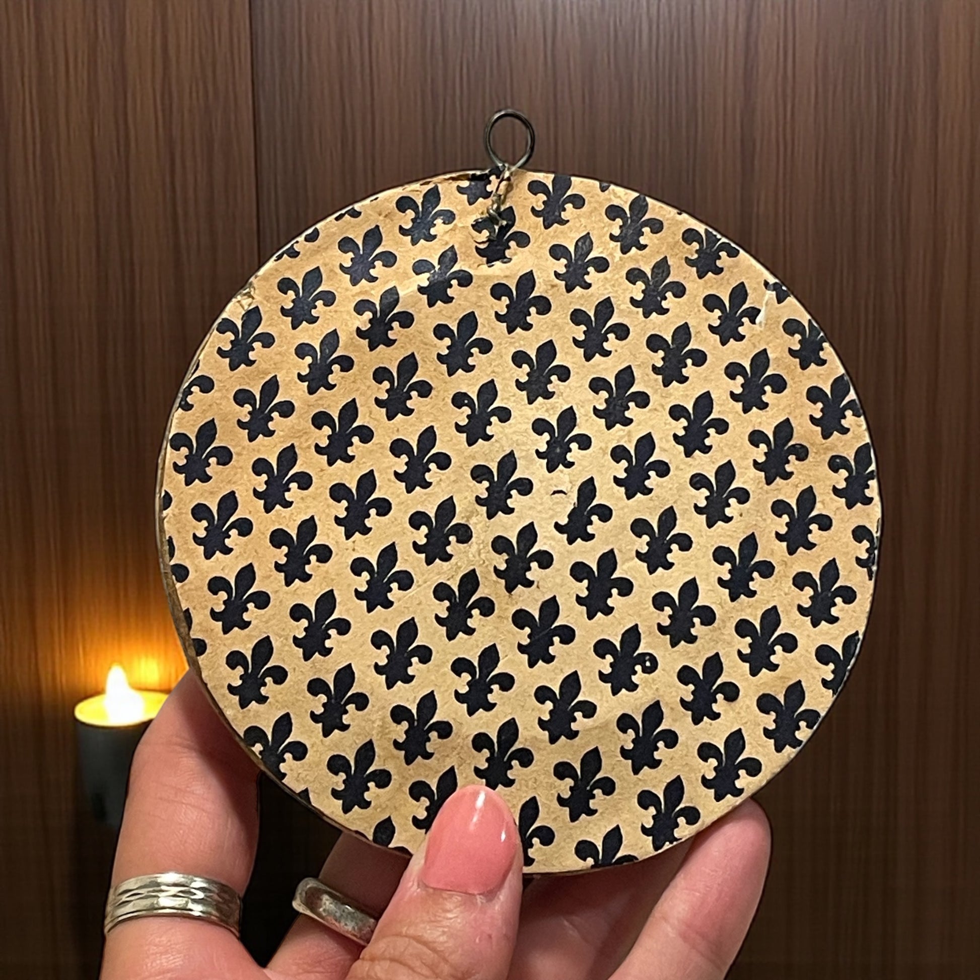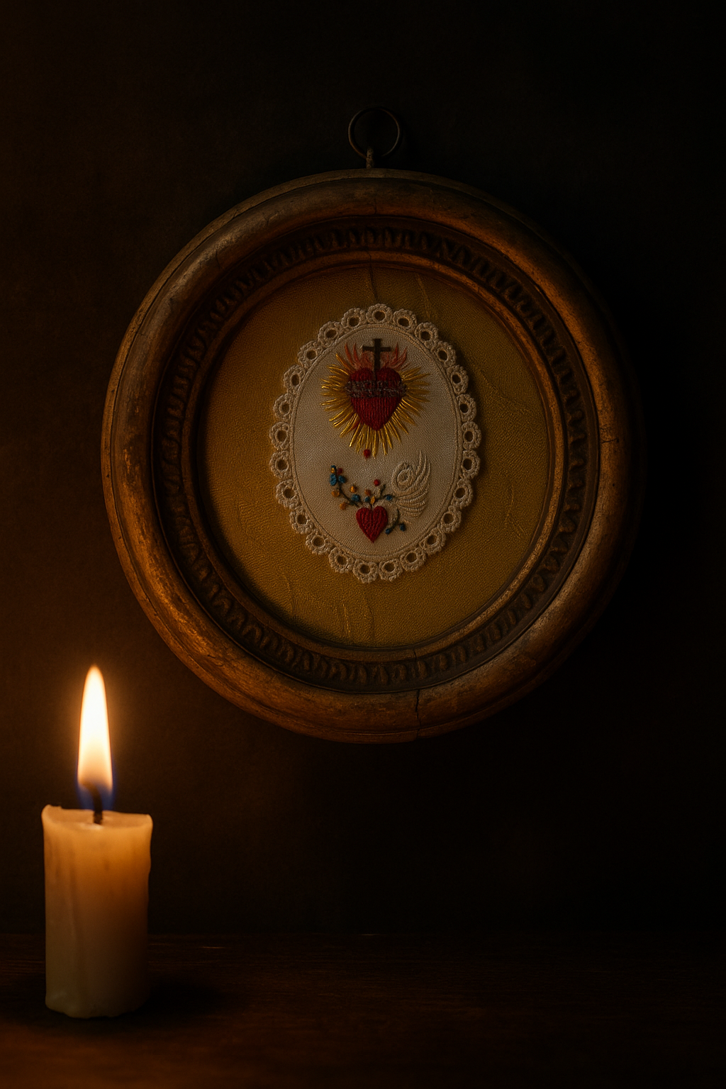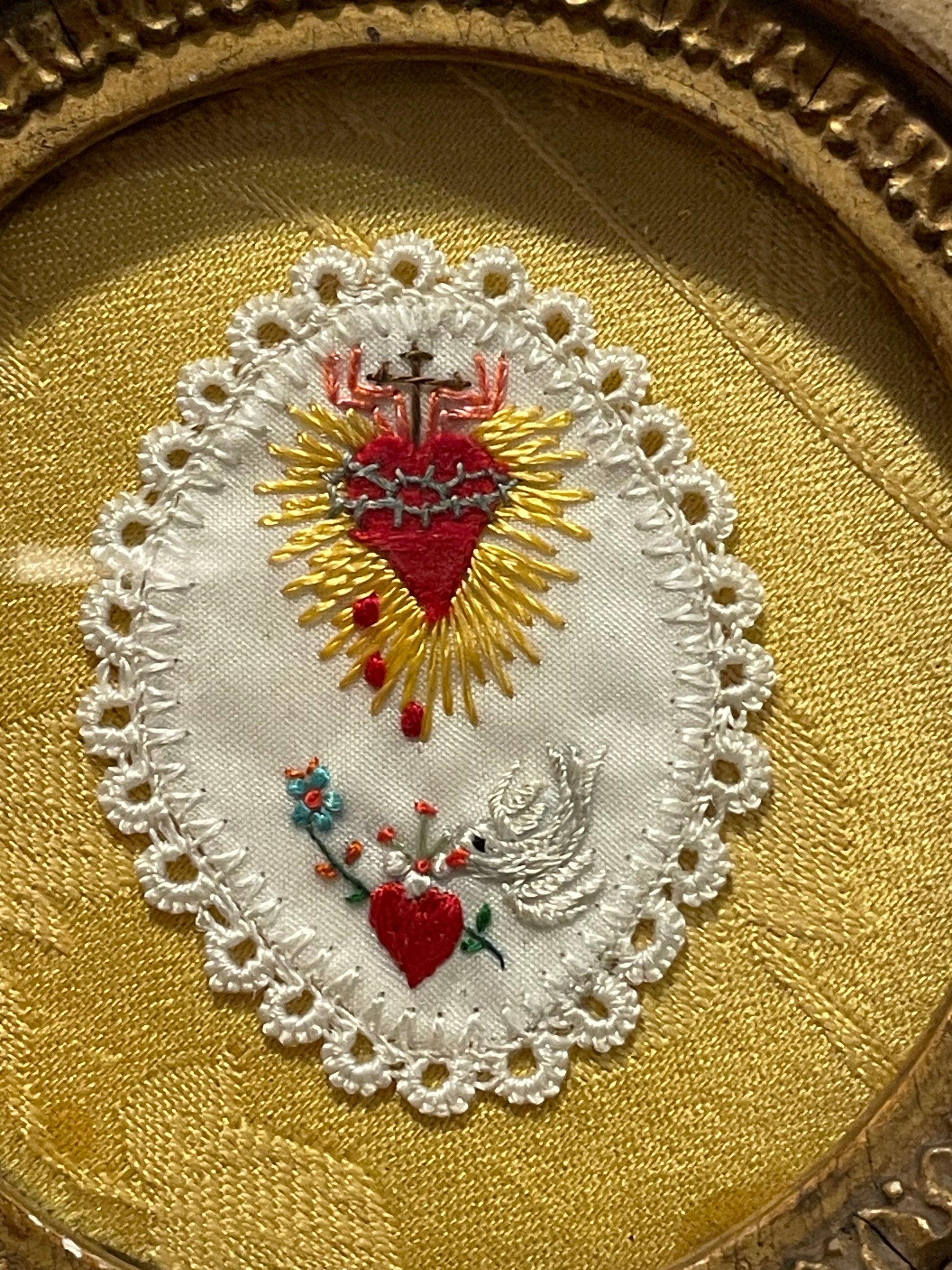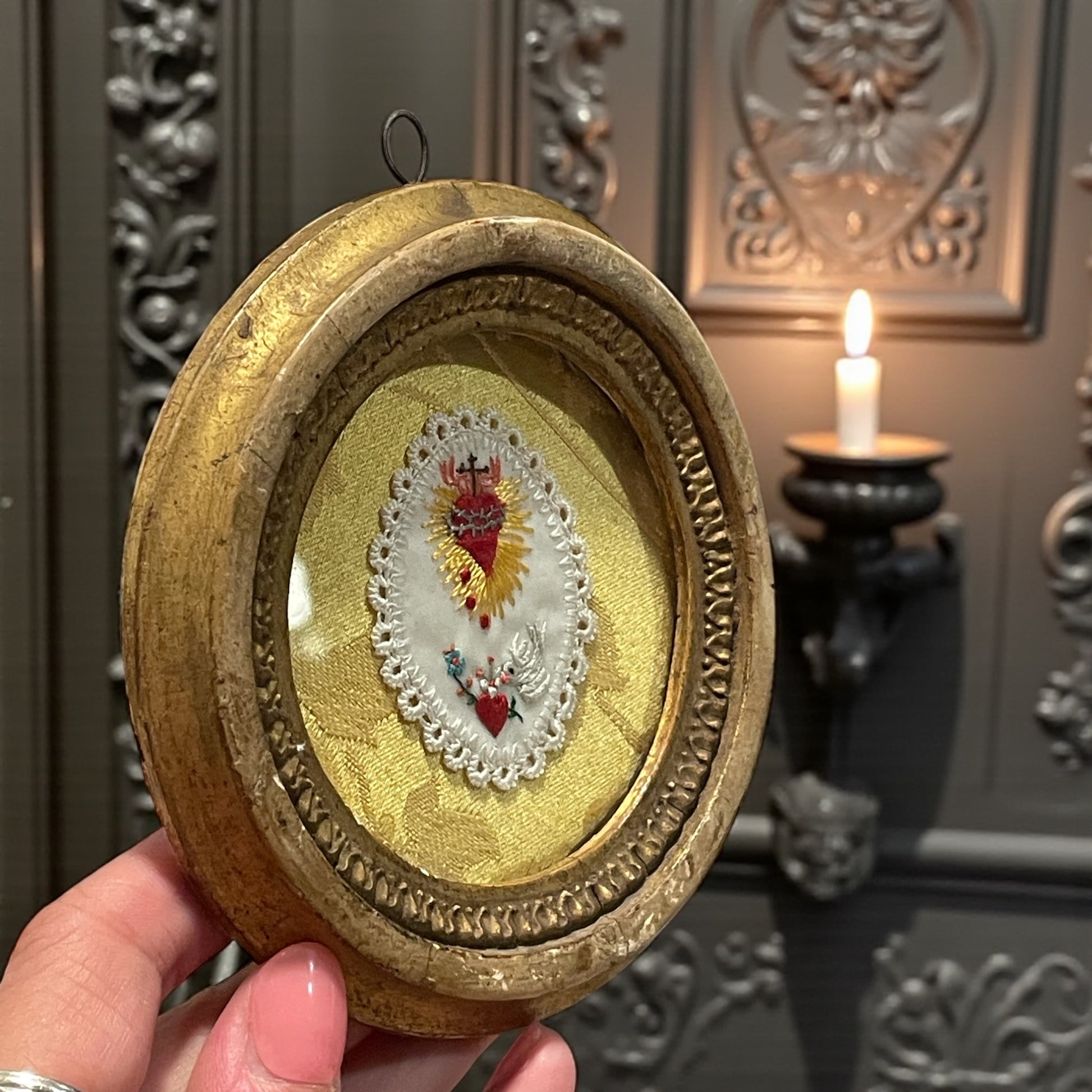 C’è qualcosa di profondamente intimo in questi piccoli quadretti devozionali: non erano pensati per le chiese, ma per le case. Venivano appesi sopra il letto, nella stanza principale o in un angolo dedicato alla preghiera, a protezione della famiglia e della casa. Questo raffinato ricamo, realizzato a mano tra la fine dell’Ottocento e i primi decenni del Novecento, rappresenta due simboli centrali della spiritualità cattolica: il Sacro Cuore di Gesù, avvolto da raggi dorati, sormontato dalla croce e cinto di spine — emblema dell’amore divino che si dona nel dolore — e, poco sotto, il Cuore Immacolato di Maria, trafitto e accompagnato da una rosa bianca, segno di purezza e compassione. Il ricamo è custodito sotto una lastra di vetro spessa, incorniciato in una cornice originale in legno dorato, con il retro foderato in carta decorata a gigli neri: un dettaglio elegante e tipico dell’epoca. Oggetti come questo venivano spesso donati in occasione di sacramenti, consacrazioni familiari o come segno di protezione domestica, e venivano conservati con grande cura di generazione in generazione. Osservandolo, è facile immaginare il silenzio di una stanza di fine Ottocento, la luce fioca di una candela, e una preghiera sussurrata davanti a questa piccola immagine, ponte tra la terra e il cielo ✨