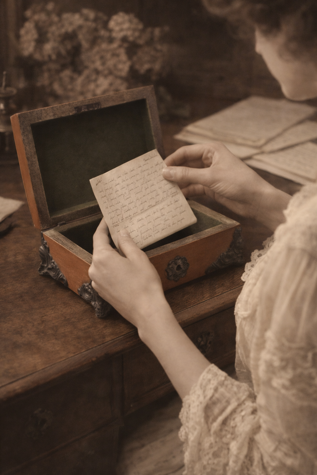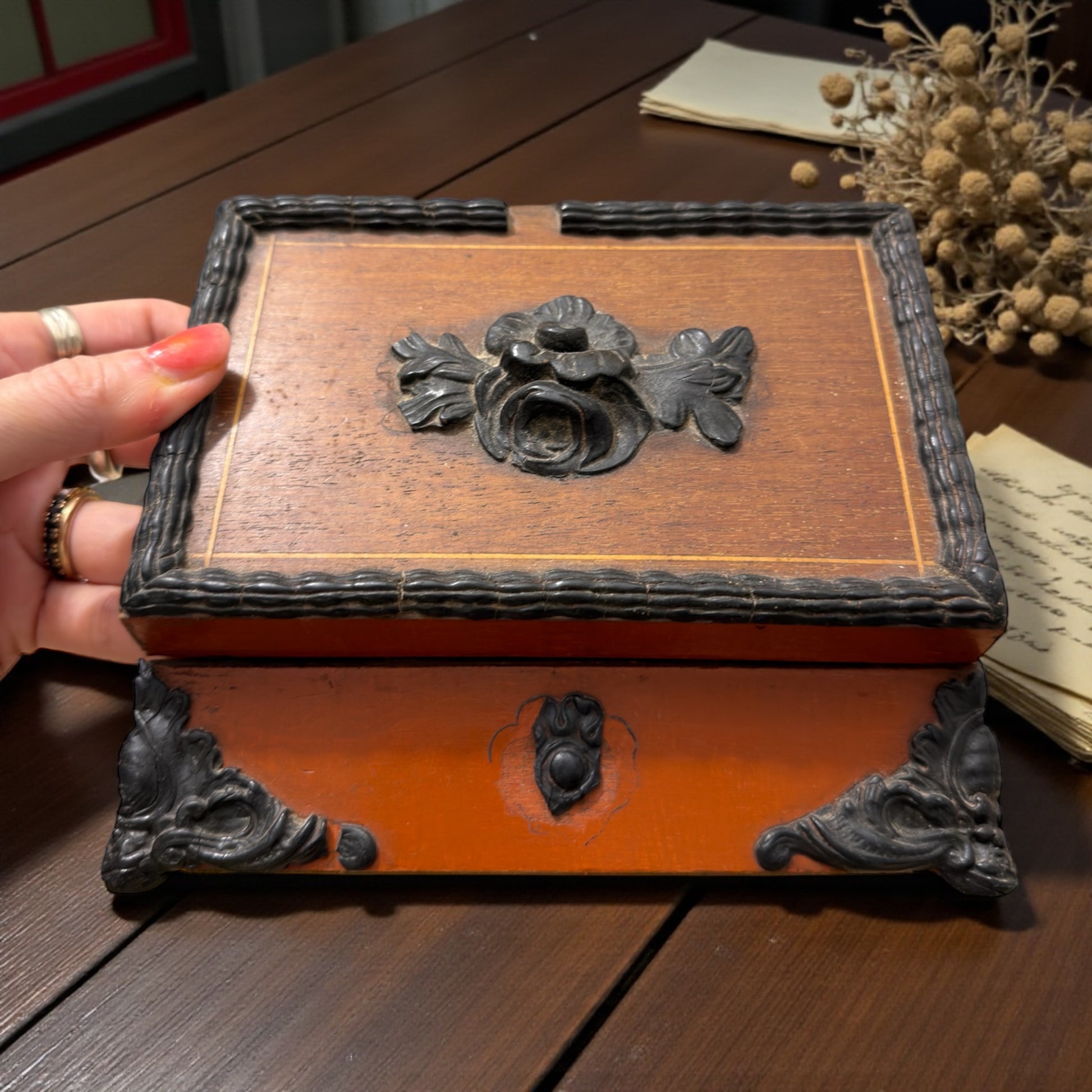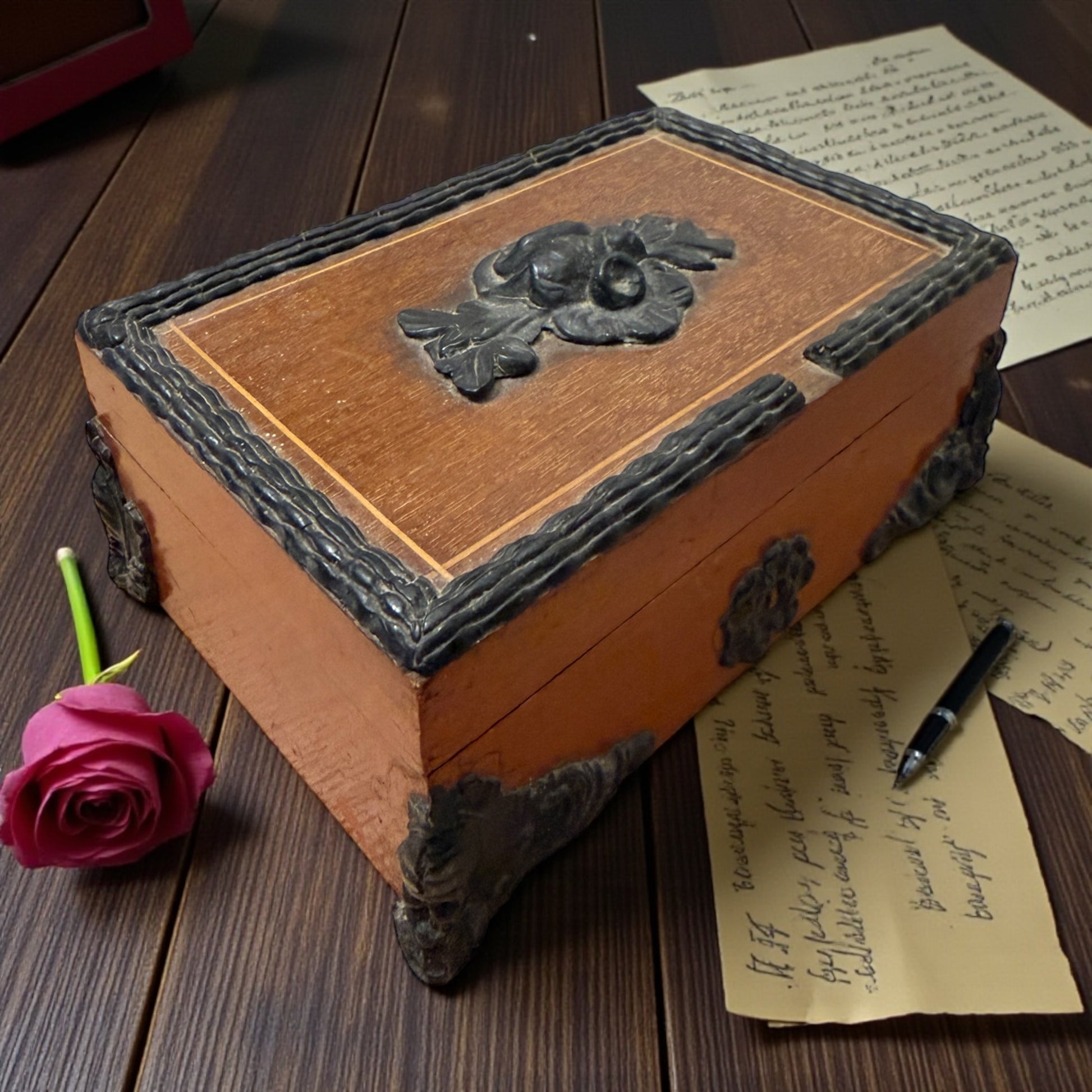 Non nasce per essere aperta spesso. Nasce per custodire, per nascondere. Questo piccolo cofanetto ligneo racconta un tempo in cui le cose importanti erano poche, ma avevano un peso preciso. Lettere piegate con cura, un anello, un bottone speciale, una fotografia. Le decorazioni floreali applicate, volutamente sobrie, incorniciano una struttura solida, pensata per stare su uno scrittoio o su una toilette senza attirare troppo l’attenzione. Doveva sembrare una normale scatola per gioielli… ma non lo era. All’interno, il velluto verde originale accoglierà ciò che vi verrà riposto da nuove mani, proteggendolo. Le piccole mancanze delle decorazioni lignee parlano del tempo passato, non di incuria: sono segni coerenti con l’età, che non intaccano la struttura né il fascino complessivo dell’oggetto. È una scatola che non chiede di essere perfetta, ma autentica. Un oggetto silenzioso, fatto per custodire più che per mostrare. E forse è proprio questo il suo punto di forza.