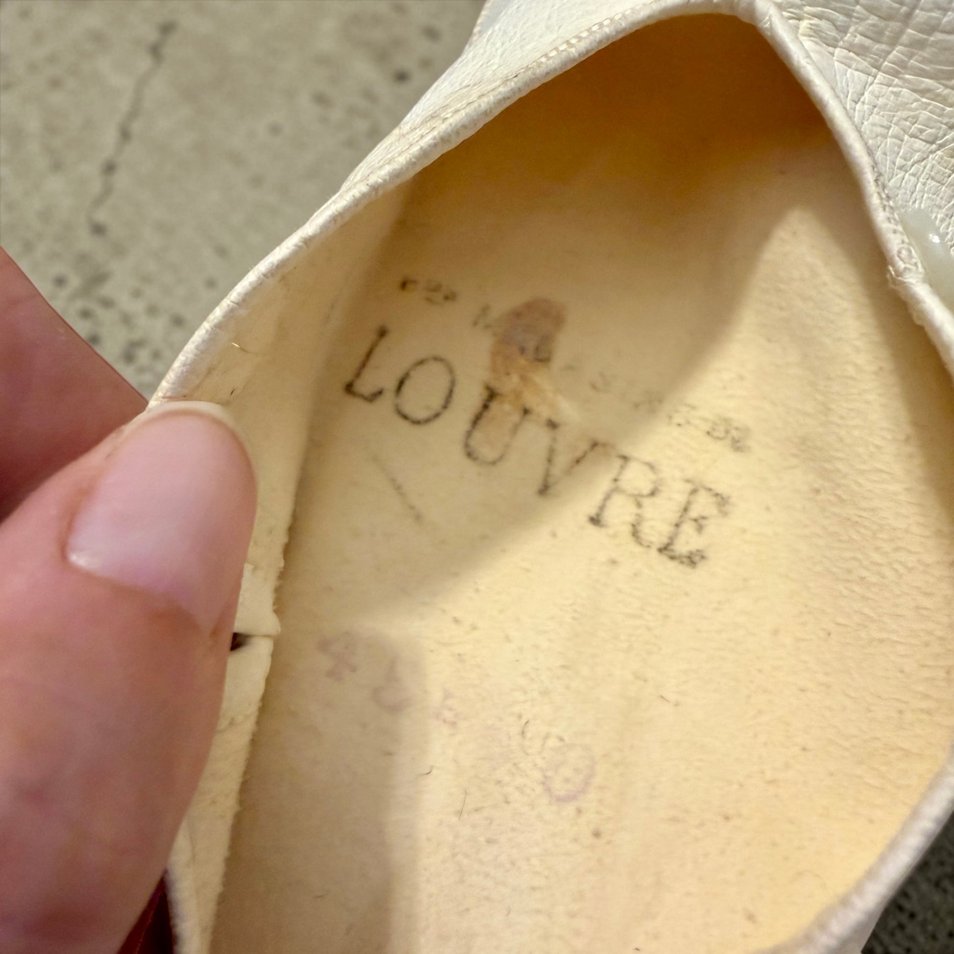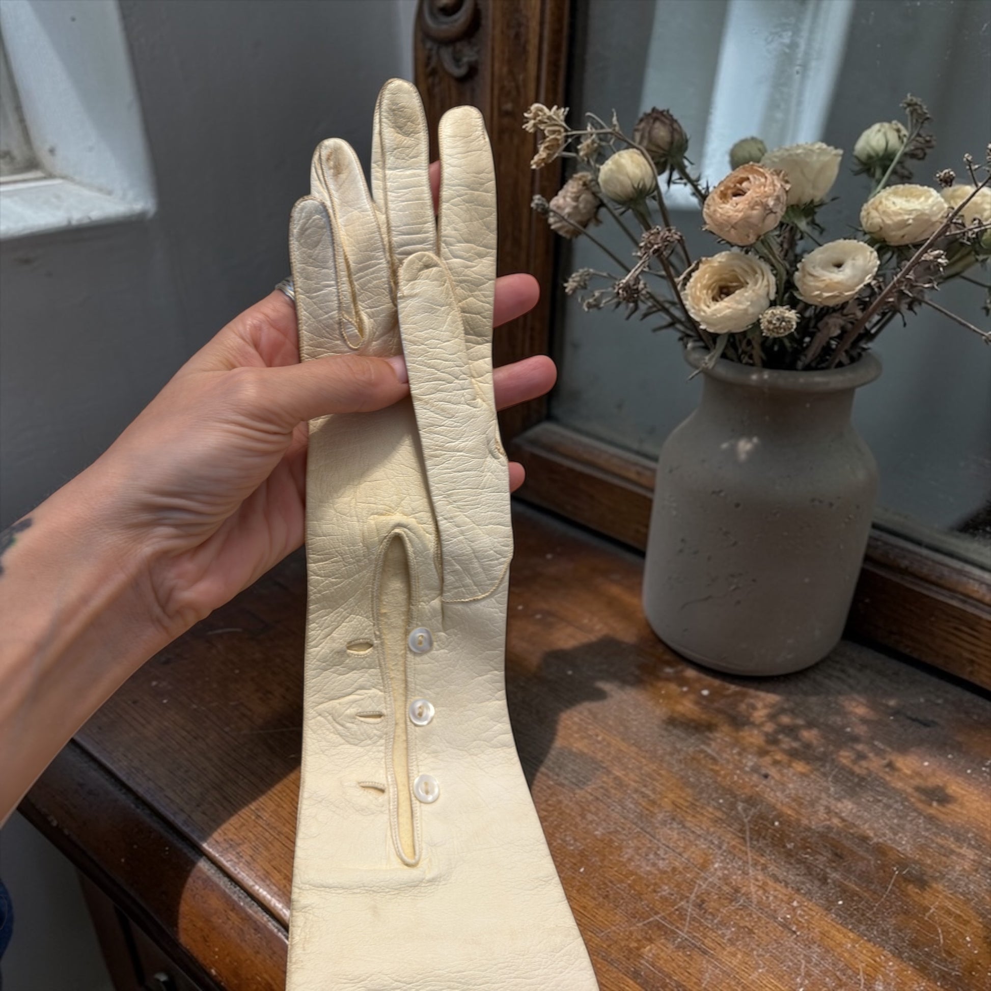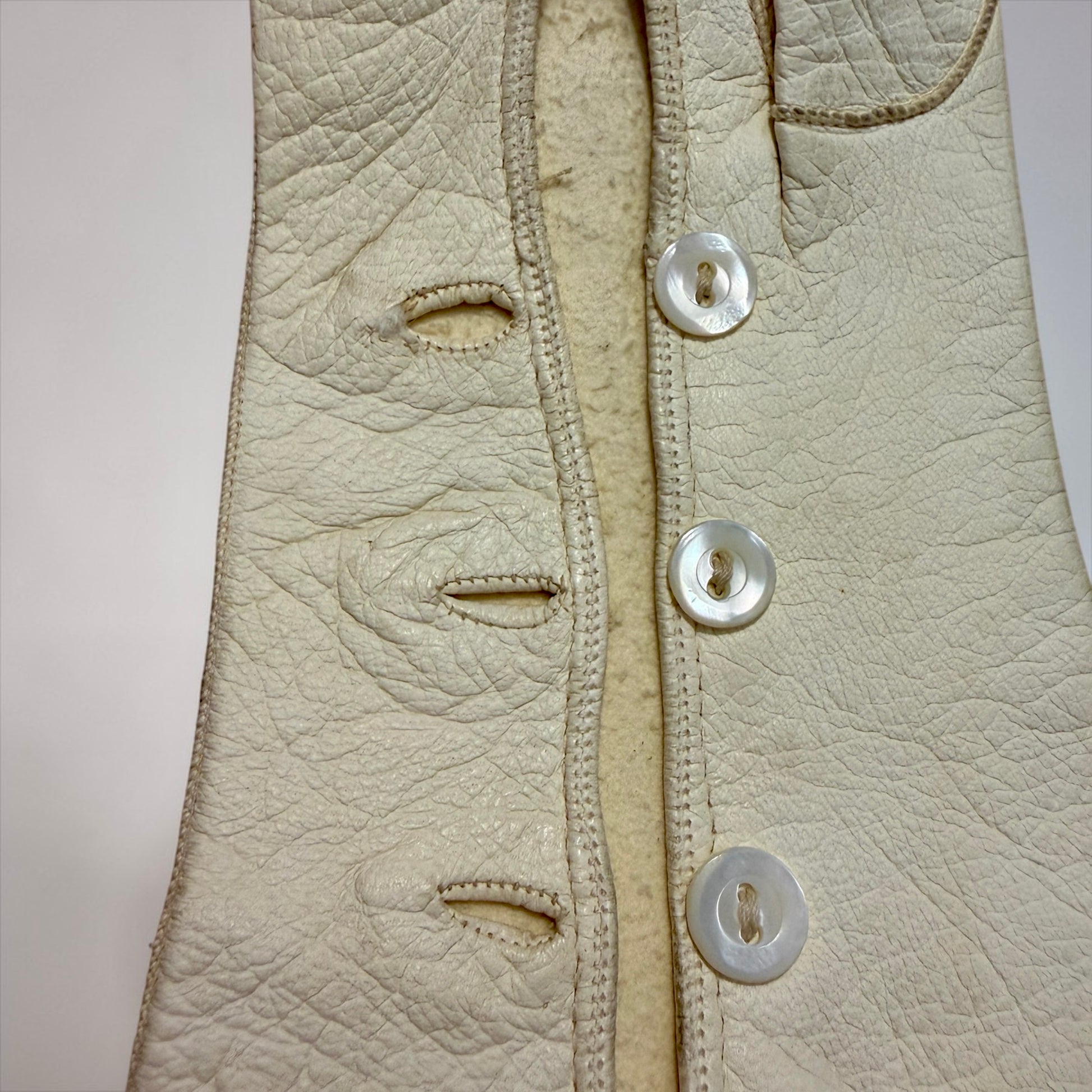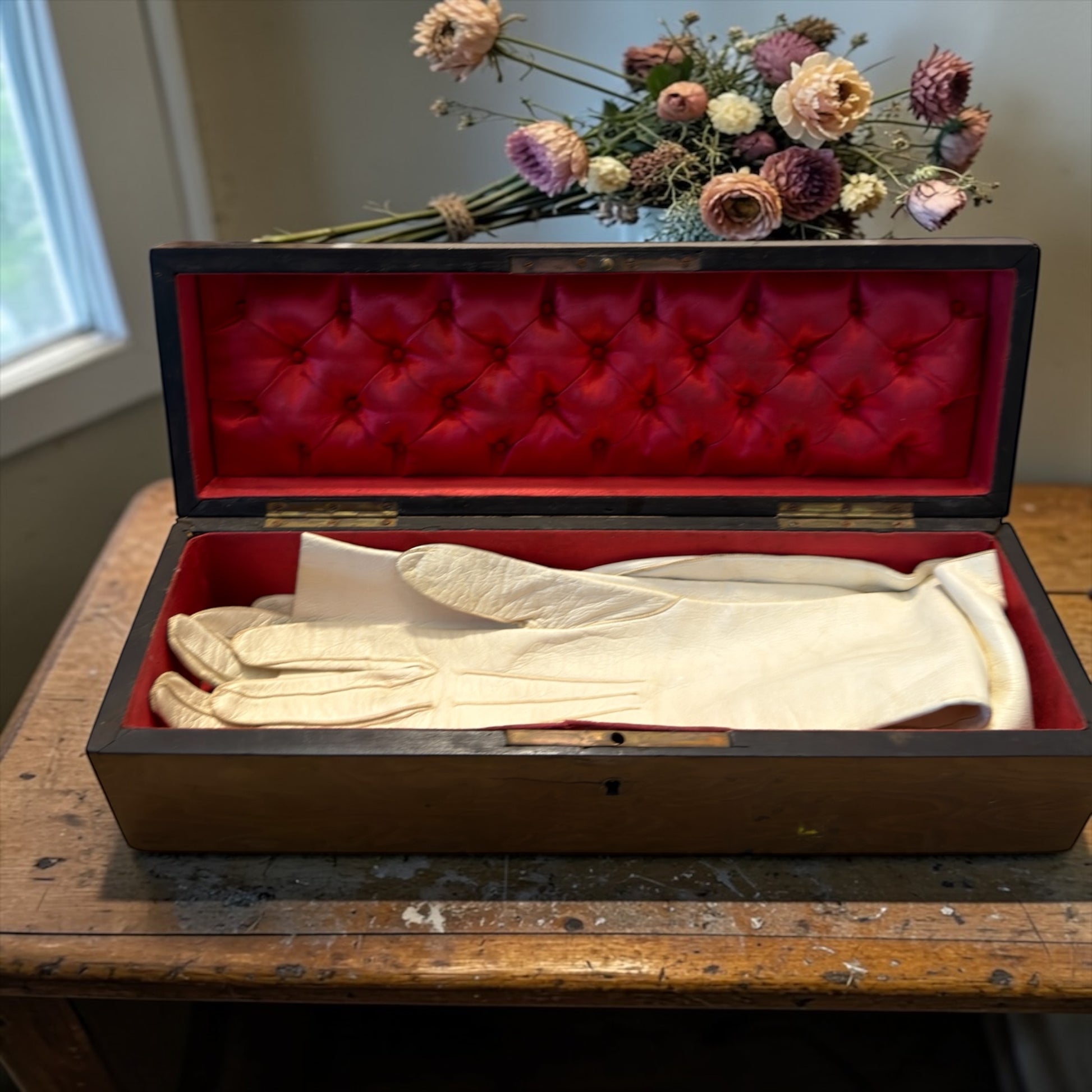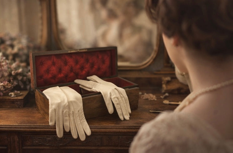 La scatola, in legno impiallacciato con intarsio monogrammato sul coperchio, custodisce ancora il suo contenuto originale: un paio di lunghi guanti da sera in pelle finissima, agnello o capretto, morbidi come tessuto e ancora sorprendentemente ben conservati. All’interno dei guanti è visibile il timbro dei Grands Magasins du Louvre di Parigi, uno dei grandi magazzini più eleganti della Belle Époque, dove si acquistavano accessori destinati a occasioni importanti. La misura indicata è 6, tipica delle mani femminili sottili dell’epoca, e la lunghezza di oltre 50 cm lascia immaginare abiti senza maniche, teatri, balli e salotti illuminati da lampadari.