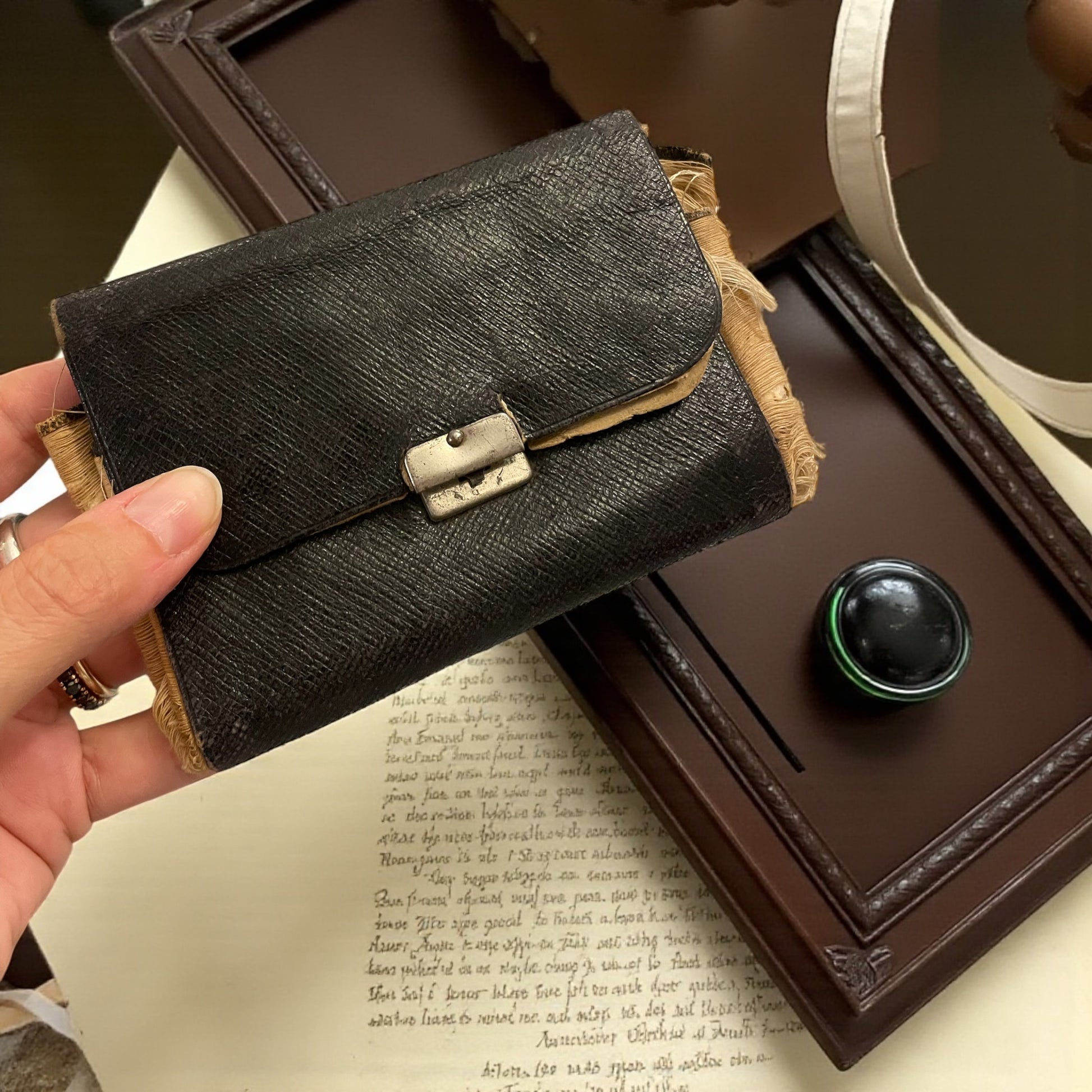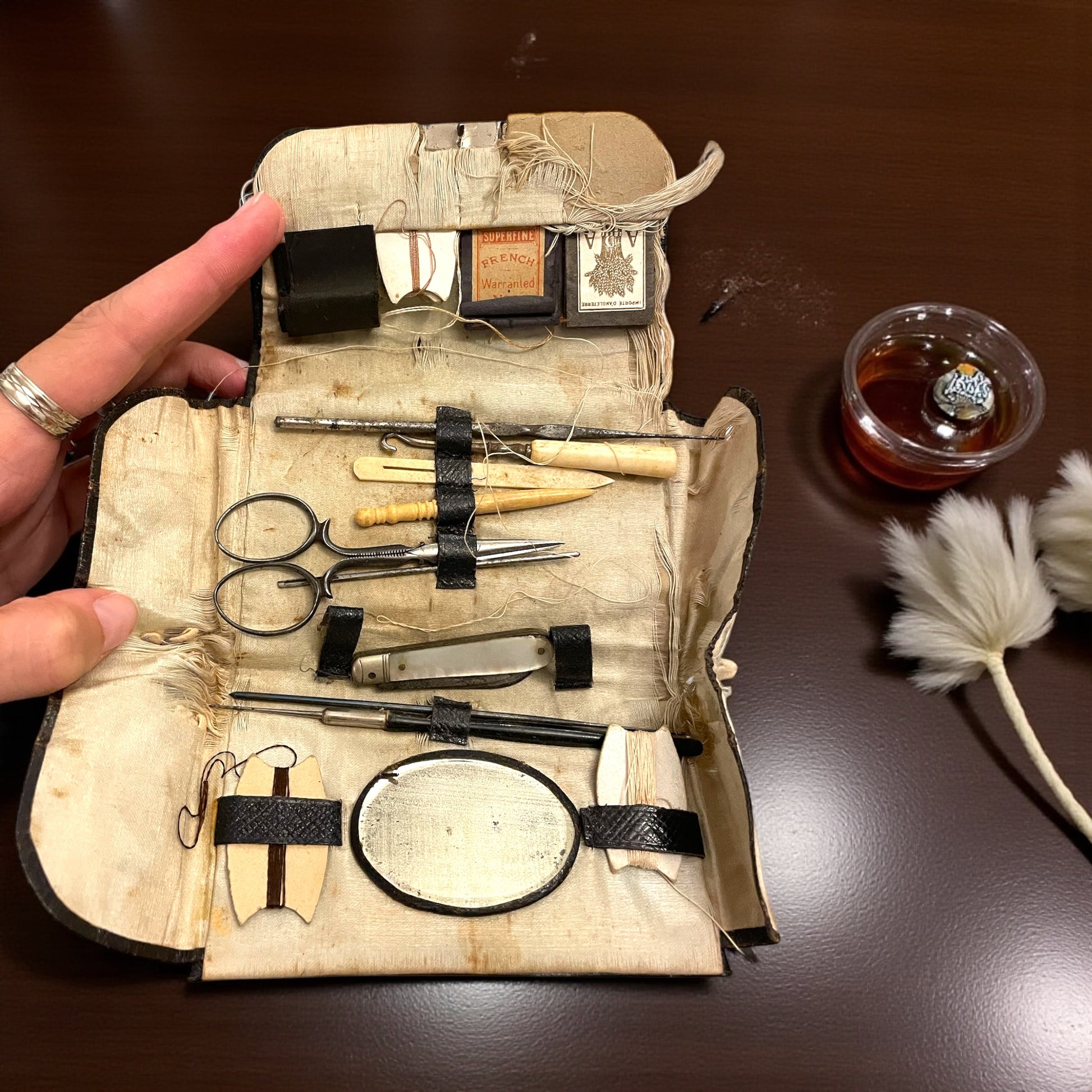 Questo antico necessaire da cucito vittoriano da viaggio (circa 1880–1910) è uno di quei compagni silenziosi nato per seguire qualcuno lungo strade lontane, tra carrozze e valigie di cuoio, appartenuto a una donna elegante che non rinunciava mai alla cura del dettaglio. La custodia esterna, in finitura nera lavorata, porta con sé la traccia dei viaggi che ha visto. All’interno, un mondo in miniatura si apre come un piccolo scrigno di epoche passate: forbicine sottili lavorate a mano, strumenti da ricamo e minuti accessori da sartoria, insieme a una piccola lama pieghevole con manico in madreperla. A completare il corredo troviamo un ago uncinetto, uno stiletto da cucito e un infila-nastro in osso. Commovente la presenza delle bustine originali d’epoca degli aghi francesi e inglesi, con diciture: “Superfine French – Warranted” e “White Chapel – Darners”. Perfino lo specchietto ovale è ancora al suo posto, con la grazia discreta degli oggetti che hanno visto passare il mondo, restando integri nel loro ruolo. Ogni pezzo è autentico, vissuto, coerente con l’insieme: non ricomposto, a volte danneggiato, ma vero. È raro trovare un set vittoriano ancora completo, ancora capace di raccontare una storia fatta di mani, di gesti, di cura. Un oggetto così non si osserva soltanto: si ascolta. E se potesse parlare, forse direbbe che qualcosa – come la memoria – vale la pena cucirlo bene… perché duri.