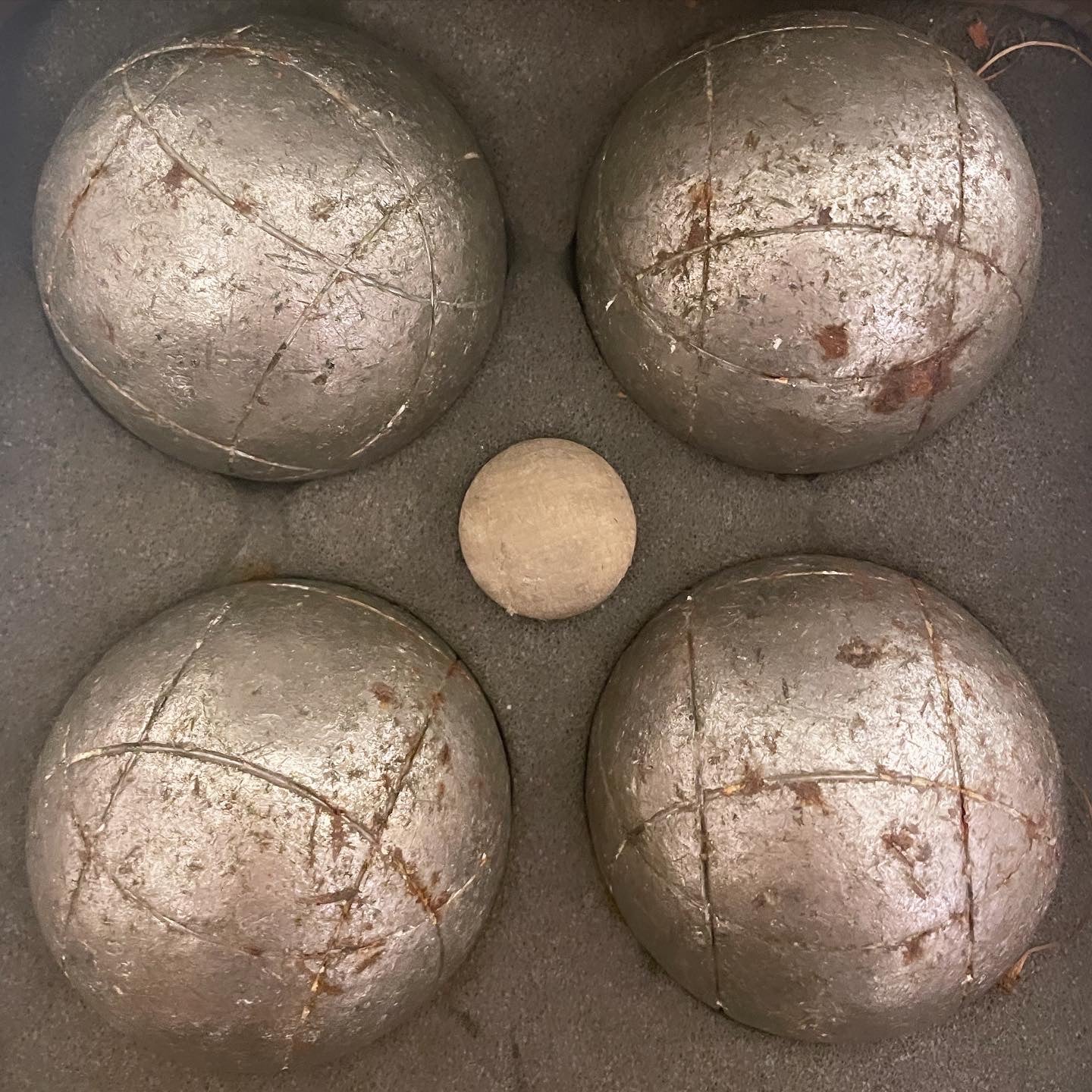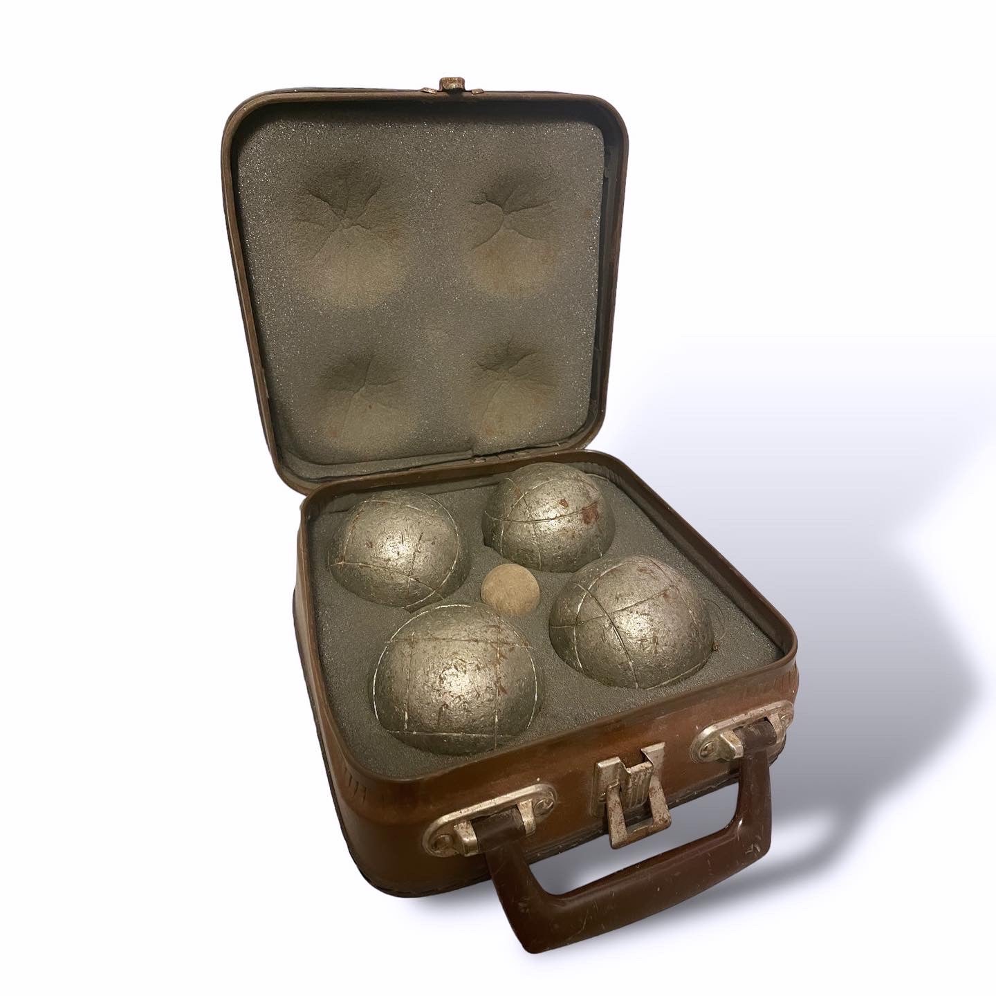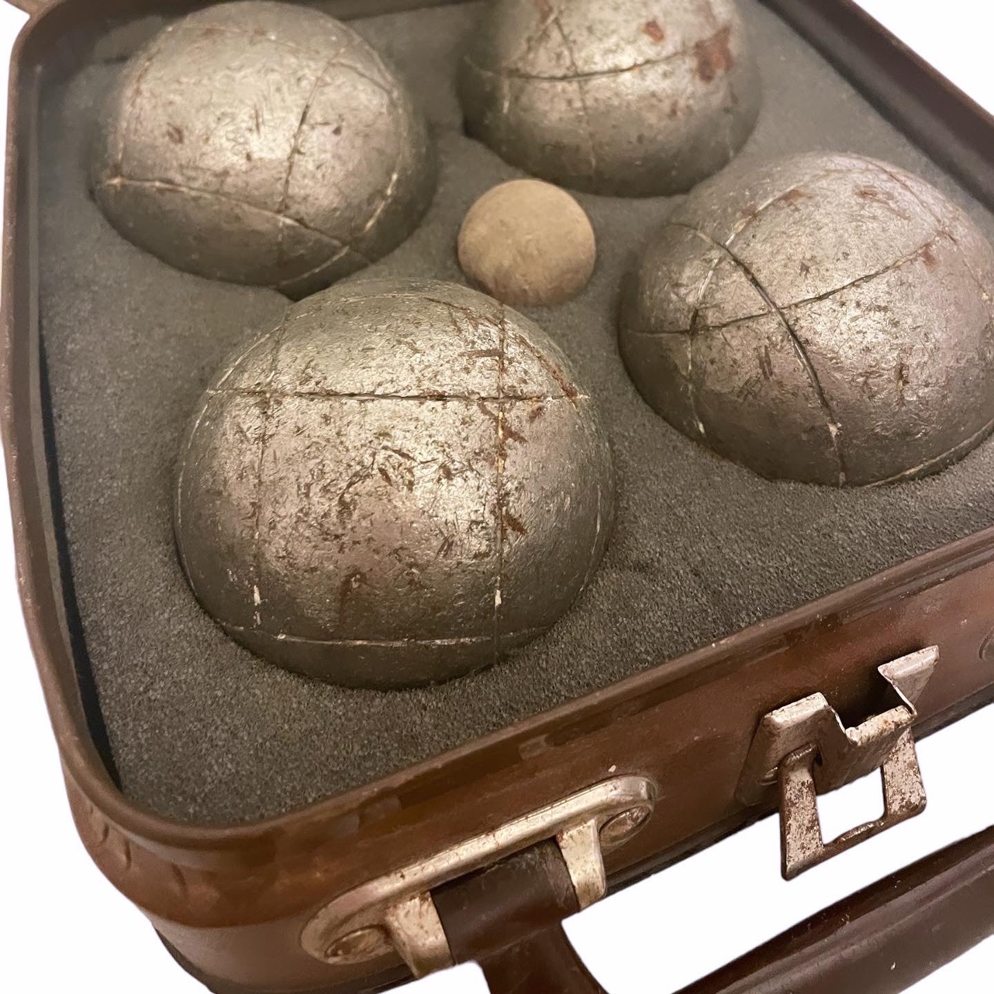 E ce la facciamo una #sbocciata ?? #set #antico di #bocce completo di #valigia , n.4 pesanti bocce in ferro e n. 1 boccino. Chissà l’uomo cui apparteneva quante partite avrà giocato, dove, con chi, e quante risate con gli amici avrà condiviso… e tutte queste emozioni oggi sono qui, racchiuse dentro questa valigetta.