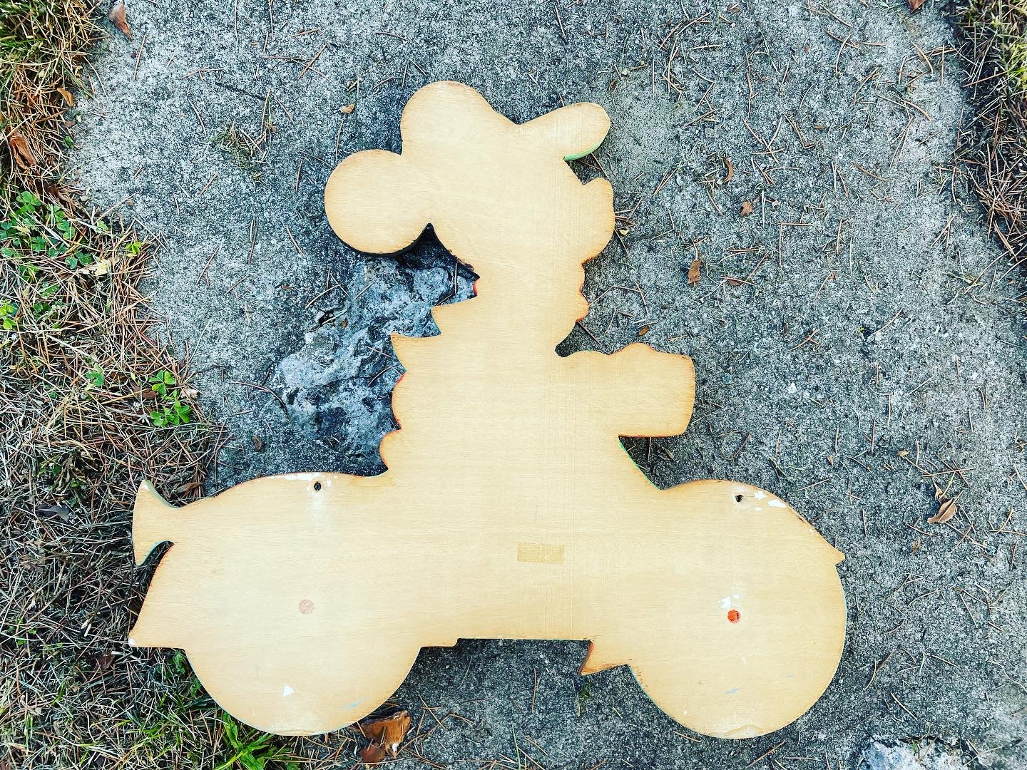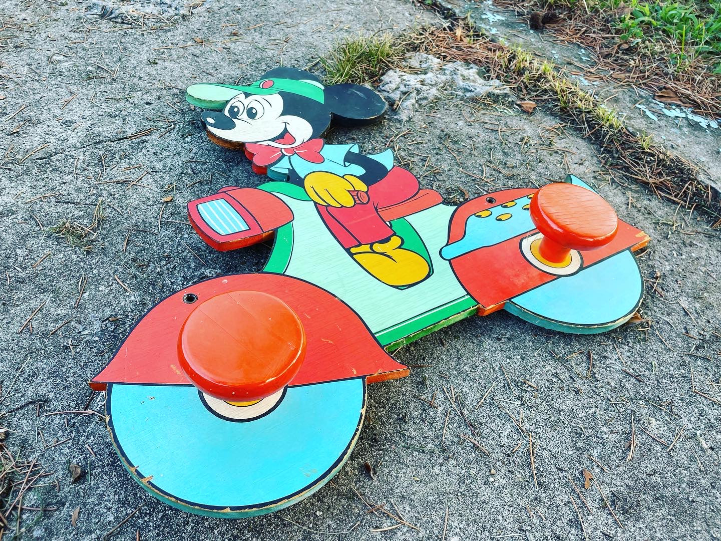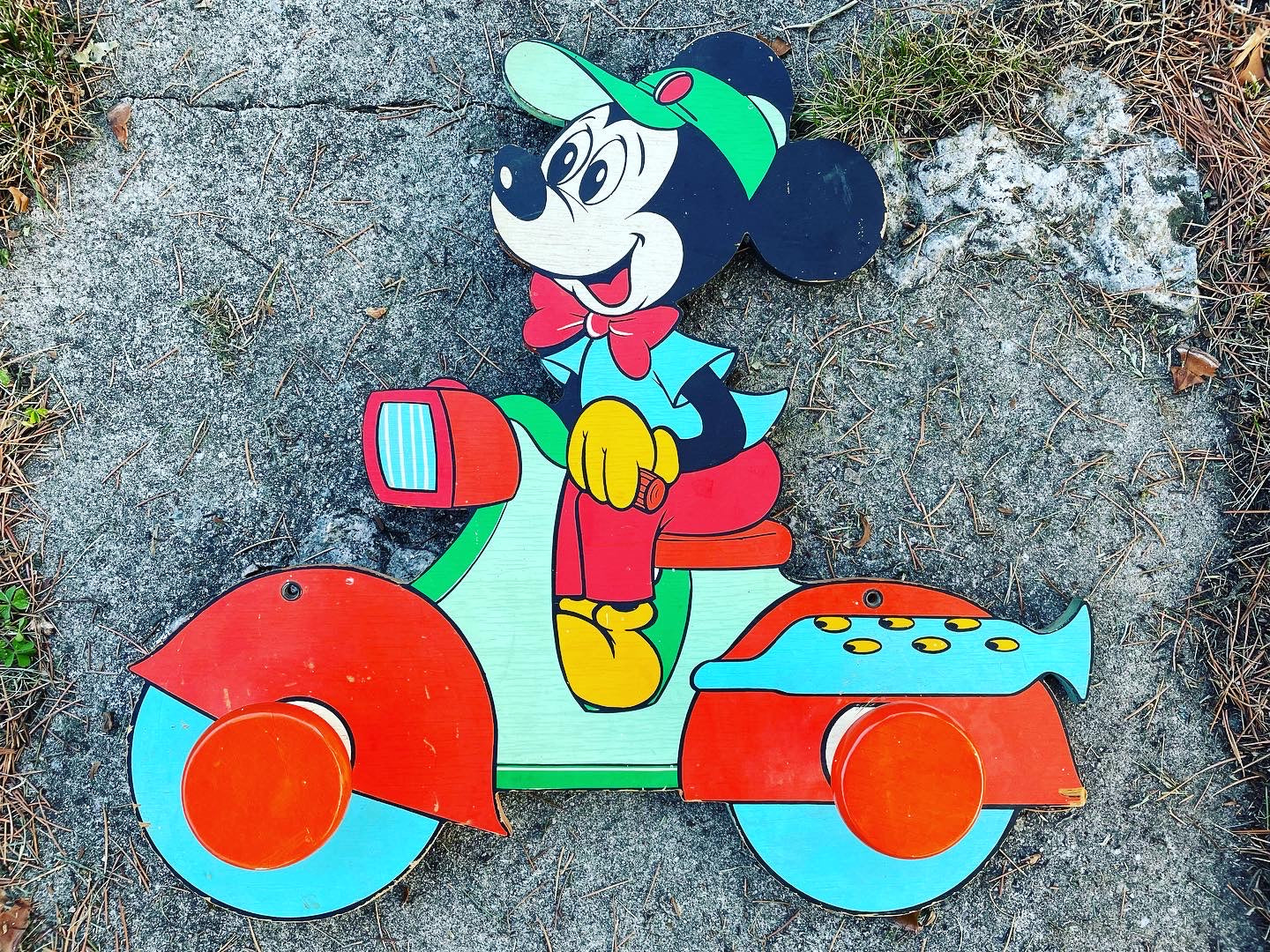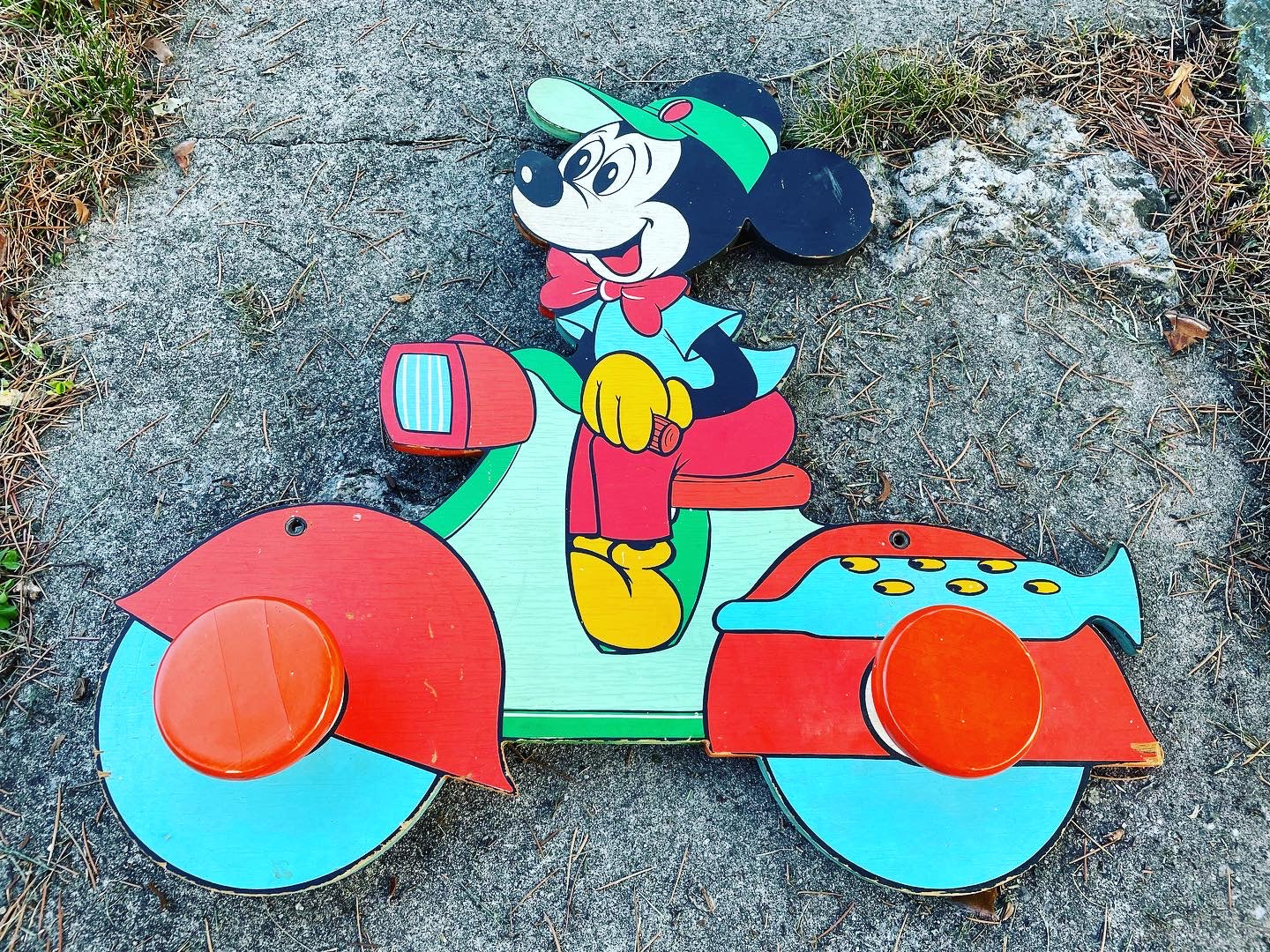 Bello il nostro #topolino #anni70 in motocicletta come #attaccapanni … legno, 50 x 50 cm con due pomelli (ovviamente arancioni, #spaceage anche la #disney !) super colorato e condizioni molto buone nonostante i suoi annetti.
