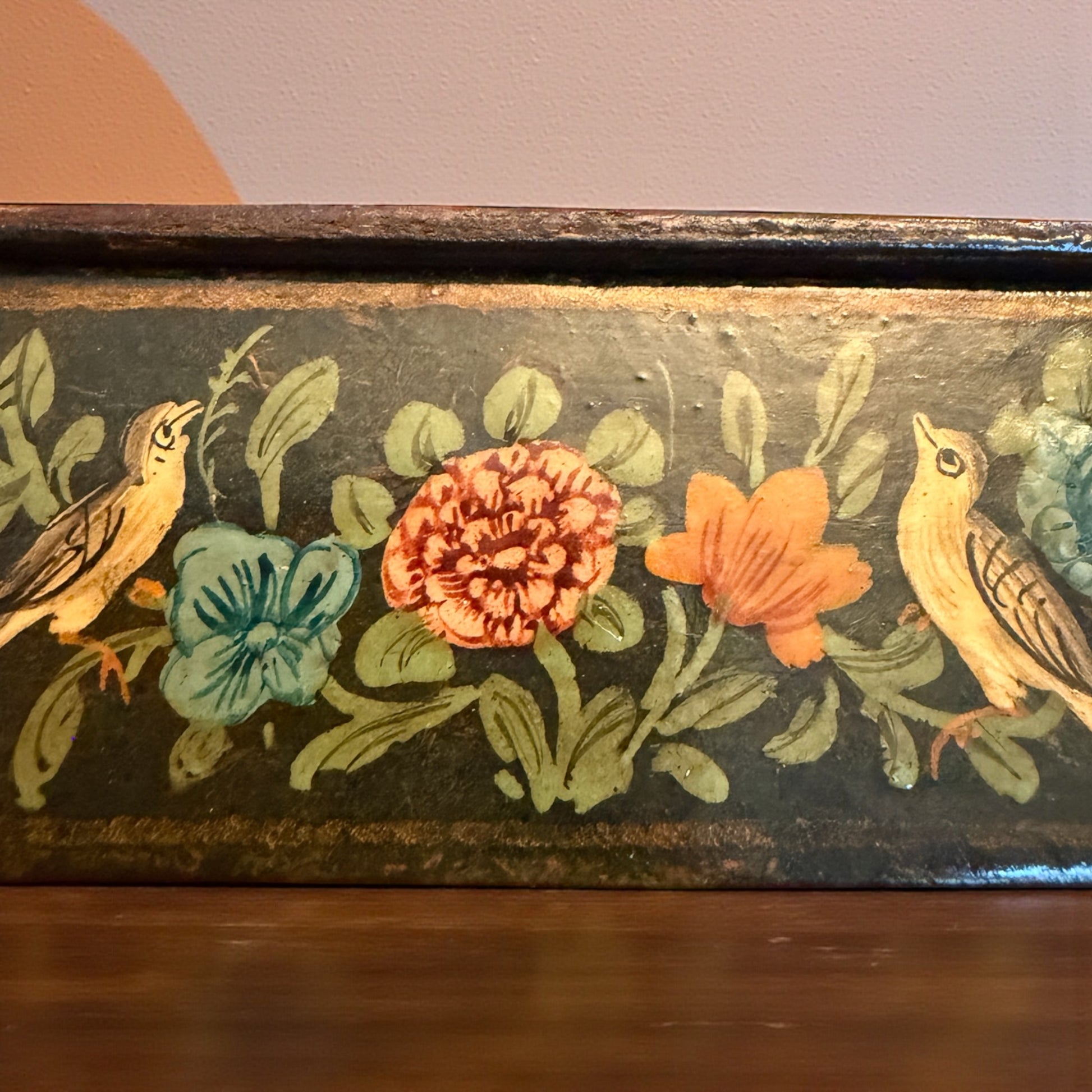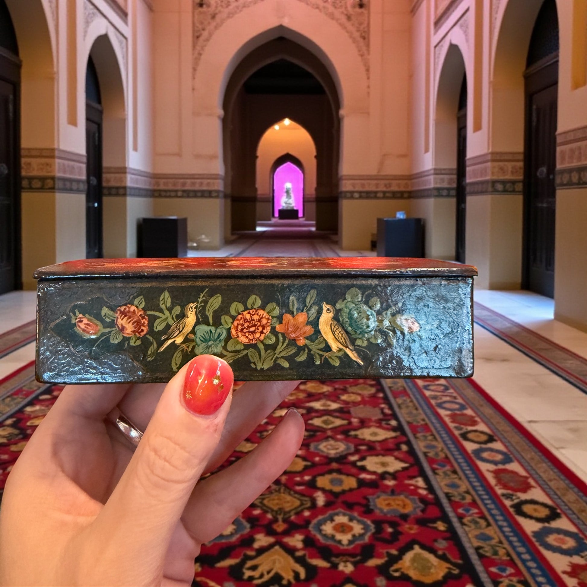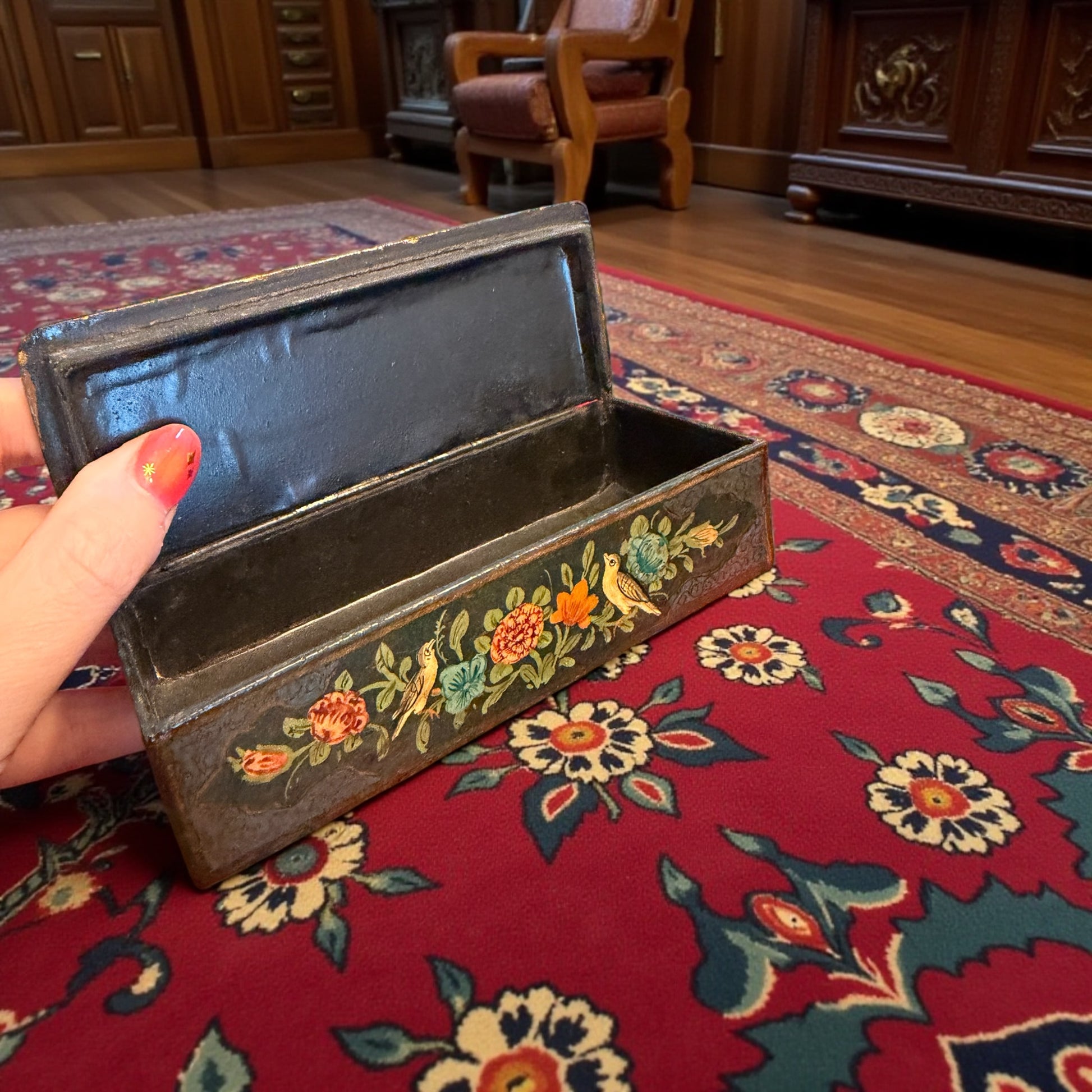 Su questo piccolo coperchio, i cavalieri lanciano i loro cavalli in una corsa elegante, mentre impugnano lunghe mazze di legno sottile: non sono racchette, e nemmeno mazze da golf… sono gli strumenti del Chovgan, l’antico gioco persiano che ha dato origine al polo moderno. E più la guardi, più ti accorgi dei dettagli: il passo leggero dei cavalli, le vesti decorate, i cappelli dalla forma insolita. È come se la scena stesse per muoversi. Ai lati, piccoli uccellini e fiori dai colori accesi aggiungono un equilibrio perfetto, come un respiro visivo che accompagna la vivacità della scena centrale. Quando la apro, la lacca scura e lucida crea un contrasto elegante, un invito silenzioso a custodire qualcosa che merita attenzione. È una scatola semplice, eppure piena di una delicatezza rara: un frammento di arte indo-kashmira degli anni ‘50-‘60 che porta con sé un pezzetto di cultura, di gioco, di movimento. E mentre la guardi, forse puoi già immaginare cosa potresti affidarle: una penna speciale, un biglietto prezioso, un ricordo che desideri proteggere.