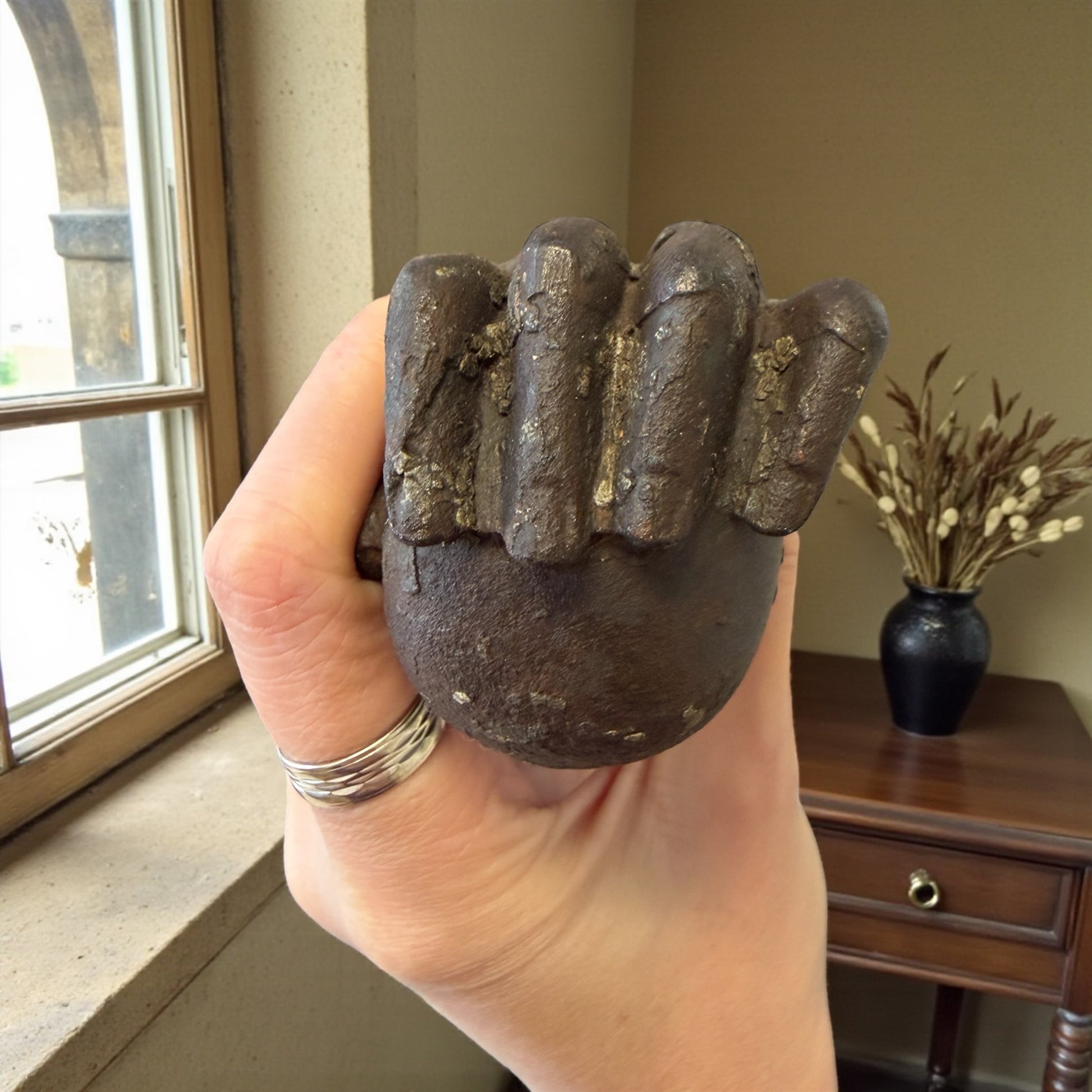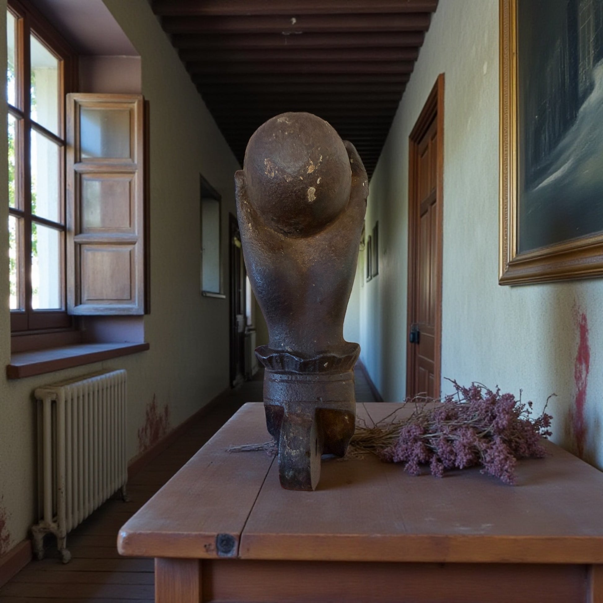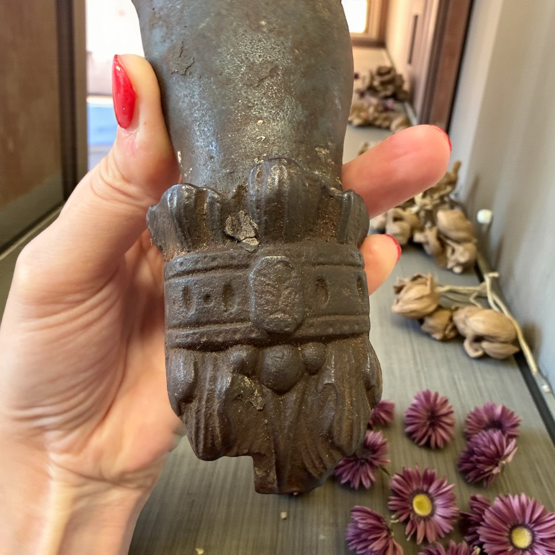 C’è qualcosa di solenne in questa mano. Non implora. Non forza. Si limita a bussare. Un antico battente da porta in ghisa piena, pesantissimo, modellato come una mano serrata che stringe una sfera: gesto antico, fermo, deciso. Ogni dettaglio racconta la sua funzione originaria: l’anello al dito, la base decorata, il peso importante pensato per farsi sentire oltre il legno spesso delle grandi porte di una casa ottocentesca. Immaginatelo: una soglia importante, un portone scuro, il silenzio interrotto da un colpo secco e profondo. Non era solo un oggetto funzionale. Era un annuncio. Oggi resta una presenza scultorea, intensa, capace di trasformare una porta, un portone, persino una parete, in un punto di passaggio carico di significato. Alcuni oggetti non decorano: stabiliscono un confine.