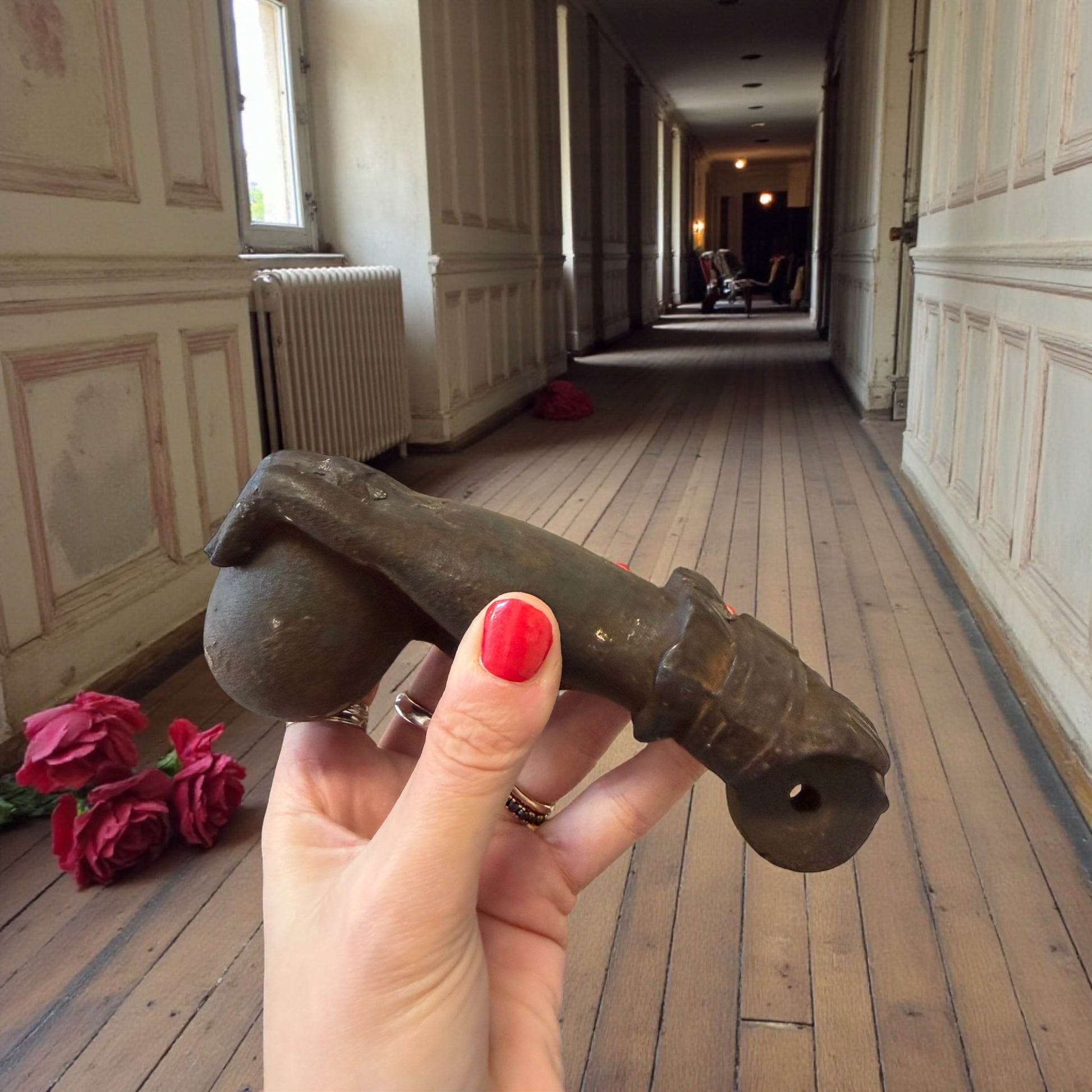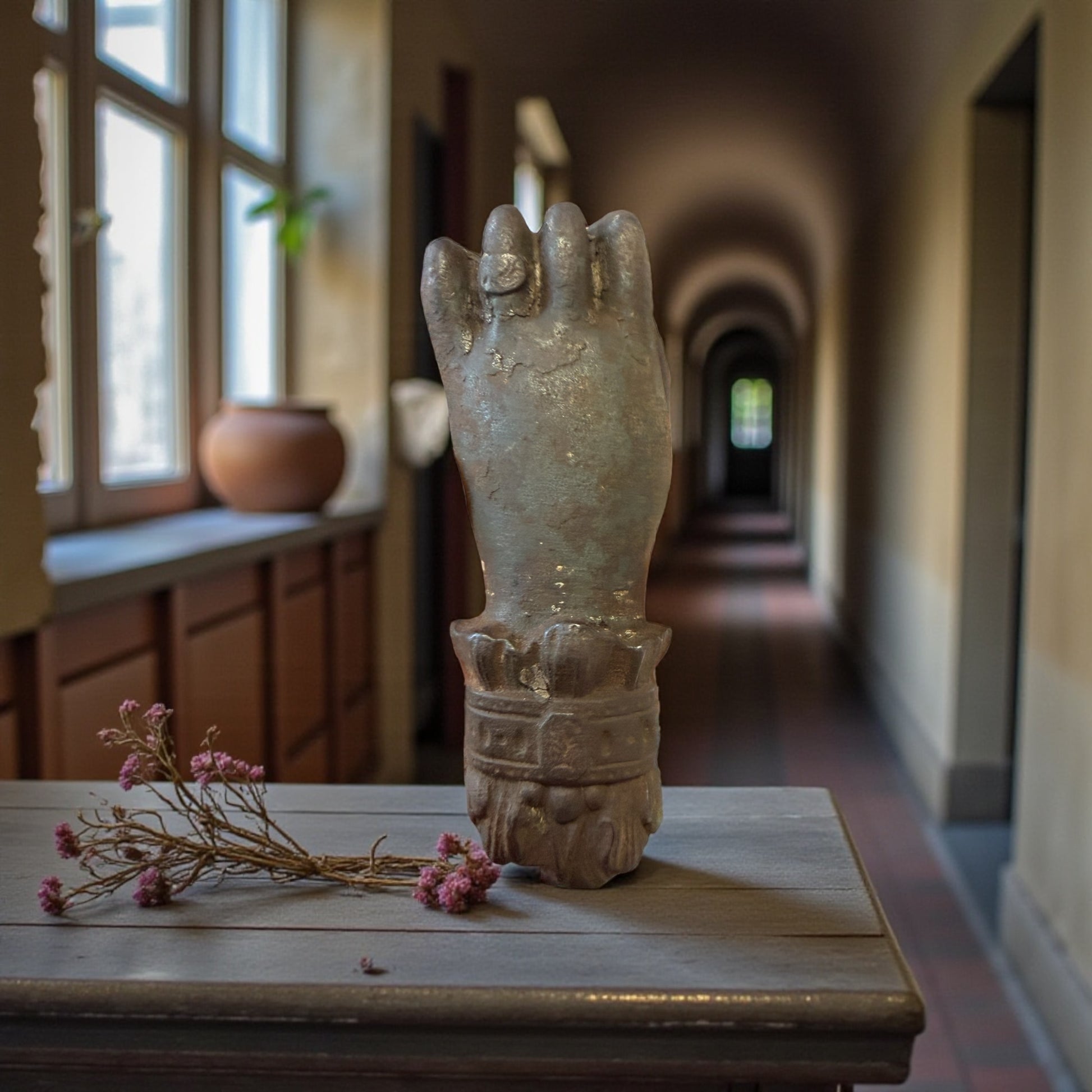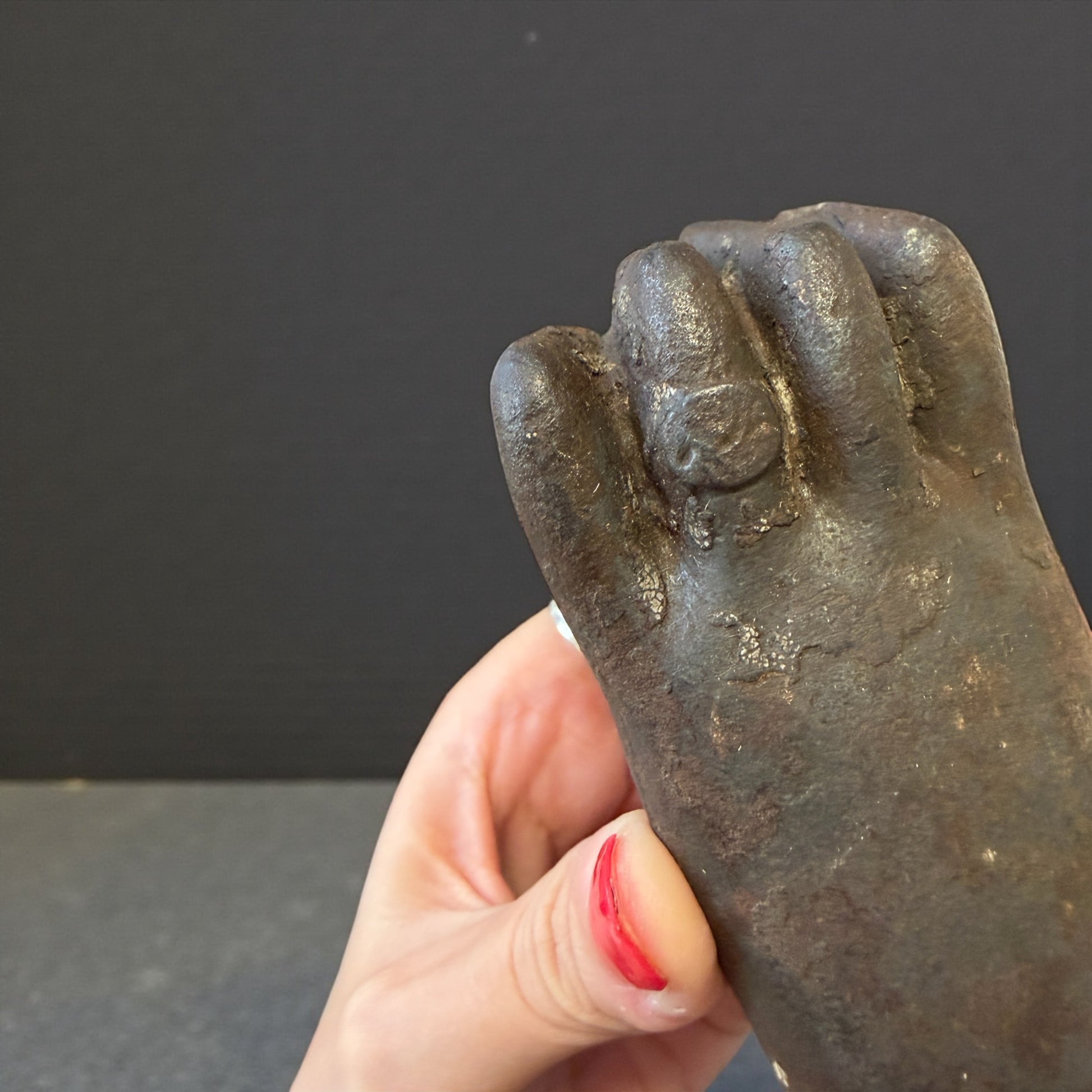 C’è qualcosa di solenne in questa mano. Non implora. Non forza. Si limita a bussare. Un antico battente da porta in ghisa piena, pesantissimo, modellato come una mano serrata che stringe una sfera: gesto antico, fermo, deciso. Ogni dettaglio racconta la sua funzione originaria: l’anello al dito, la base decorata, il peso importante pensato per farsi sentire oltre il legno spesso delle grandi porte di una casa ottocentesca. Immaginatelo: una soglia importante, un portone scuro, il silenzio interrotto da un colpo secco e profondo. Non era solo un oggetto funzionale. Era un annuncio. Oggi resta una presenza scultorea, intensa, capace di trasformare una porta, un portone, persino una parete, in un punto di passaggio carico di significato. Alcuni oggetti non decorano: stabiliscono un confine.