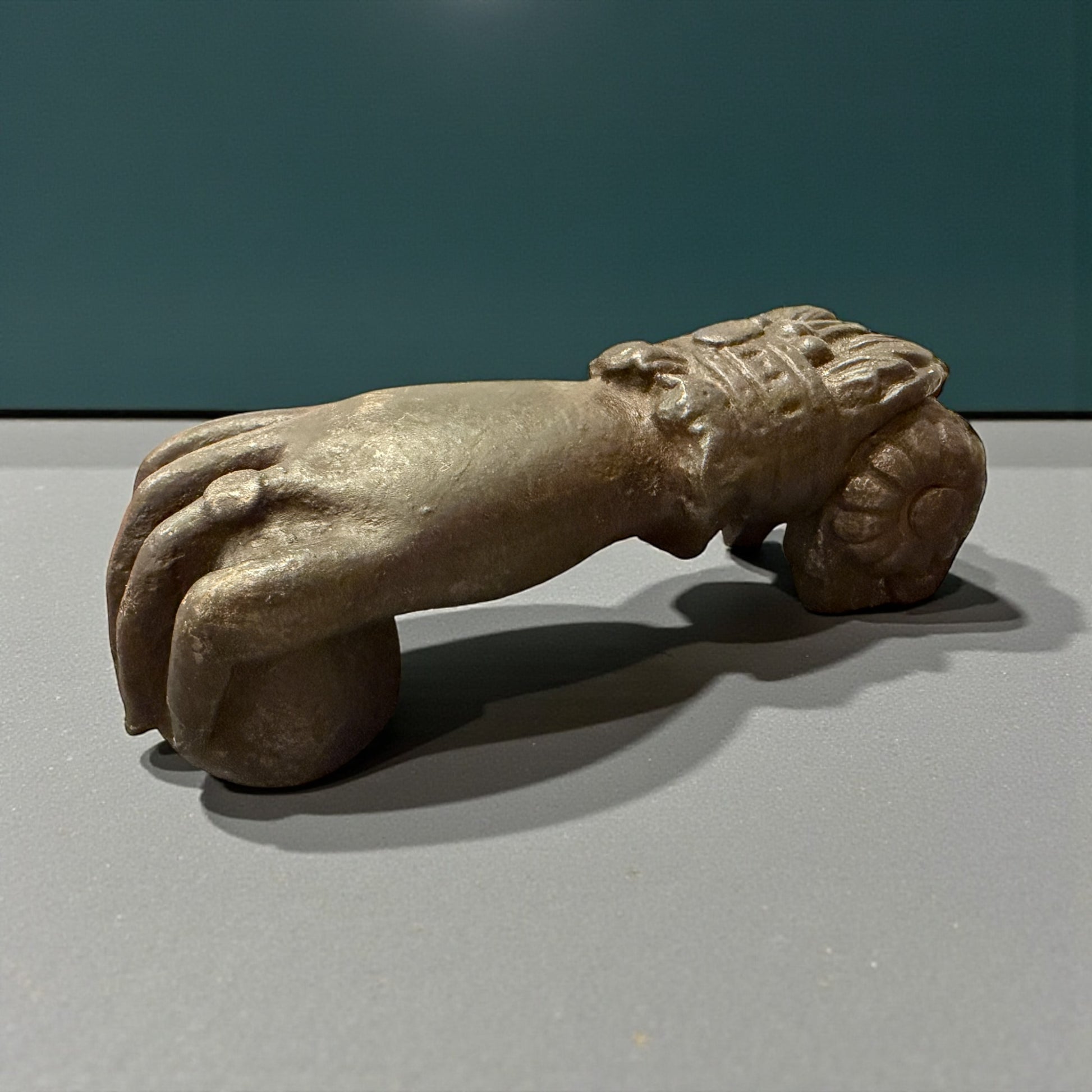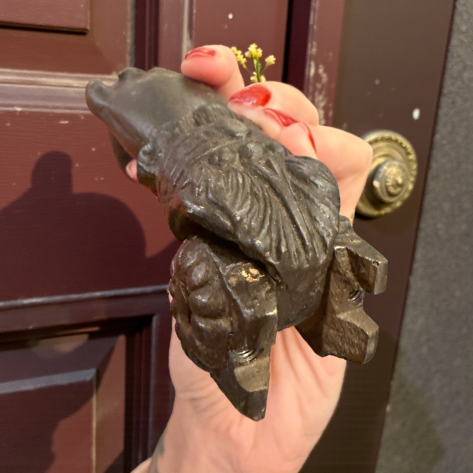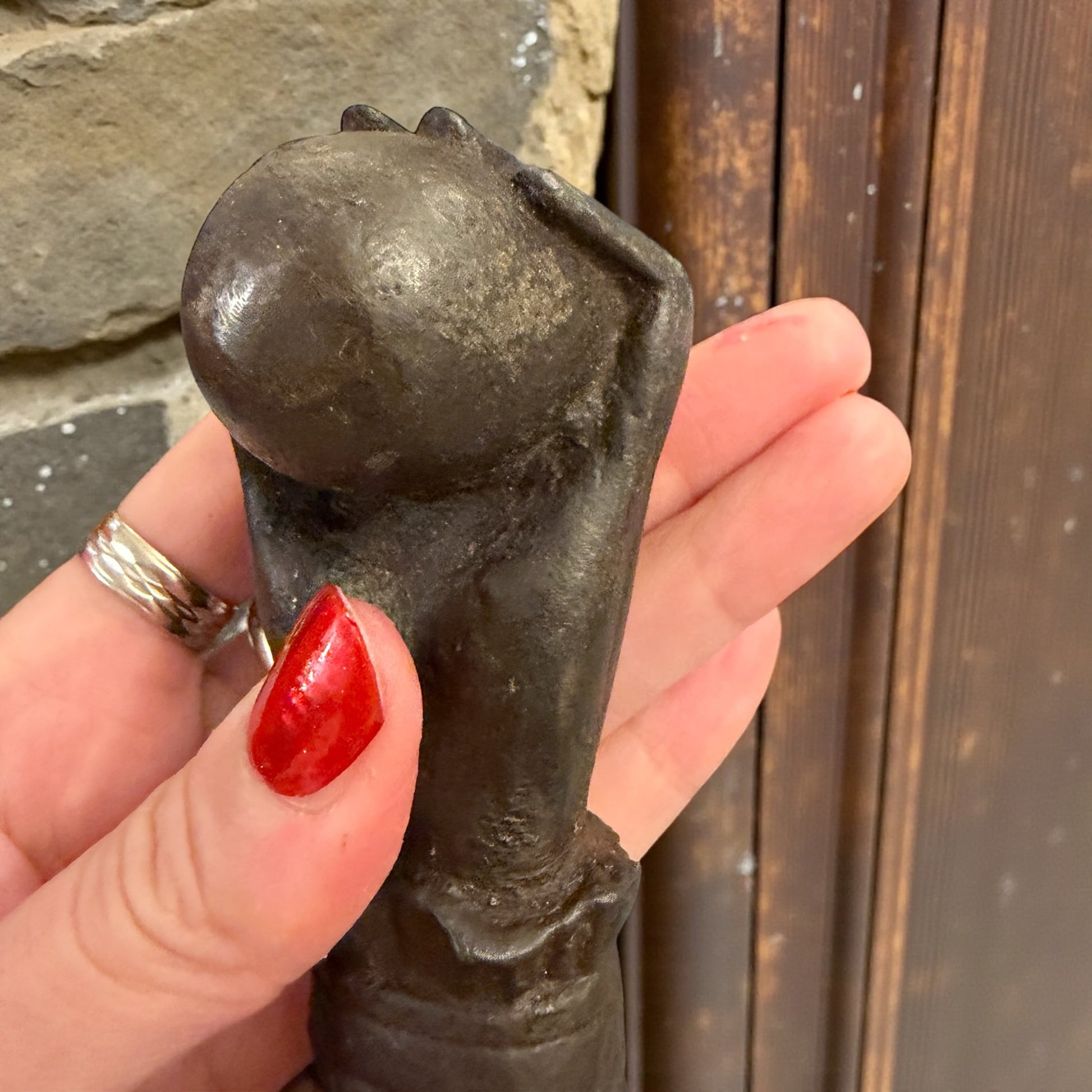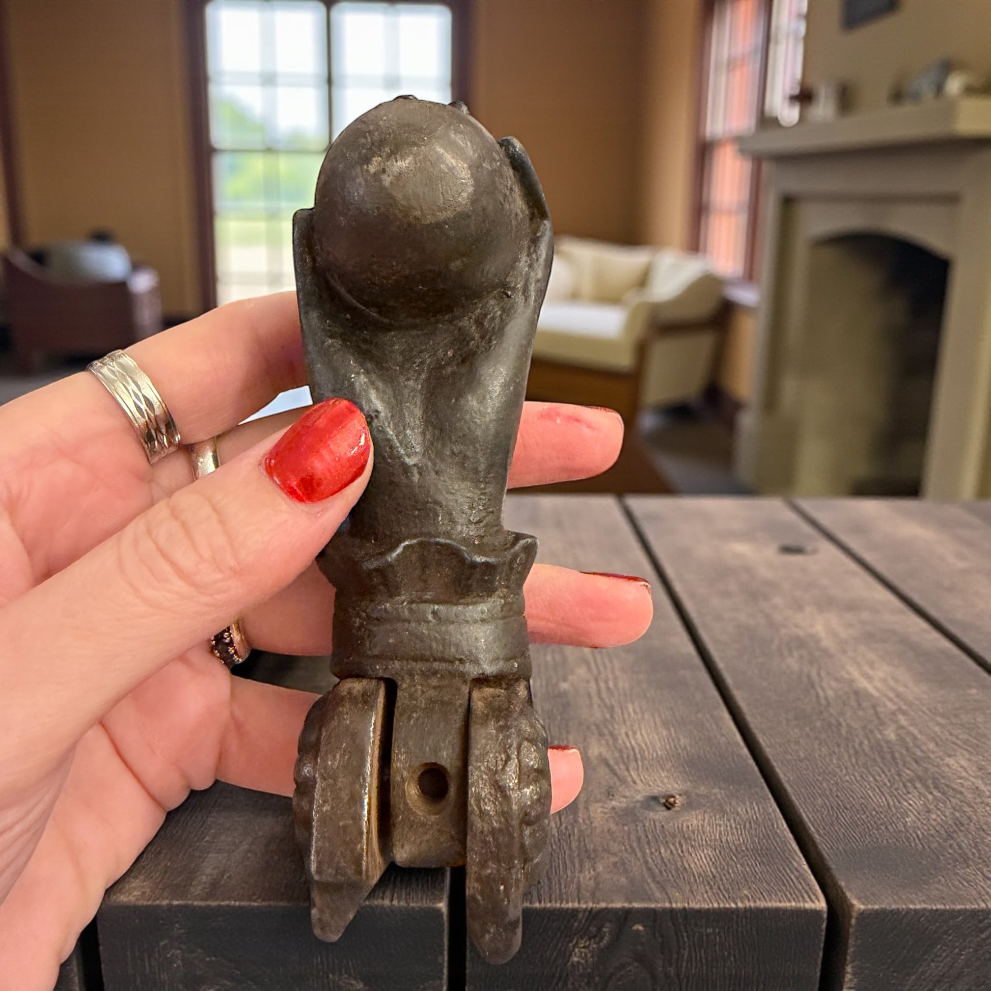 Quante porte ha attraversato, prima di arrivare qui. Una mano chiusa, forte ma piena di grazia, scolpita per essere afferrata e per bussare con presenza ed eleganza insieme. Questo battente in ghisa conserva tutta la fisicità degli ingressi di un tempo: il gesto deciso, il rumore pieno, la presenza che annunciava chi arrivava prima ancora delle parole. La superficie racconta anni di utilizzo reale, con le dita consumate dal contatto e la patina scurita dal tempo. Non è un oggetto gentile: è nato per resistere, per stare all’esterno, per segnare un confine tra dentro e fuori. Un piccolo frammento di architettura quotidiana, autentico e senza finzioni, che oggi può tornare a essere protagonista — oppure semplicemente restare, come memoria solida di ciò che è stato.
