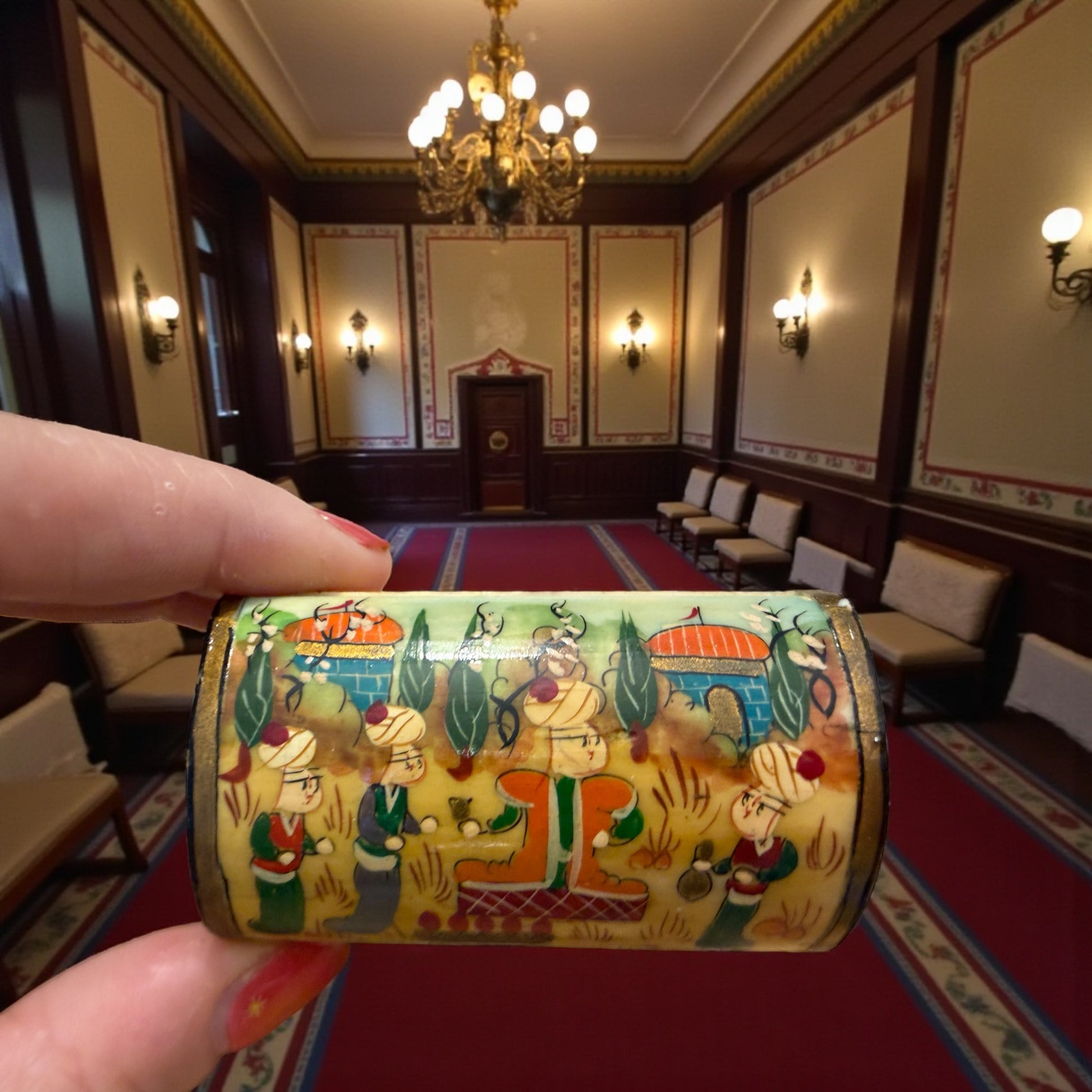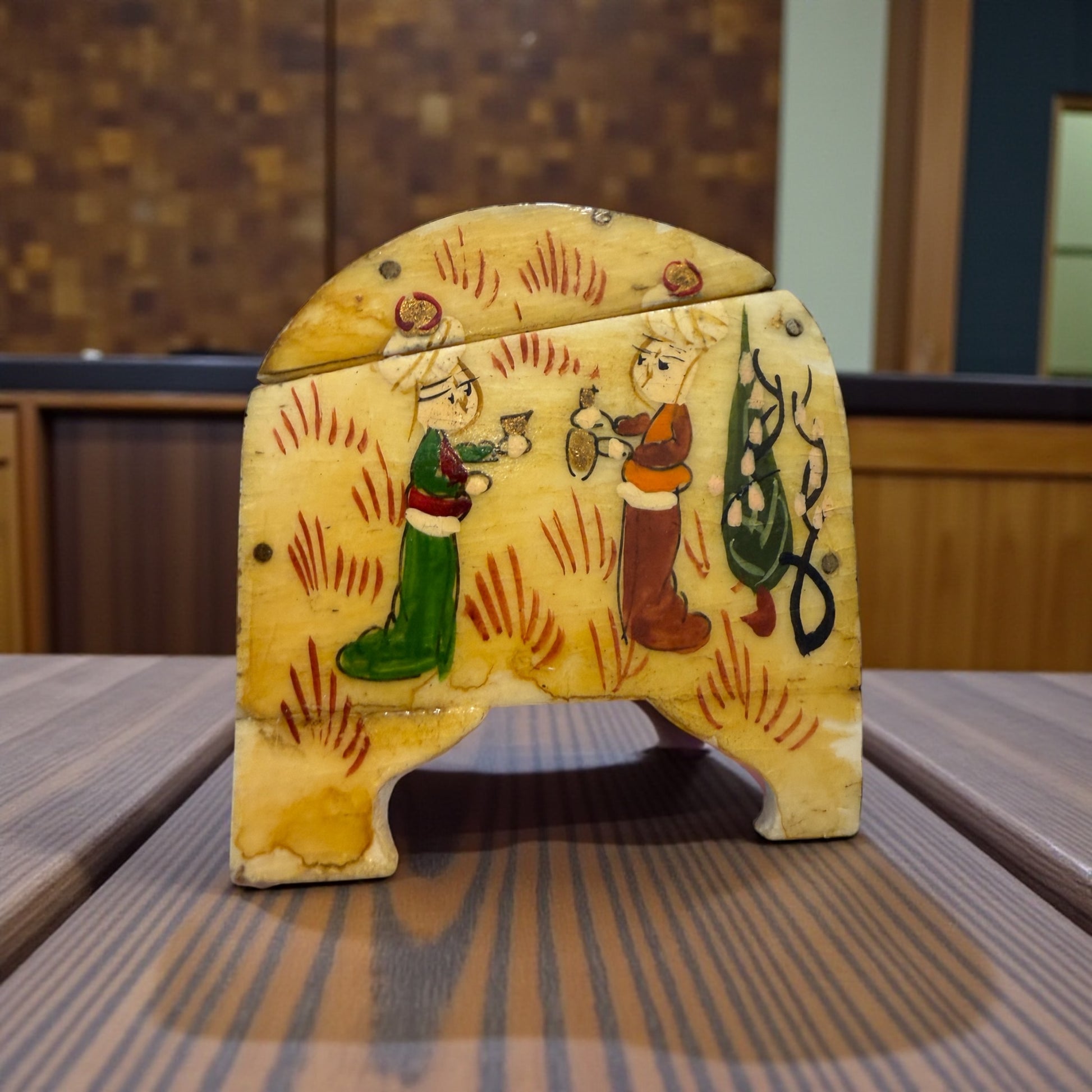 Questo minuscolo bauletto, interamente ricavato da un unico pezzo d’osso, sembra custodire ancora la scena che porta impressa sulle sue pareti: un rituale di offerte, un fuoco acceso, mani che porgono doni, sguardi rispettosi rivolti verso un uomo di rango. Sul coperchio, un dignitario – forse un sultano – siede su un tappeto ricamato mentre riceve dei sacchetti portati con cura: possono essere monete, spezie, o doni preziosi. Attorno a lui si muovono figure dai turbanti bianchi, immerse fra cipressi e piccole architetture dai colori vivi, come se il mondo oltre il bauletto fosse rimasto sospeso in una miniatura di viaggio e cerimonia. Ogni lato racconta un frammento: un braciere con le fiamme rosse, coppe sollevate in gesto di rispetto, conversazioni lente che sembrano ancora vibrare. Si apprezza la leggerezza dell’osso, la sua trasparenza sottile… e ci si sorprende a immaginare chi lo abbia scolpito, in quale mercato sia passato, quante volte sia stato aperto per riporre qualcosa di importante. Un oggetto così non occupa spazio: lo crea. Piccolo, delicato, e capace di evocare un intero mondo.