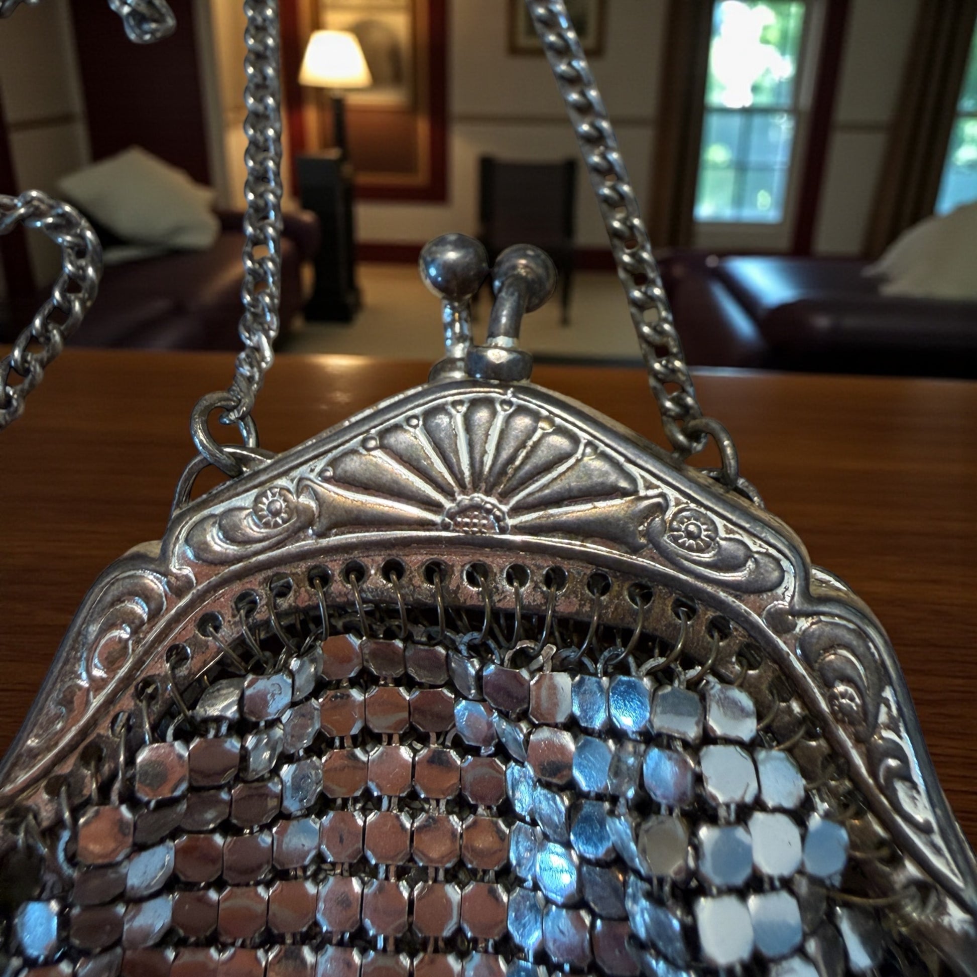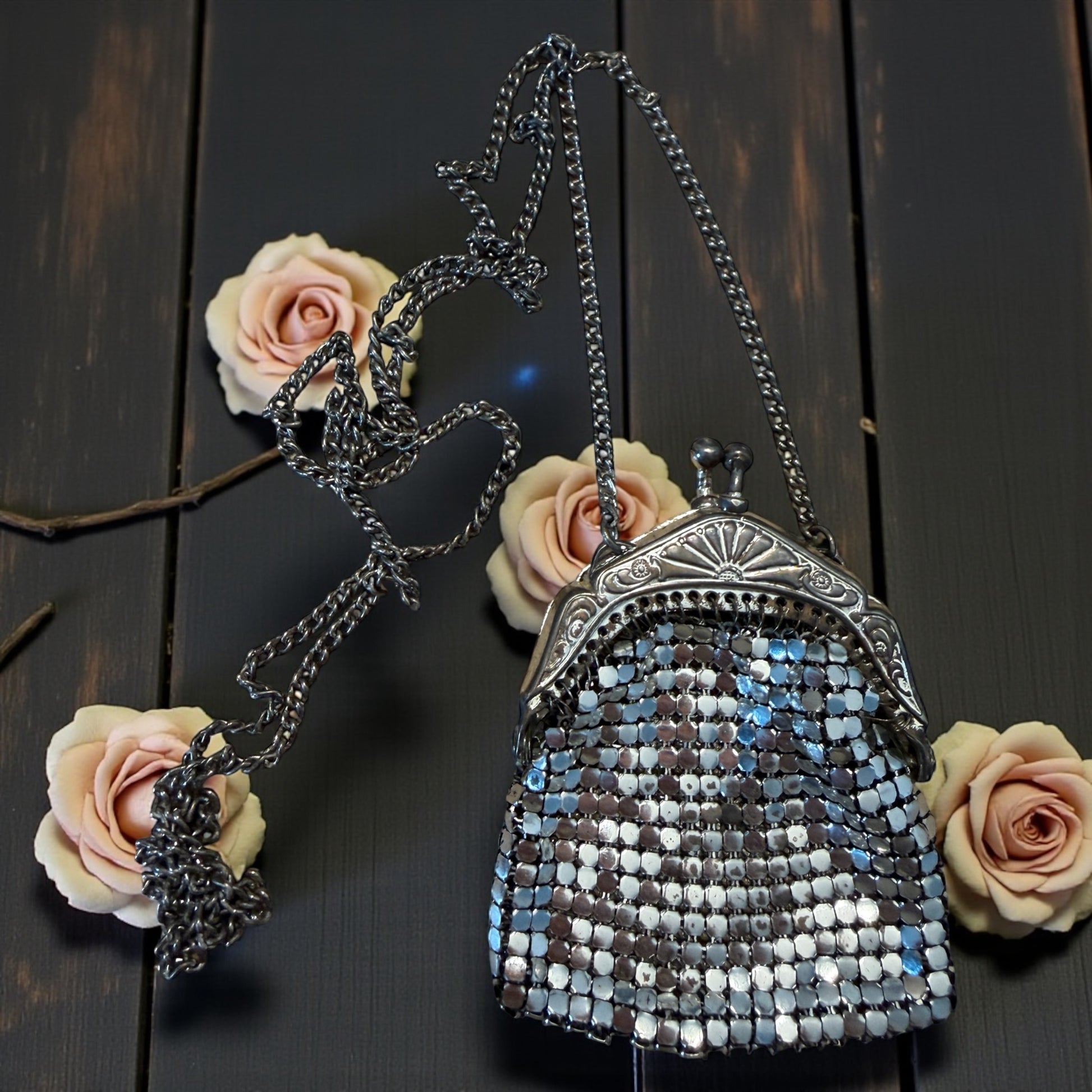 Borsellino con catena da collo, art déco maglia metallica argentata anni ‘30-‘40