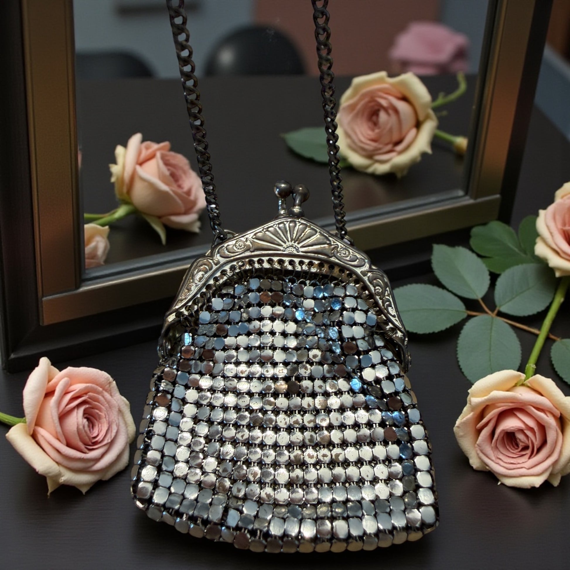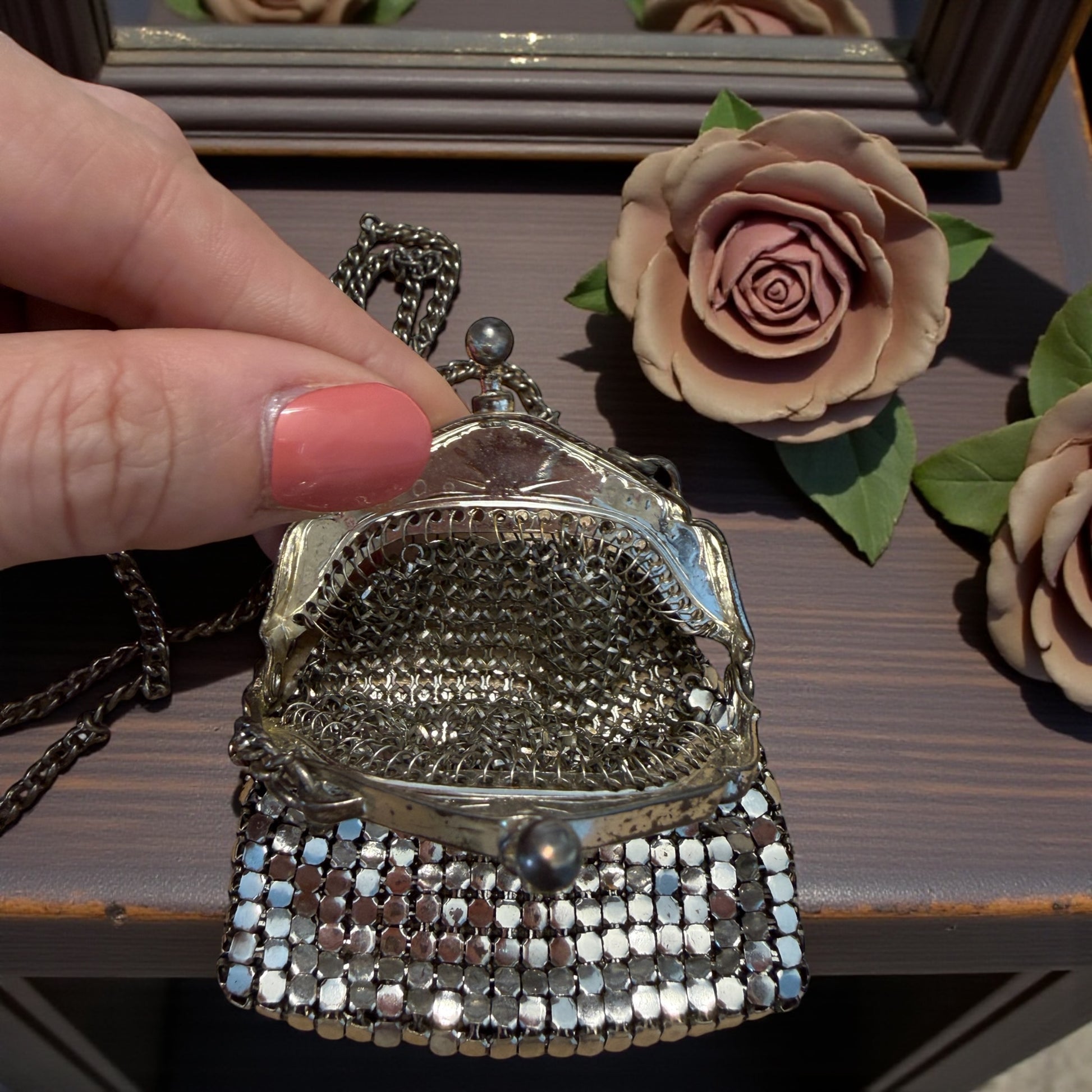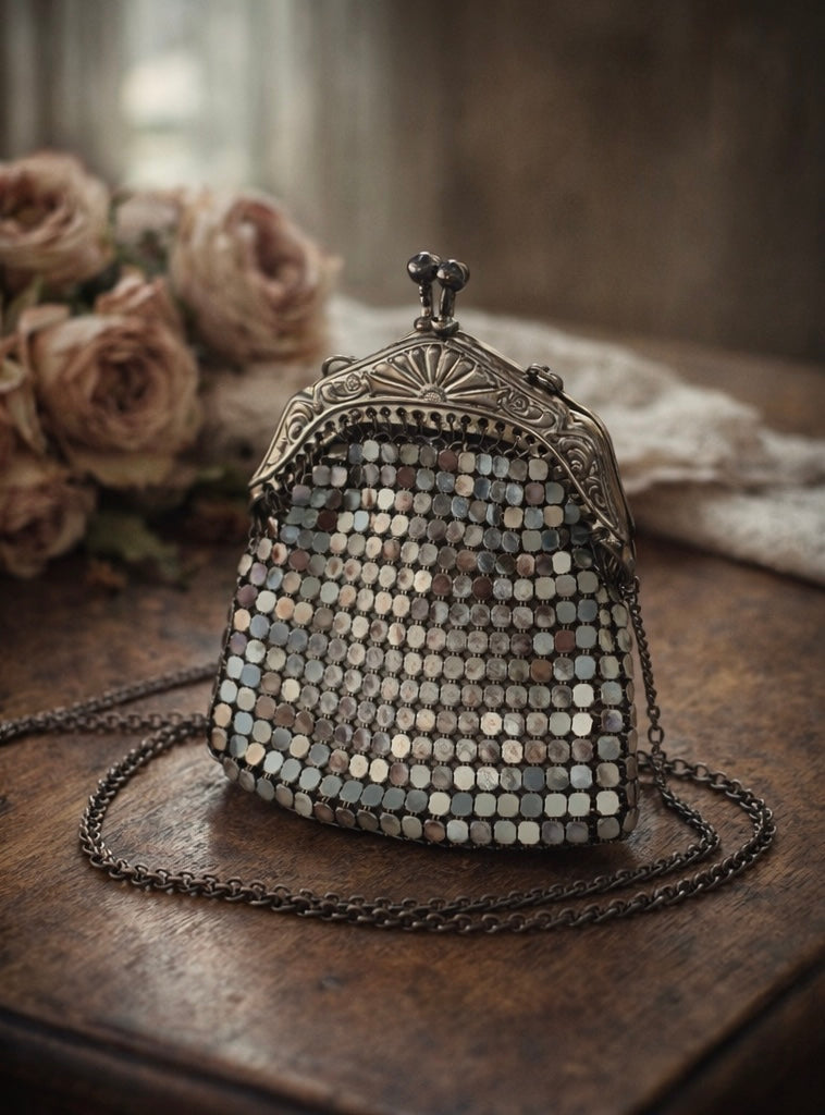 Non serviva una borsa. Bastava questo. C’era un tempo in cui l’essenziale si portava al collo, vicino al cuore. Un piccolo borsellino in maglia metallica argentata, compatto, luminoso, con una montatura decorata da un elegante motivo a ventaglio in pieno gusto Art Déco.