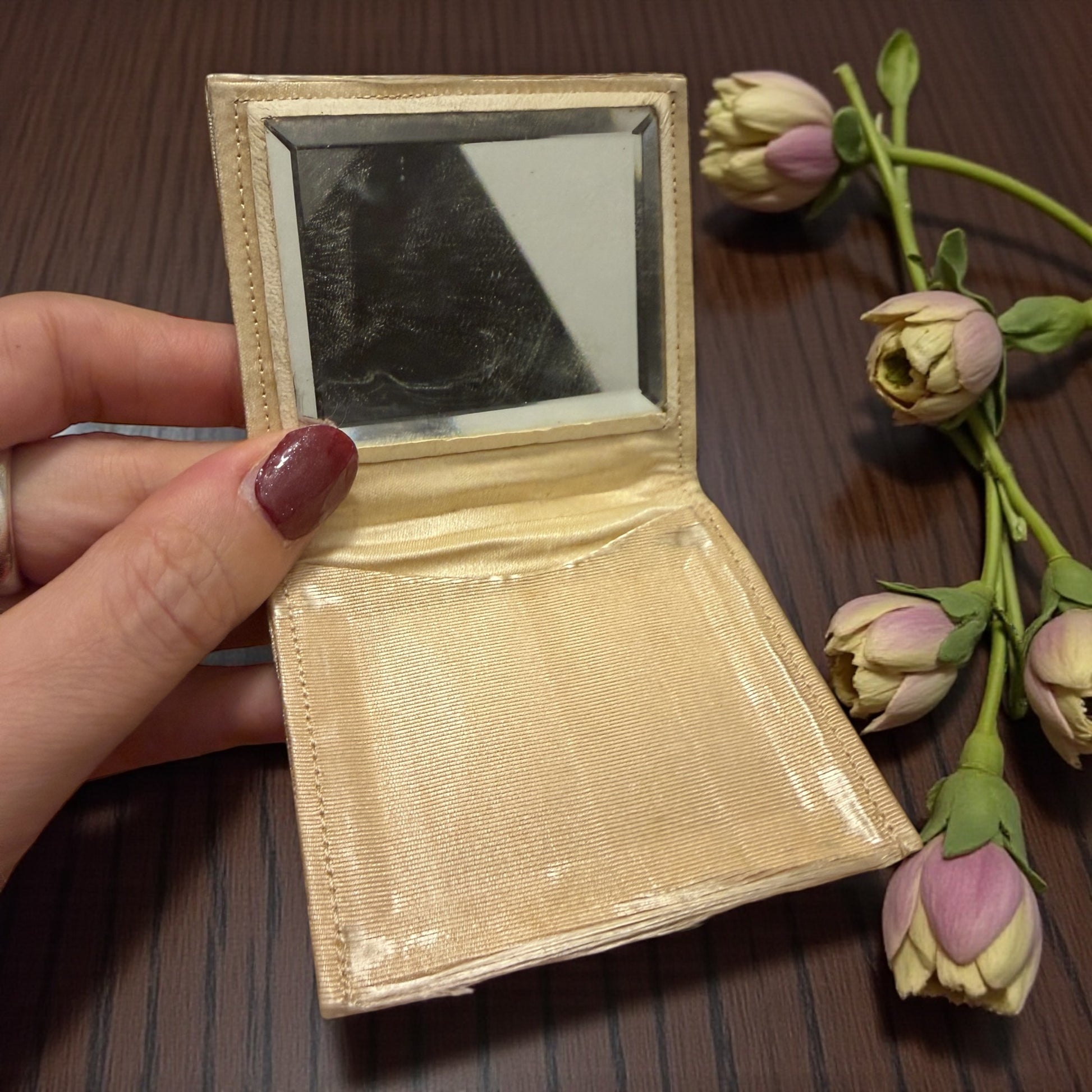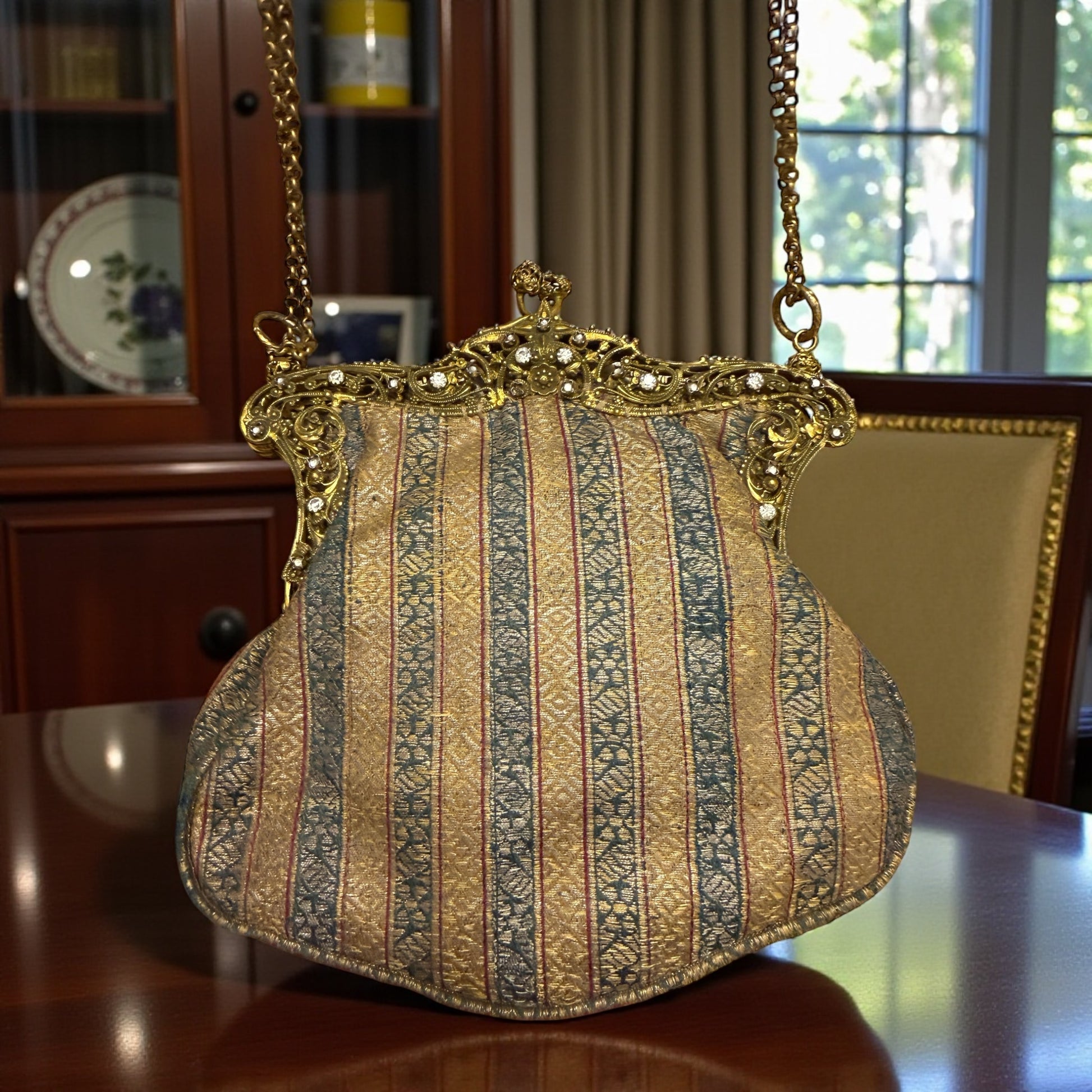 È il tipo di borsetta che racconta una sera precisa: luci basse, abito lungo, mani guantate. Il broccato cattura la luce senza ostentarla, mentre la montatura dorata disegna un confine netto tra funzione e ornamento. Aprirla significa ritrovare gesti d’altri tempi: lo specchietto, la taschina interna, la catenella che cade morbida. È un accessorio autentico del primo Novecento, arrivato fino a oggi in condizioni sorprendentemente integre. Un solo strass mancante, come una piccola pausa nella sua storia, che non ne intacca l’eleganza. Completa il tutto anche il piccolo porte-monnaie originale e coordinato sempre custodito all’interno. Una chicca per tornare indietro nel tempo.