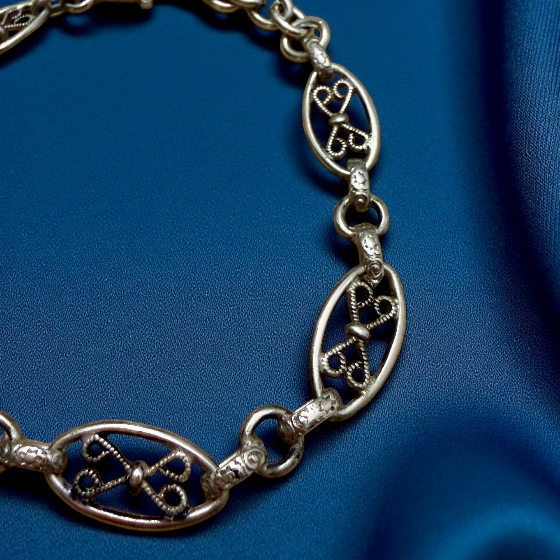 Bracciale in argento con moschettone moderno e antica catena da panciotto (1890–1910). Lunghezza totale: 21 cm, regolabile da 18 cm. Peso: circa 11 g. Lavorazione traforata con decorazioni a filo ritorto e granulazione. Anellini decorati, lavorazione fine.