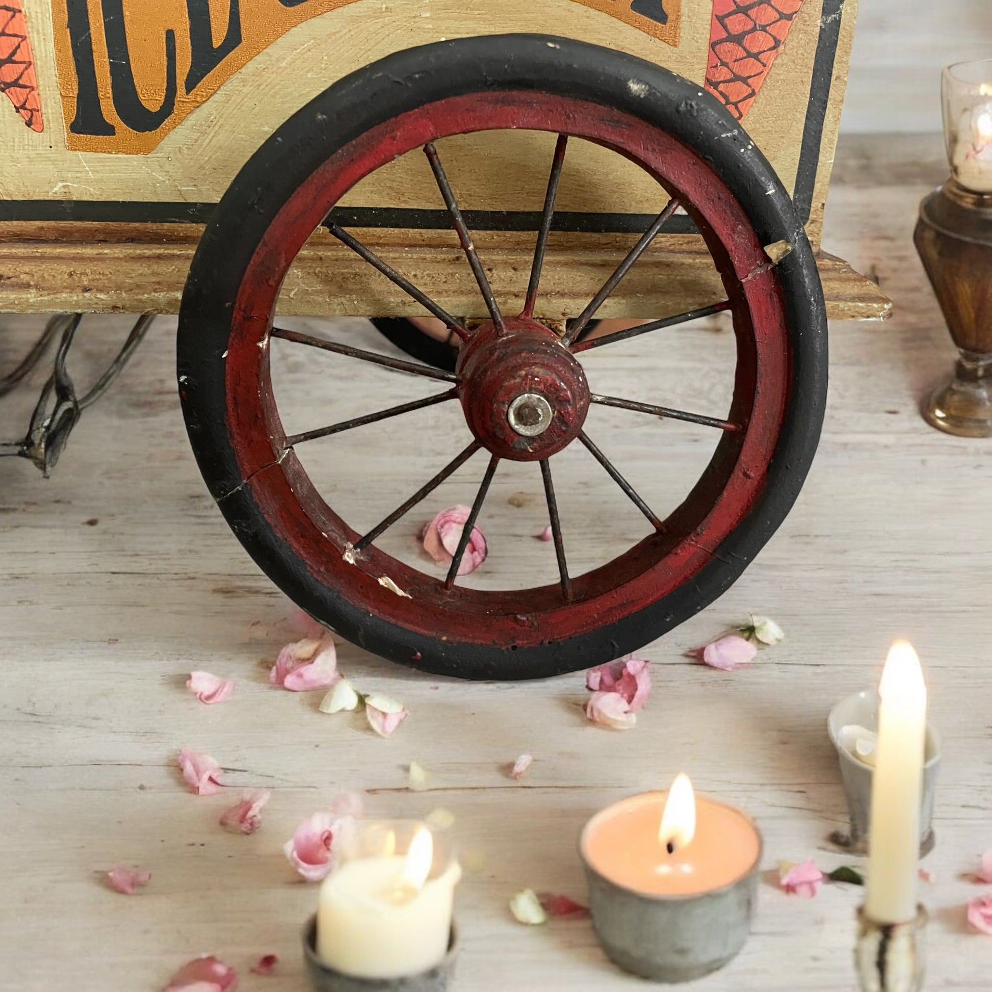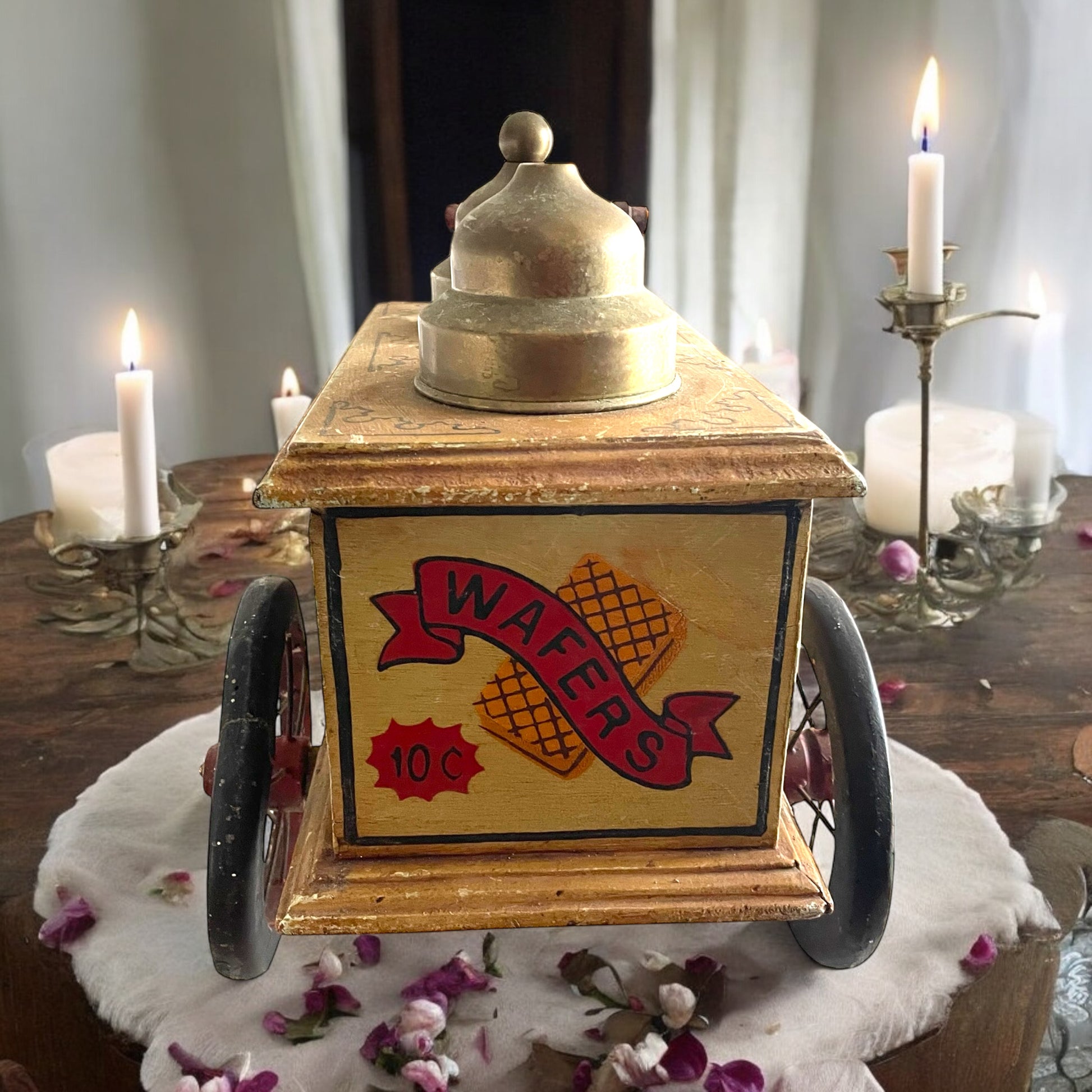 Le ruote cigolavano appena, i coperchi in ottone luccicavano al sole immaginato, e ogni passante — mamma, nonno, la sorella maggiore — era un cliente da servire con grande serietà. Questo piccolo carretto in legno dipinto, con le sue scritte colorate e le decorazioni fatte a mano, non era solo un giocattolo. Era un portale. Prodotto probabilmente negli anni ’50, quando ancora si costruiva con le mani e non con le macchine, quando ogni pezzo — pur non essendo unico — portava con sé l’impronta di chi l’aveva creato. Il tempo ha lasciato qualche segno; una ruota è stata riparata e manca un pomolo ad una delle campane. Rimane stupendo; per una collezione o per un allestimento vetrina. Le dimensioni sono: 40 x 39 x 30 cm.