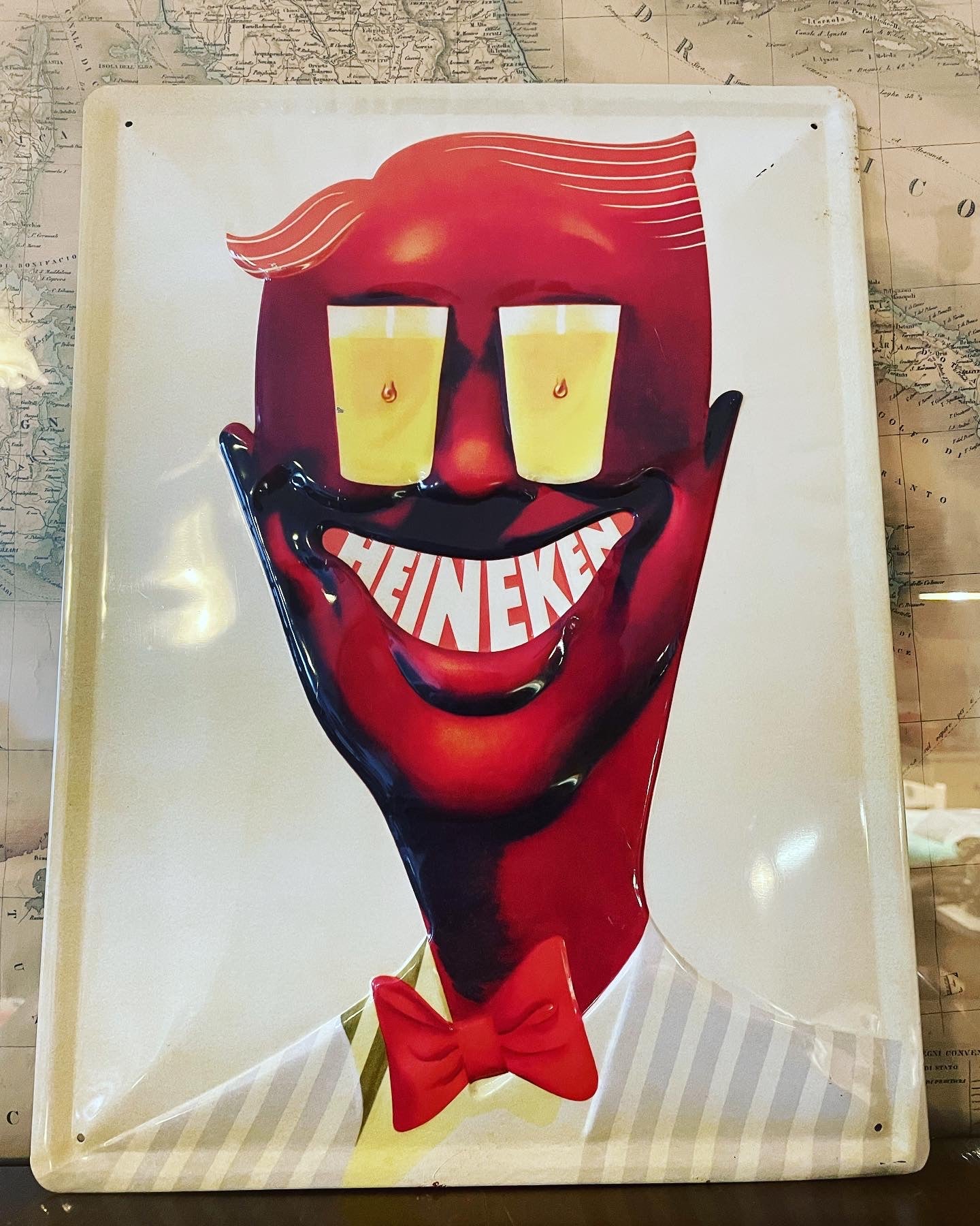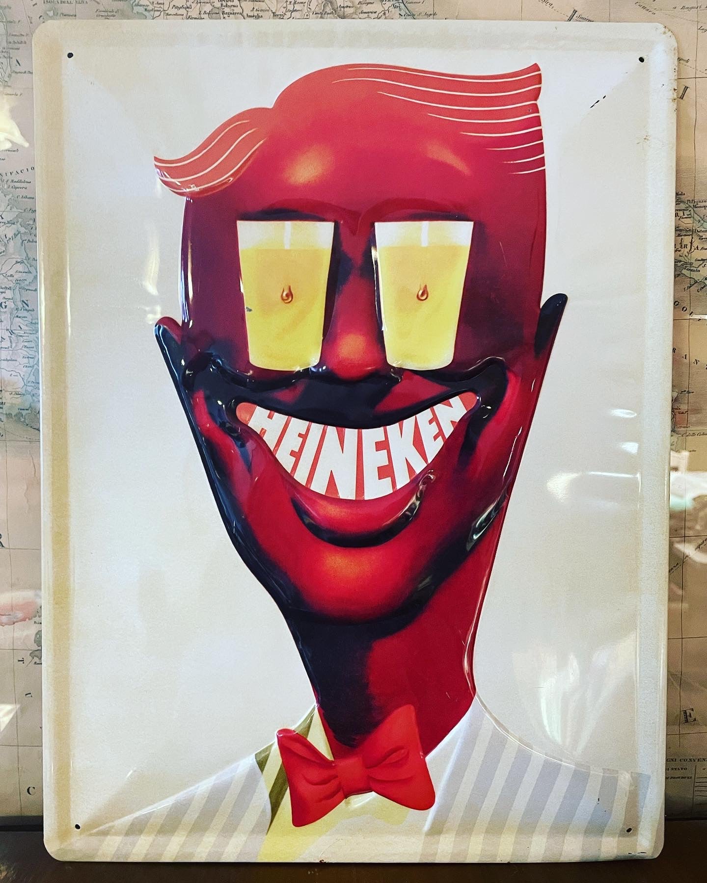 Ecco il mitico #charlie della #pubblicità della #birra #heineken ! Un’opera pubblicitaria per mano dell’ artista Frans Mettes che inventò il disegno di Charlie nel 1951. La prima pubblicità Heineken in materiale metallico fu prodotta nel 1966. Questa #tabella #vintage ha qualche #segnodeltempo e risale agli #anni90 . Ca kg 4 misure 40 x 30 cm, #design stupendo.