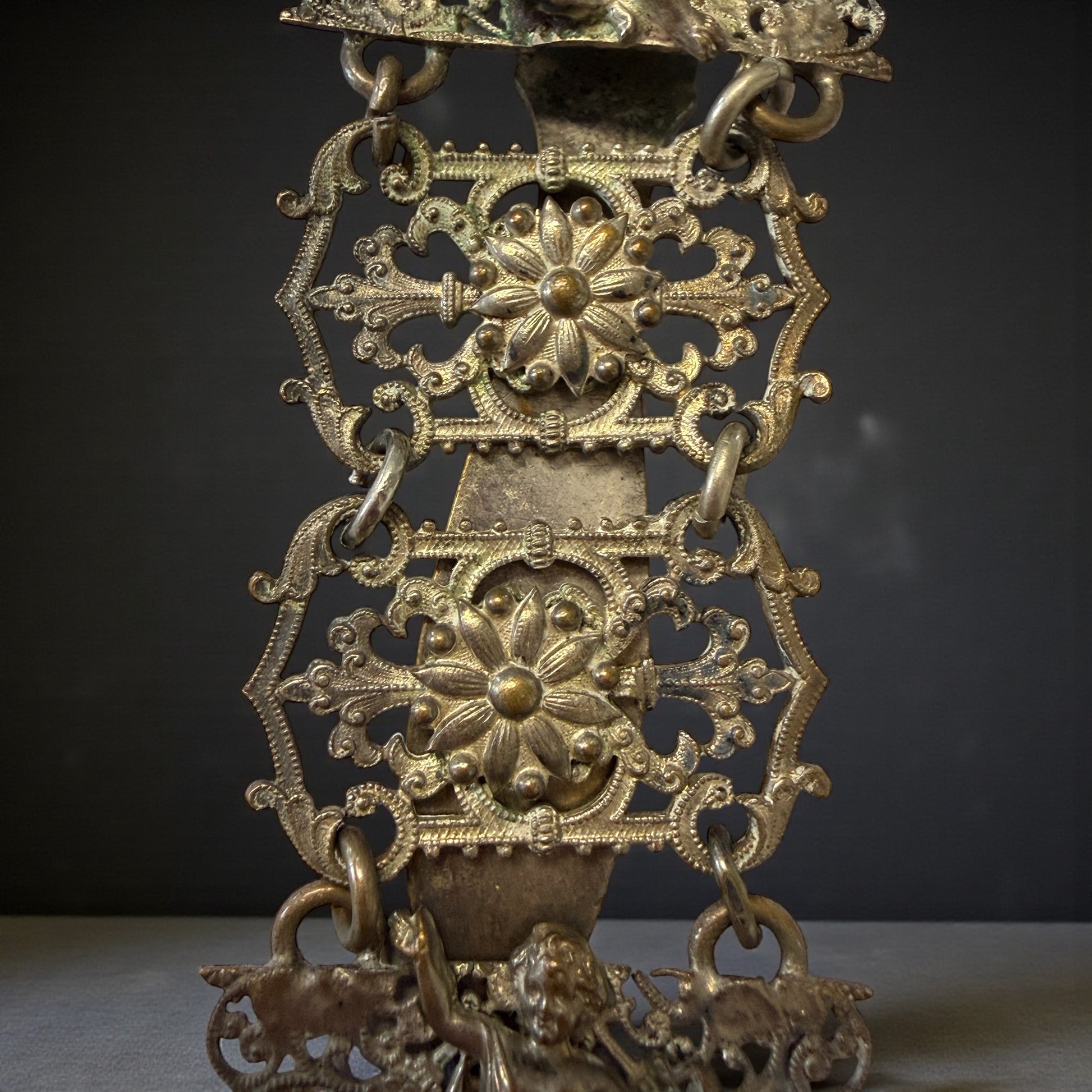 Chatelaine da reggicalze primitivo / accessorio intimo storico. Materiale: lega metallica. Tecnica: fusione con traforo ornamentale. Decoro: putti danzanti, rosette floreali. Epoca stimata: fine XIX – inizi XX secolo (circa 1880–1910). Stato: buono con ossidazioni e piccole usure coerenti con l’età. Particolarità: rarità tipologica, oggetto poco diffuso sul mercato.