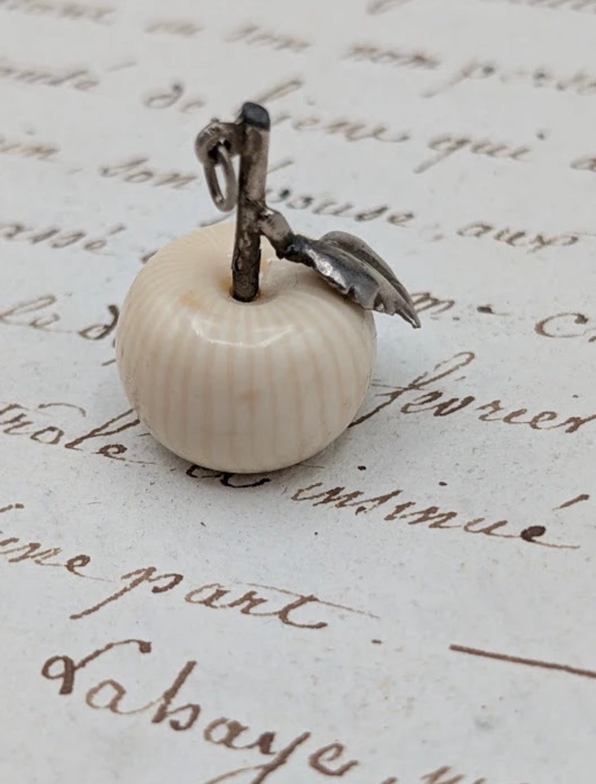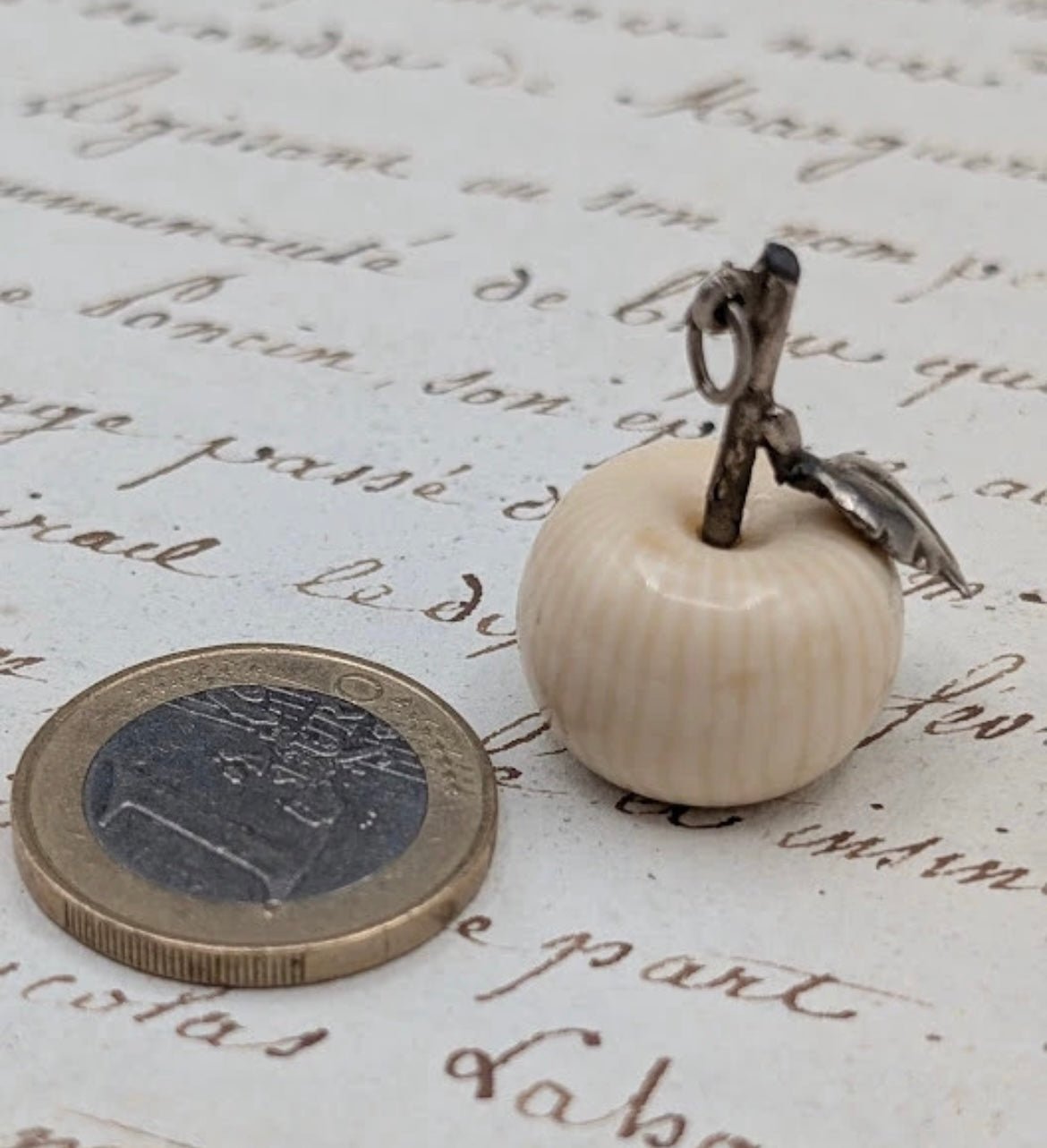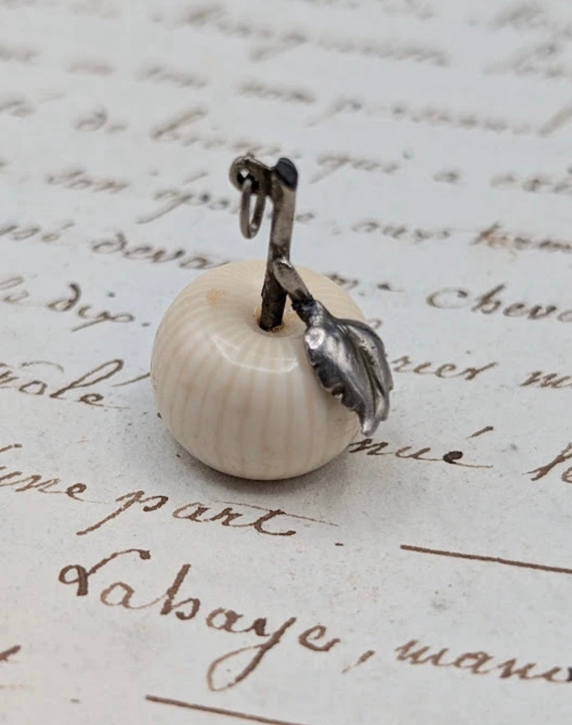 C’era un tempo in cui le cose venivano scelte con cura, e ogni piccolo oggetto custodiva un gesto, un’intenzione. Questo minuscolo ciondolo — scolpito in resina a imitazione dell’avorio, con il suo gambo e la fogliolina cesellati a mano in metallo argentato — viene da lì: dagli anni ’40, quando i doni erano promesse sussurrate e la bellezza si nascondeva nei dettagli più minuti. A forma di mela, simbolo universale di desiderio, conoscenza e femminilità, questo gioiellino racconta silenziosamente una storia d’amore e d’attesa, appesa a una catenina sottile, regalata con un sorriso timido. Oggi può essere tua. Per ricordarti che sei tu a scegliere ogni giorno quale significato dare alle cose. Da indossare vicino al cuore, o da regalare a qualcuno che ami profondamente.
