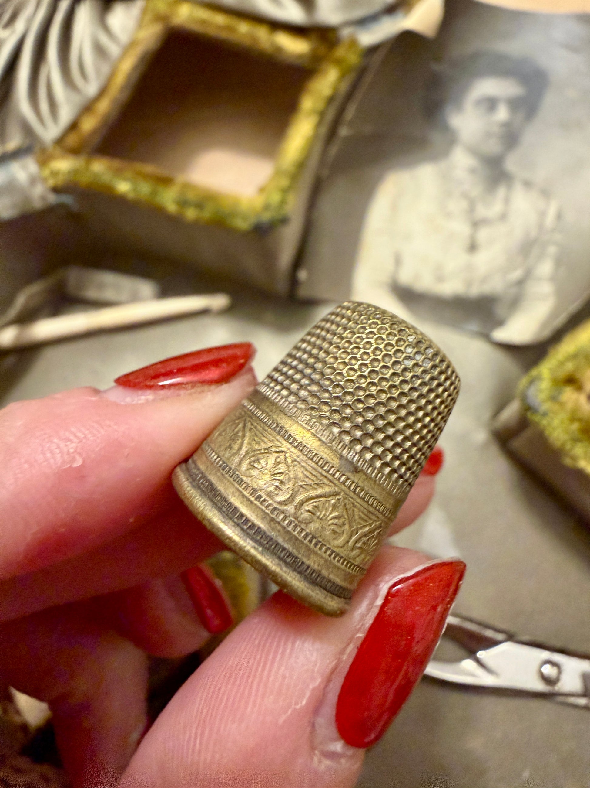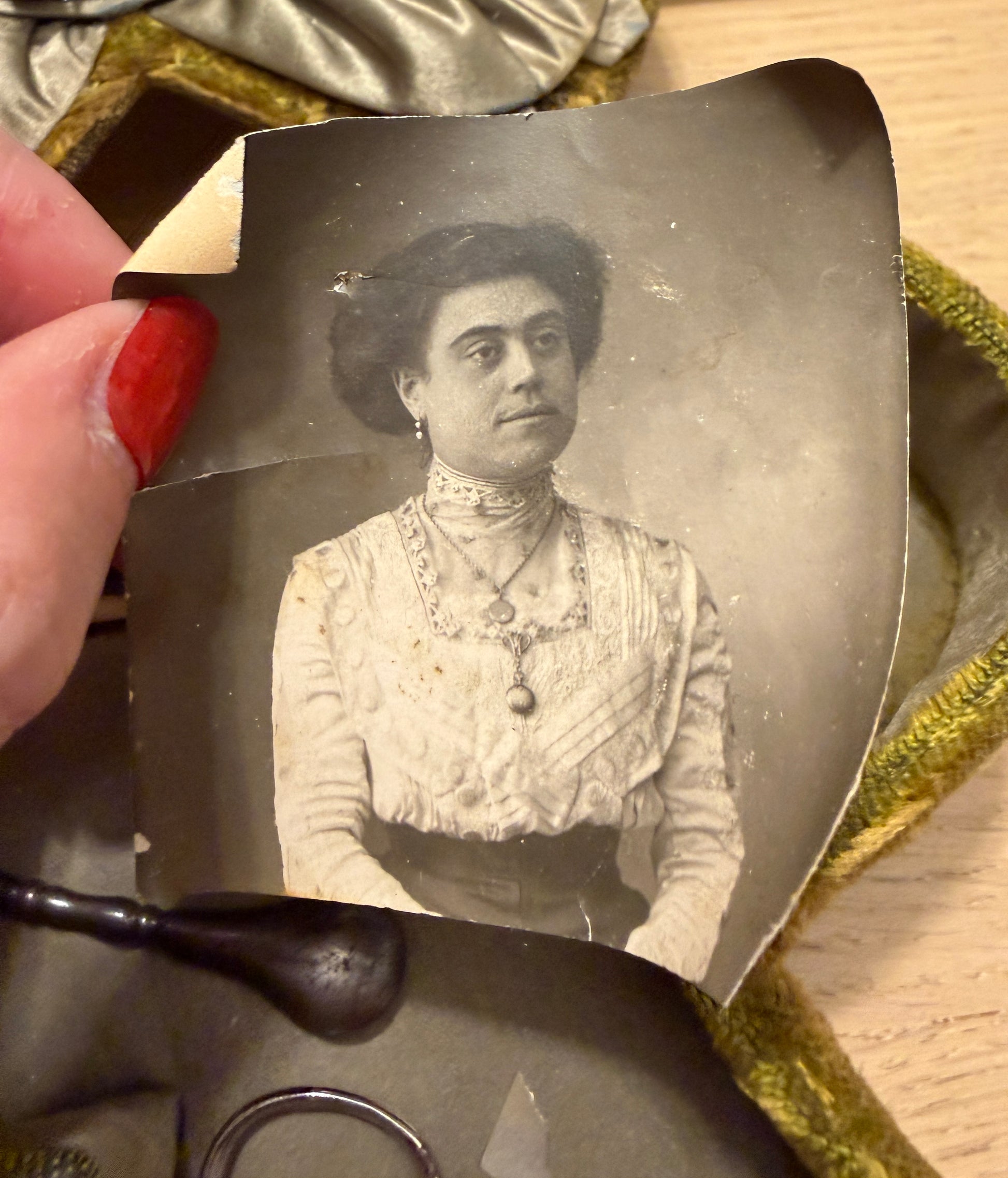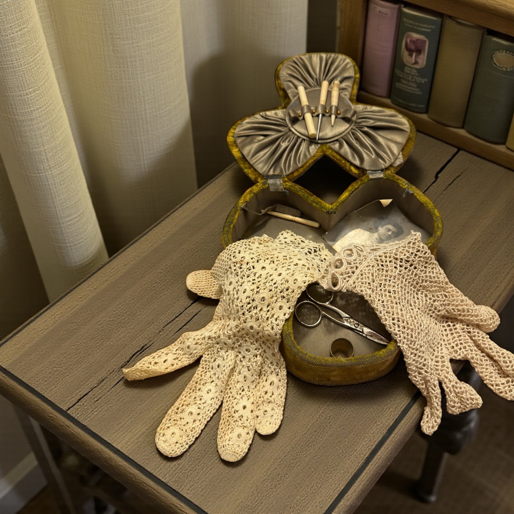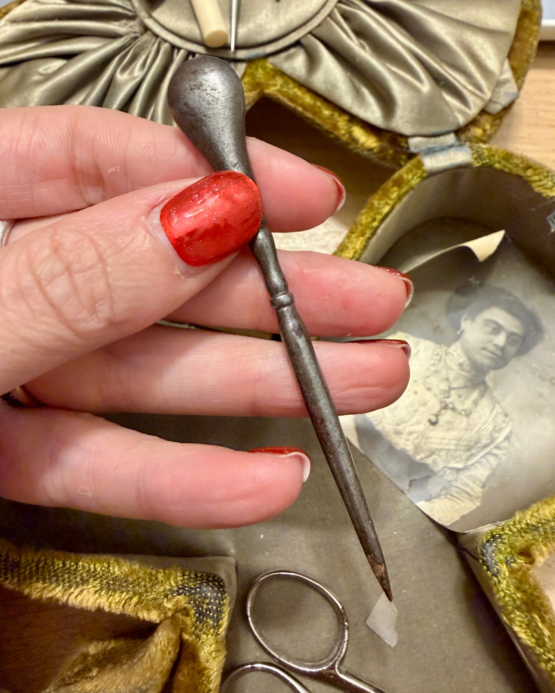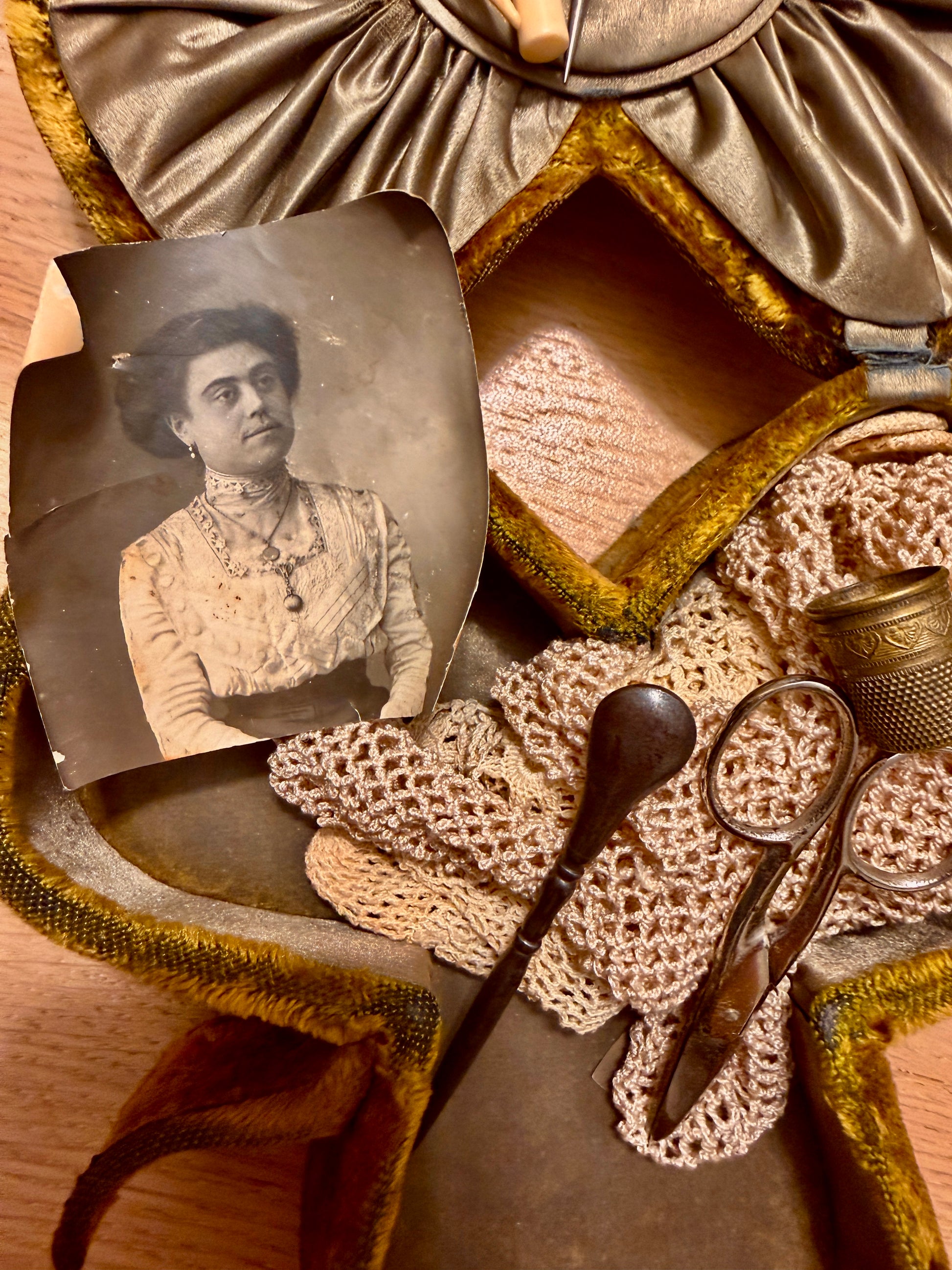 Una volta aperto, questo cofanetto non mostra oggetti: mostra una vita. Le mani che lo hanno usato sapevano dove trovare ogni cosa, senza cercare. Il velluto ricamato custodisce strumenti da lavoro fine, pizzi, aghi, piccoli utensili in osso. Dentro c’è un ordine silenzioso: il ditale ben inciso, il punteruolo in acciaio scurito, i rulli per il filo, il porta-aghi che si apre come un segreto. C’è anche uno strumento meno immediato, con un piccolo uncino: serviva per recuperare punti, sistemare pizzi, rimediare con pazienza. Accanto agli strumenti, una fotografia antica osserva senza parlare. Non sappiamo chi sia, ma sappiamo che era importante. E poi ci sono i due guanti fatti a mano, diversi l’uno dall’altro, ma entrambi in ottime condizioni: fatti a mano e lavorati meravigliosamente, forse il ricordo di bimbe… Questo non è un oggetto da esposizione ma da respirare. È un oggetto che ha avuto un ritmo, un tempo, una costanza. E li conserva ancora.