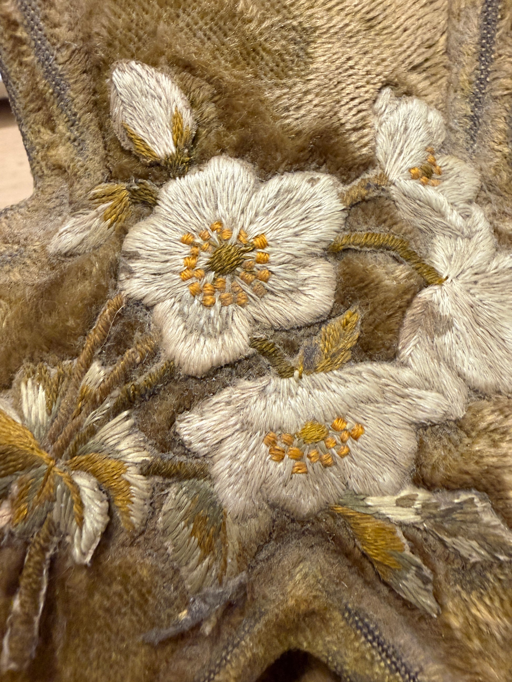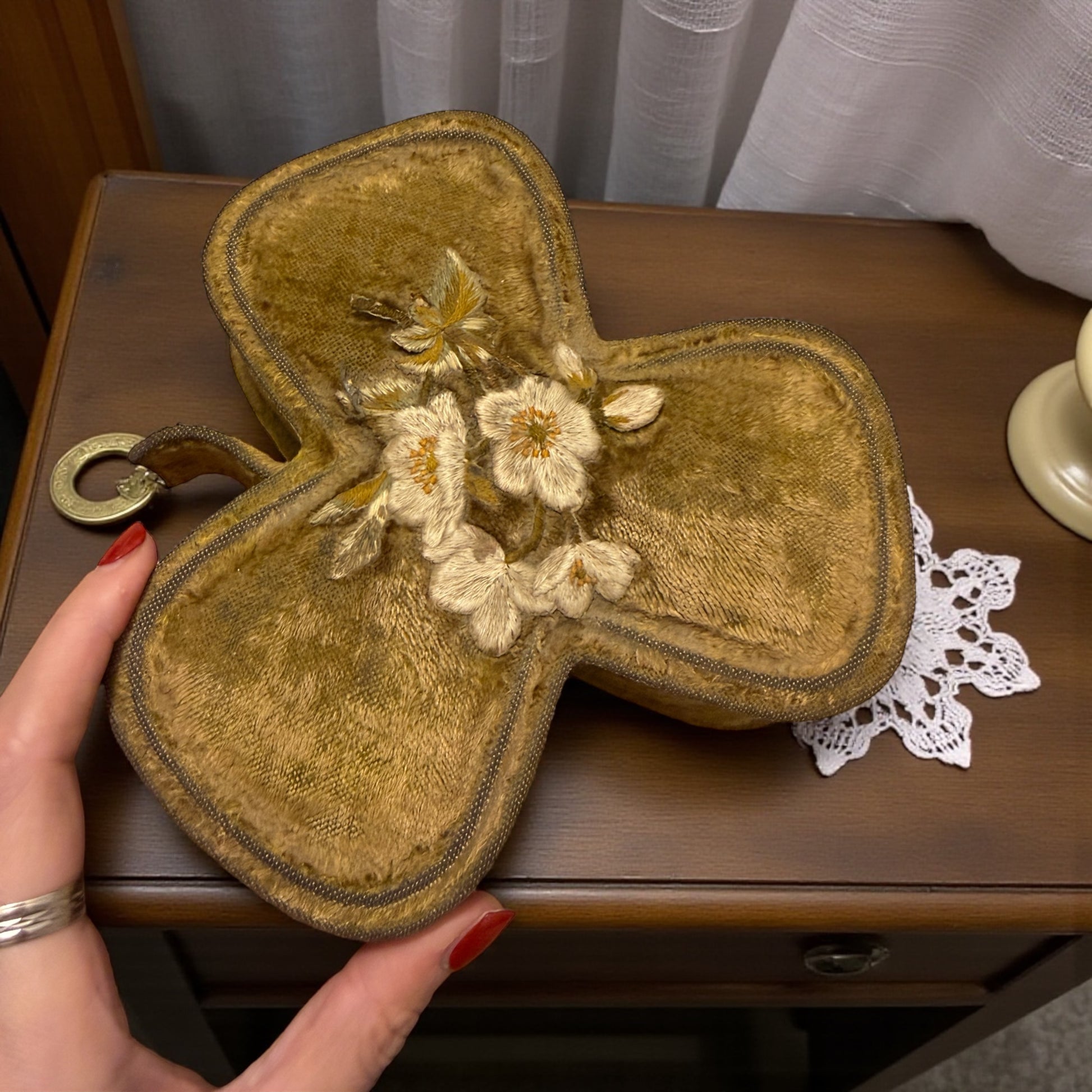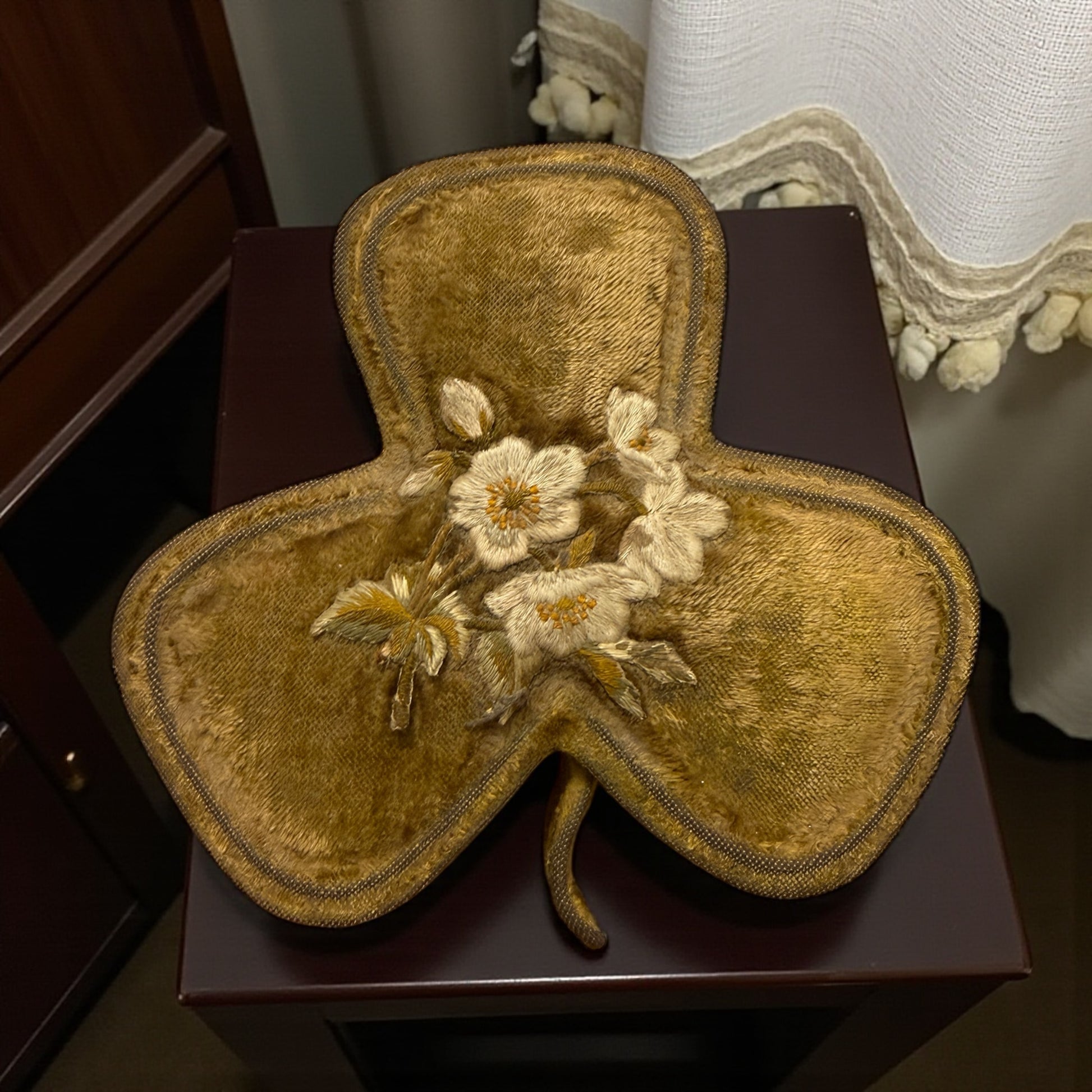 Cofanetto da cucito in velluto ricamato, struttura rigida a forma di trifoglio. Epoca stimata: primo Novecento (1900–1925) Rivestimento esterno in velluto con ricamo floreale in filo di seta