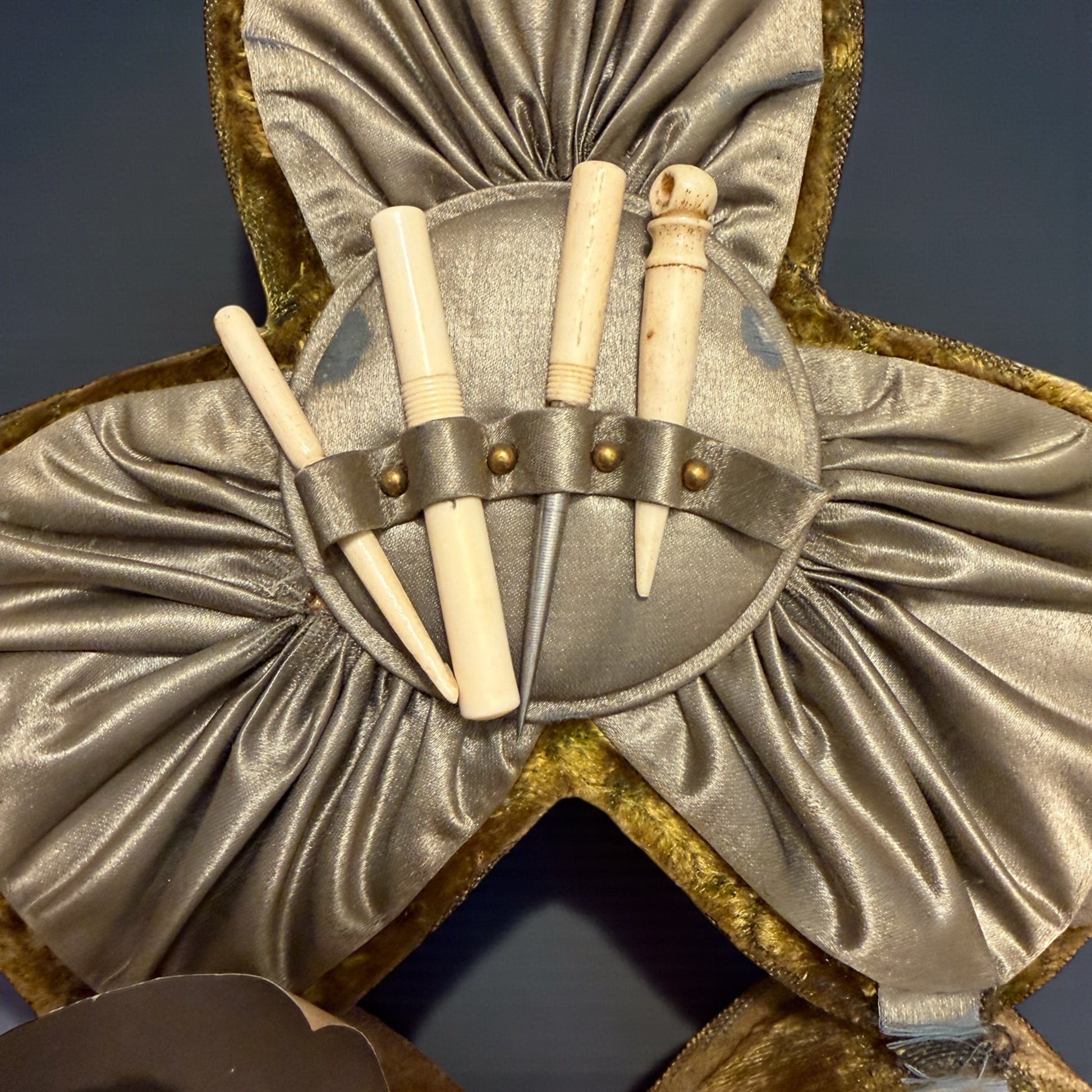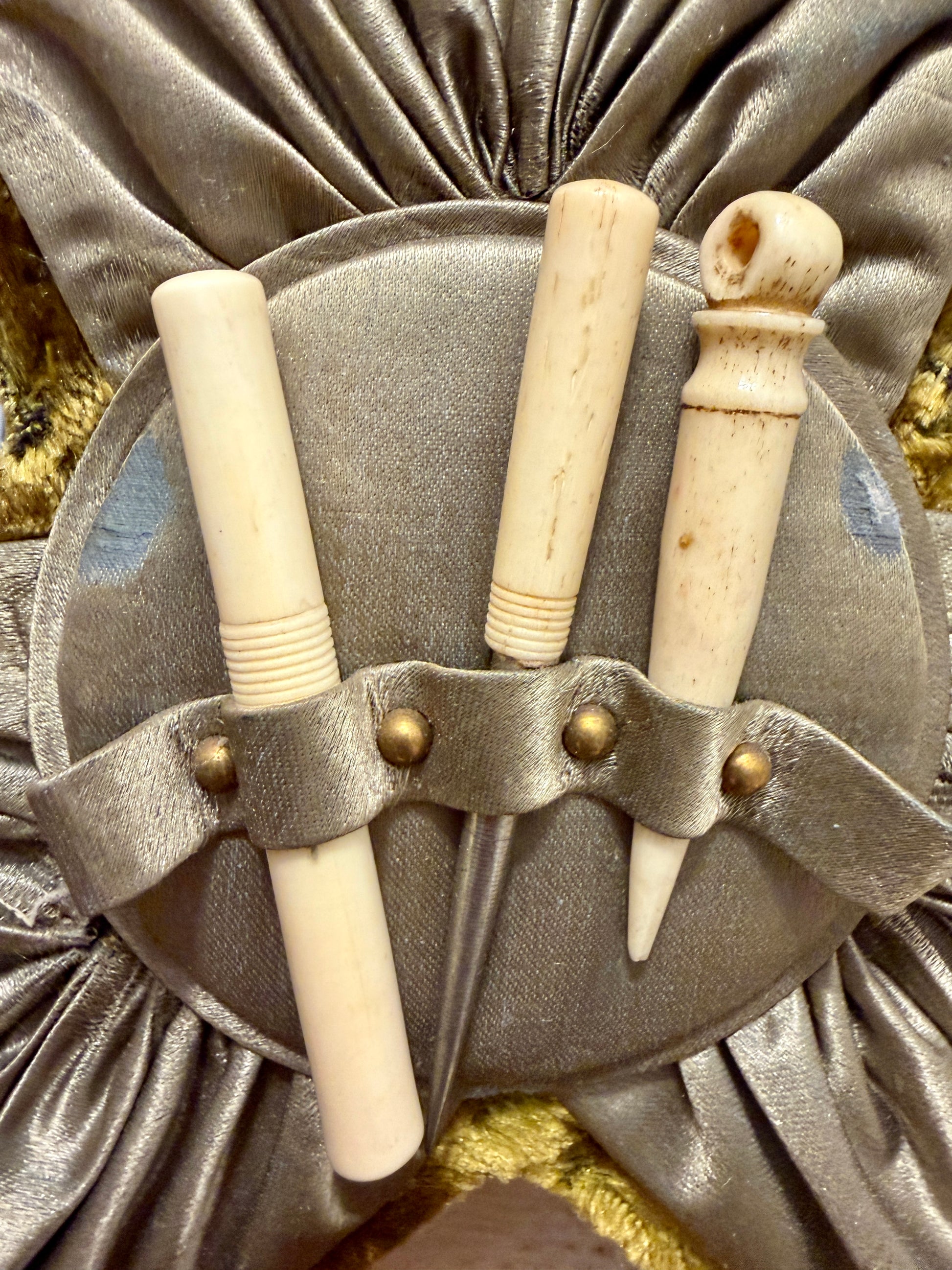 – quattro strumenti in osso: due rulli porta-filo, un porta-aghi apribile, uno strumento da pizzo con uncino